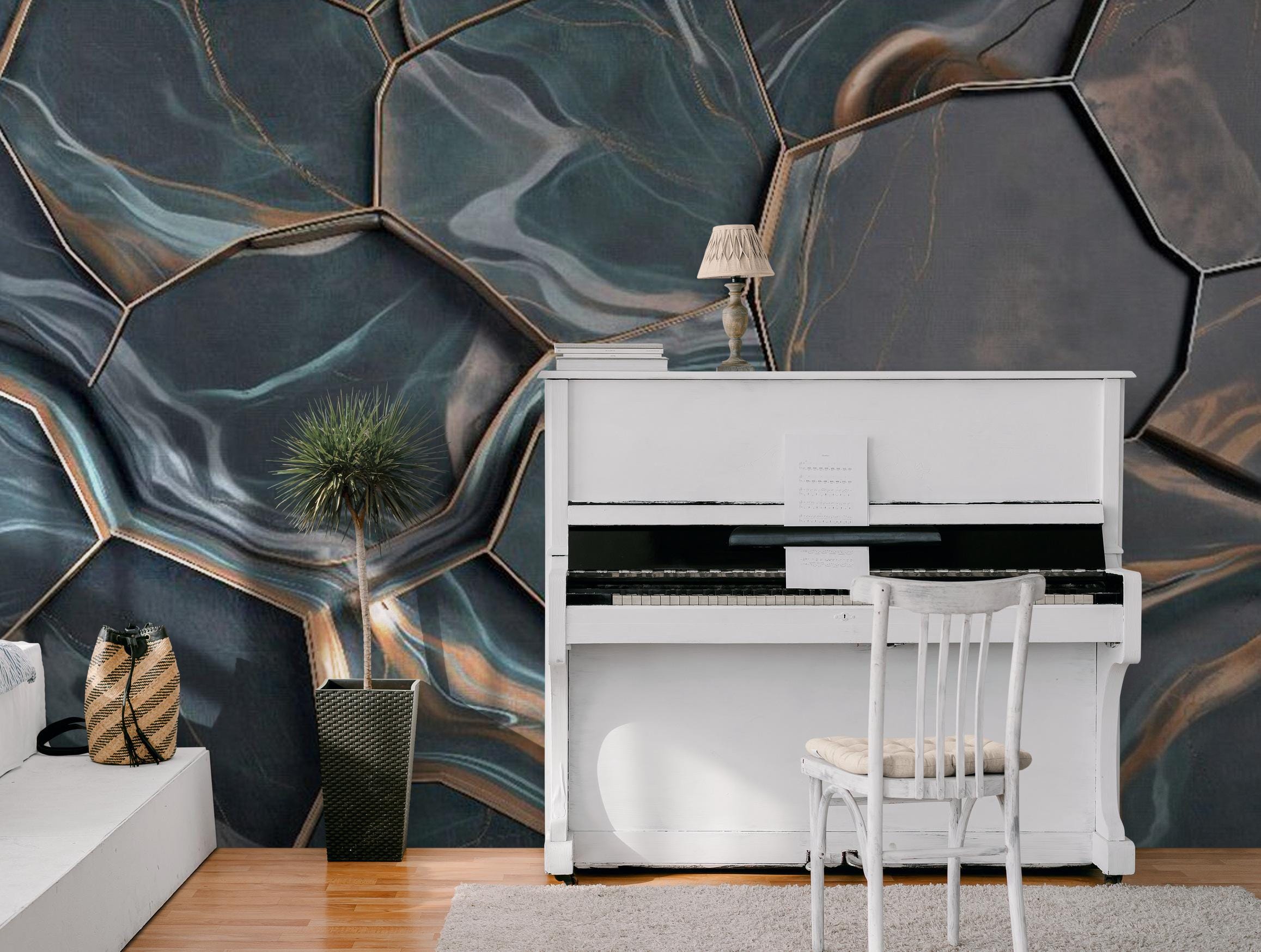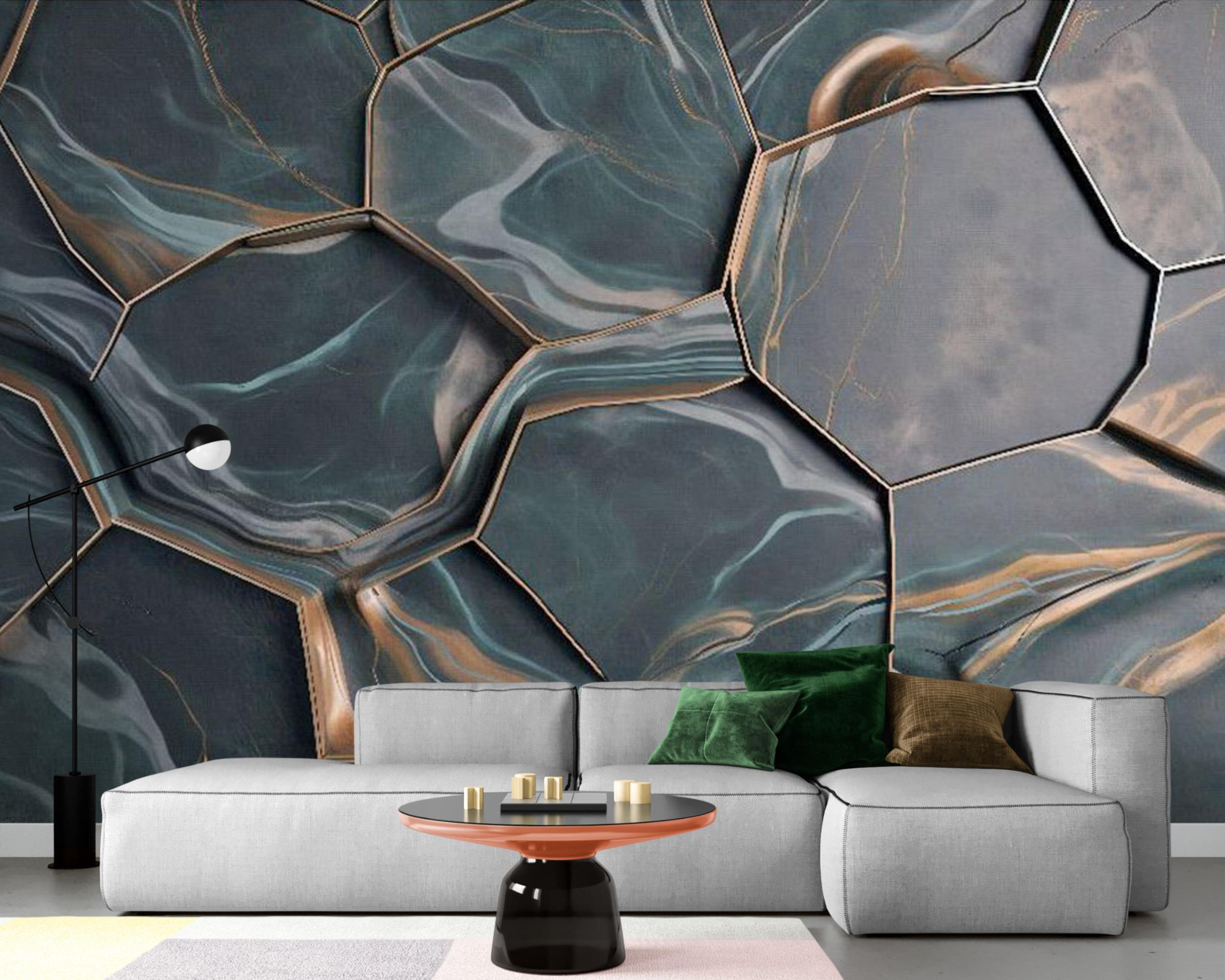 Bring dramatic dimension to your walls with this 3D effect hexagon marble wallpaper. The ultra-realistic photo-style design creates the illusion of depth with textured dark teal, rich gold lines, and beveled geometric shapes. Perfect for modern interiors, this peel and stick mural is easy to apply and remove—ideal for living rooms, offices, or feature walls.