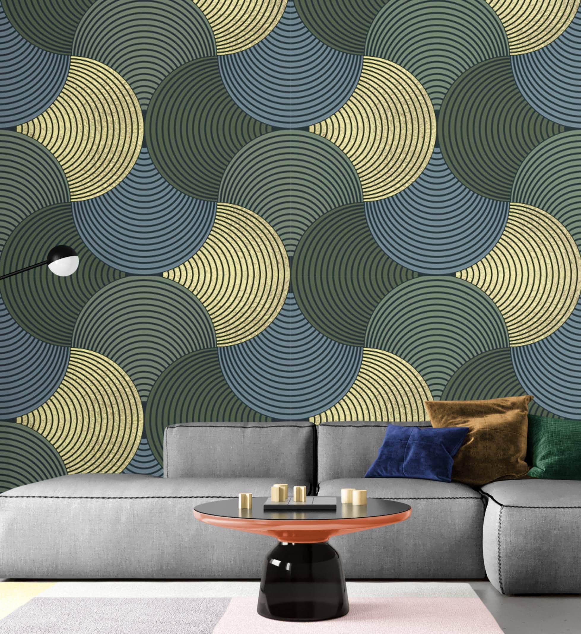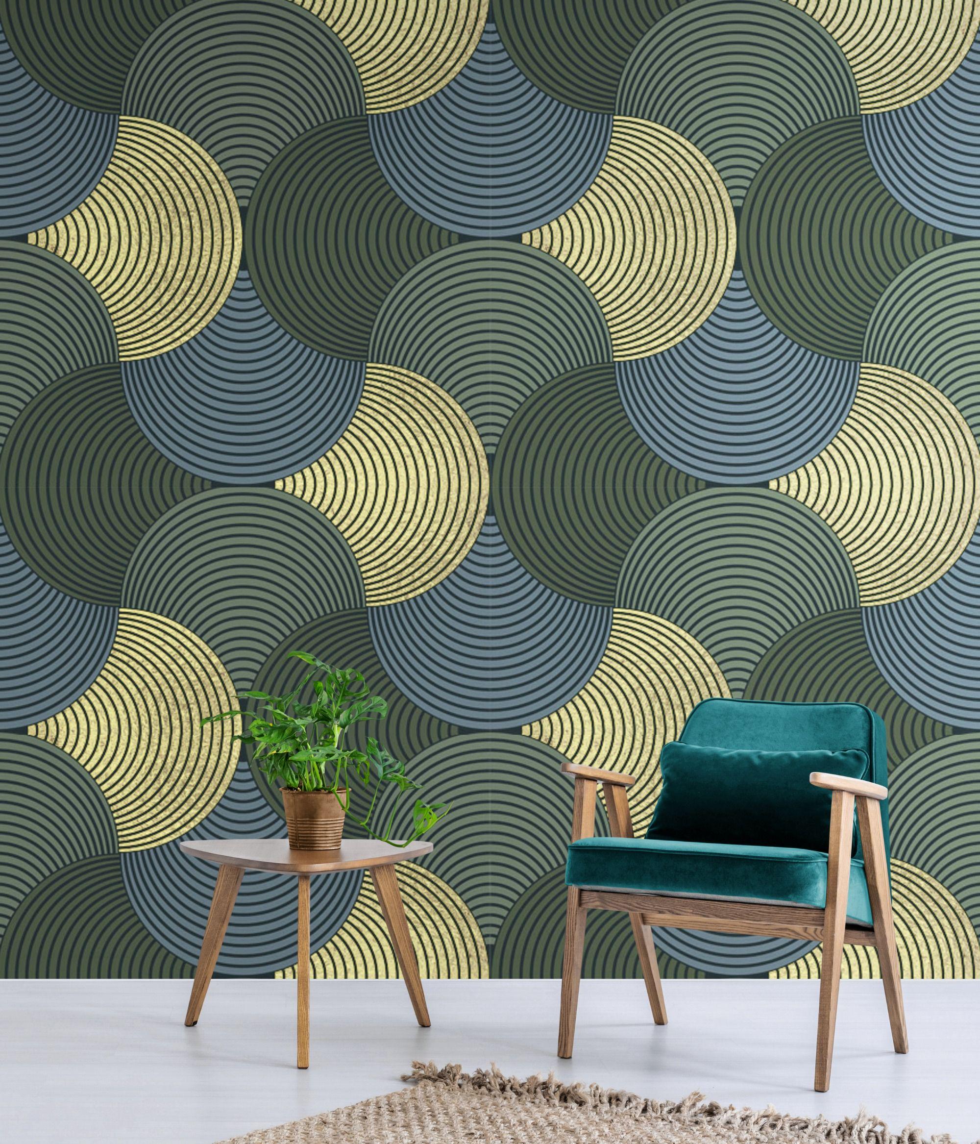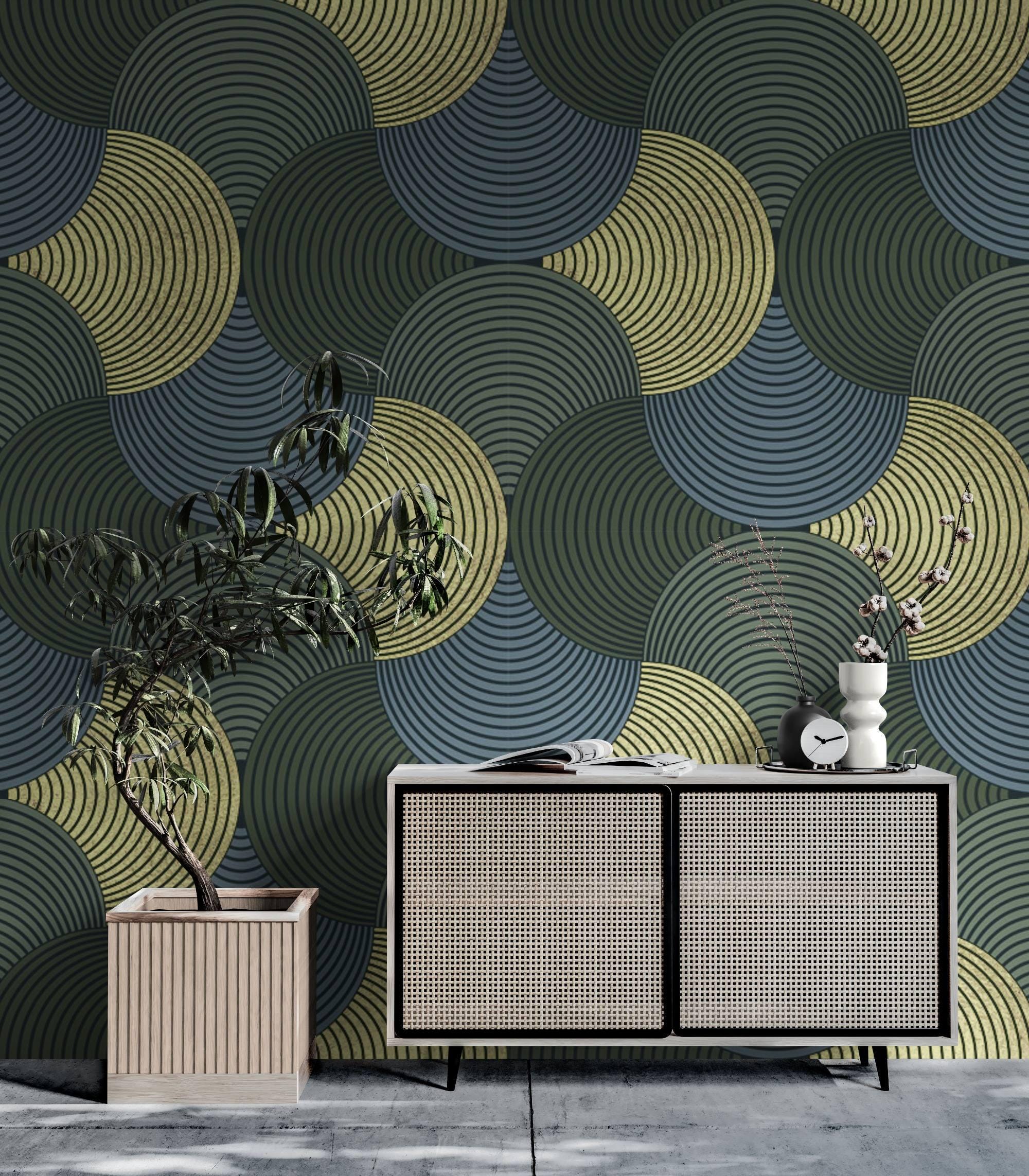 Add a bold, mid-century twist to your space with this retro geometric wallpaper. Featuring overlapping circular patterns in forest green, slate blue, and mustard yellow, the design creates a stunning visual rhythm that instantly elevates living rooms, offices, or creative spaces. Made with high-quality peel and stick material, it's easy to install and perfect for renters or quick updates.