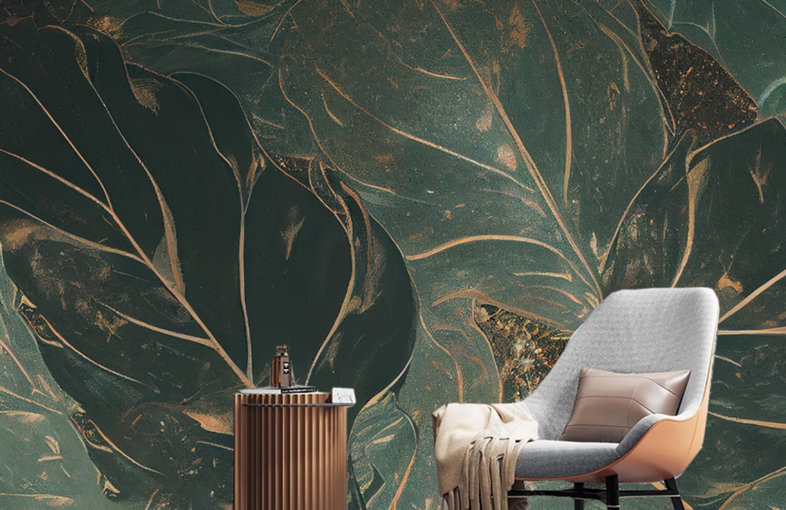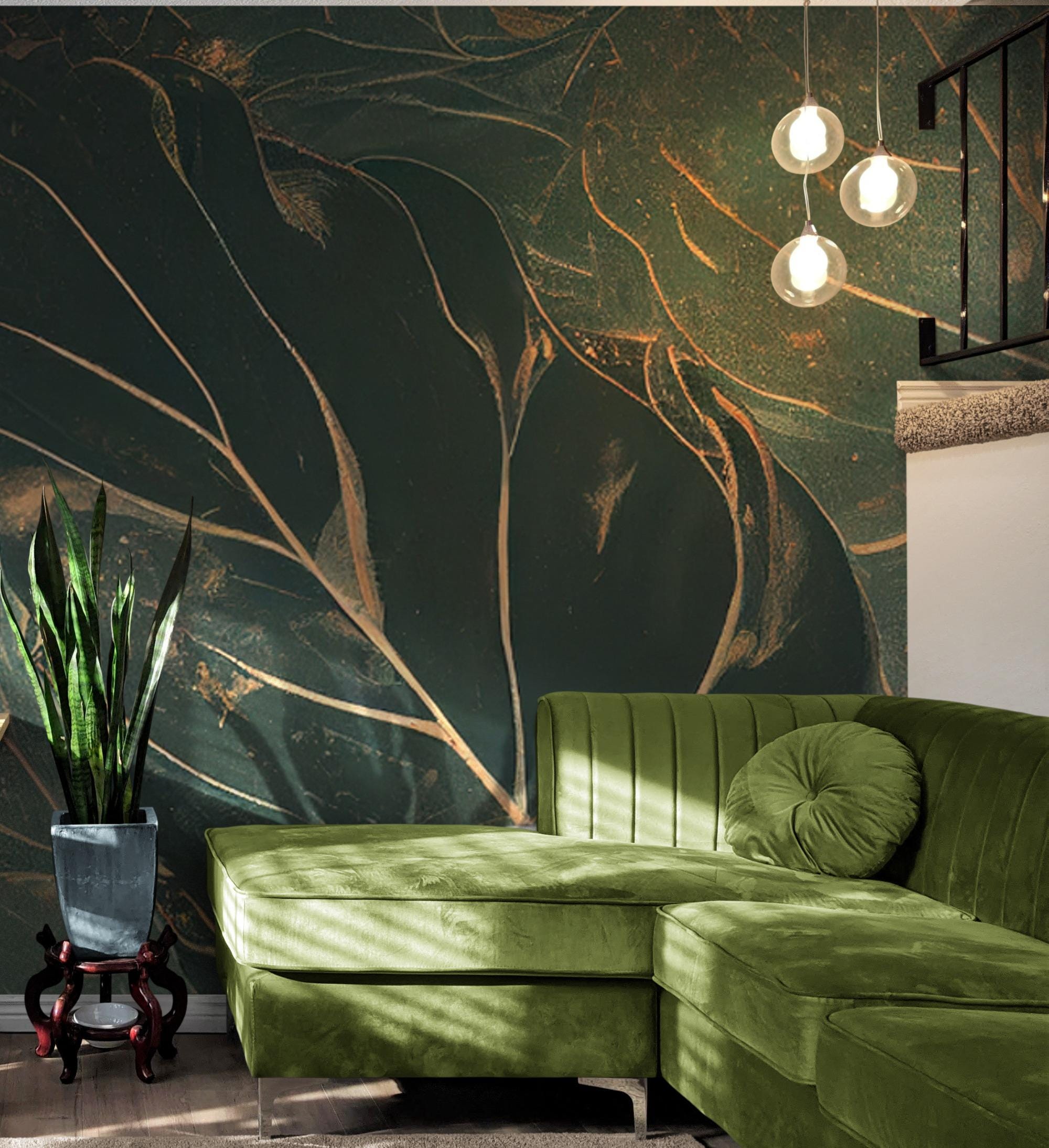 Green Floral Wallpaper Mural, Flower Wall Mural, Gold Botanical Wallpaper, Peel and Stick, Removable Tropical Wallpaper, Gift For Home