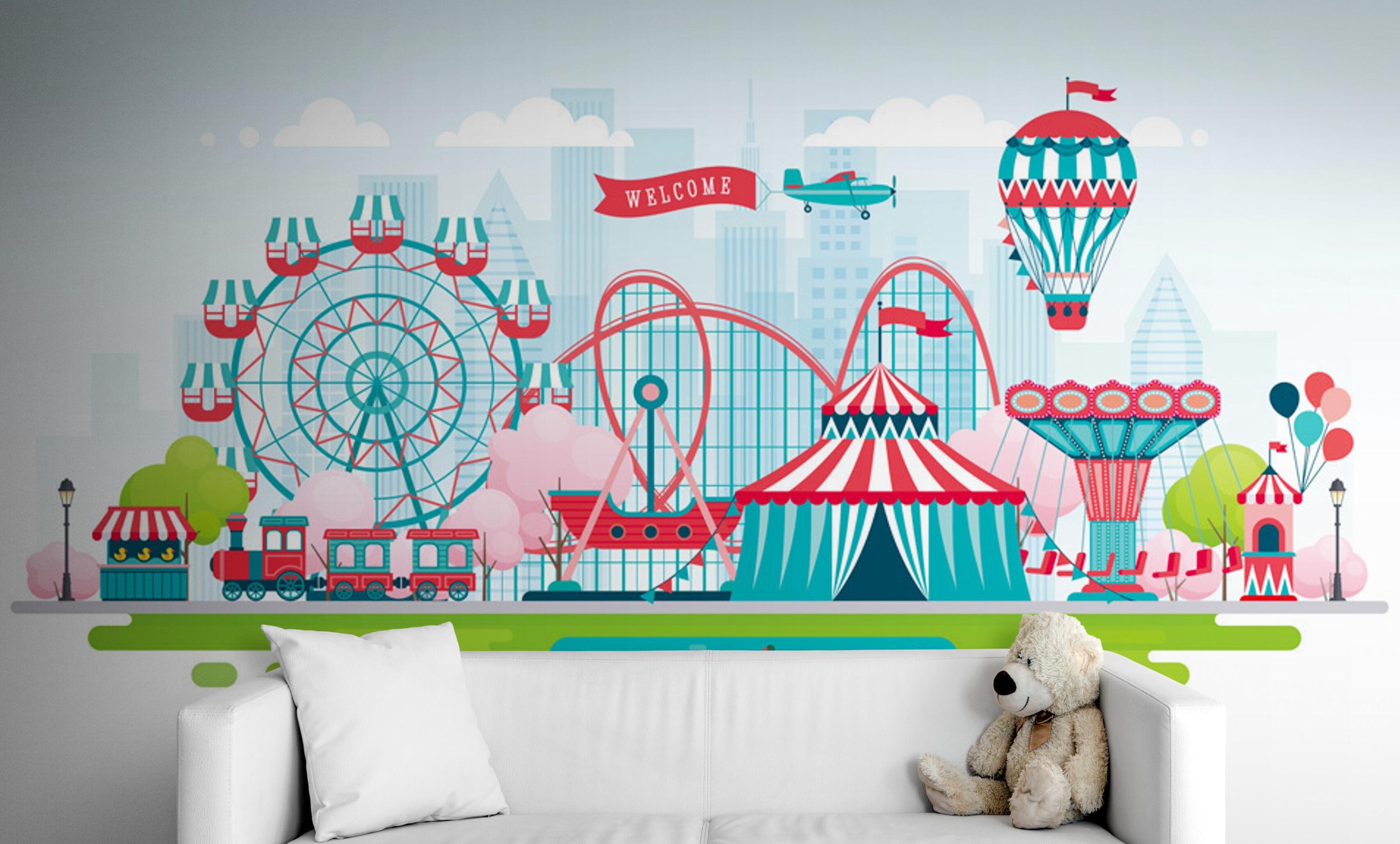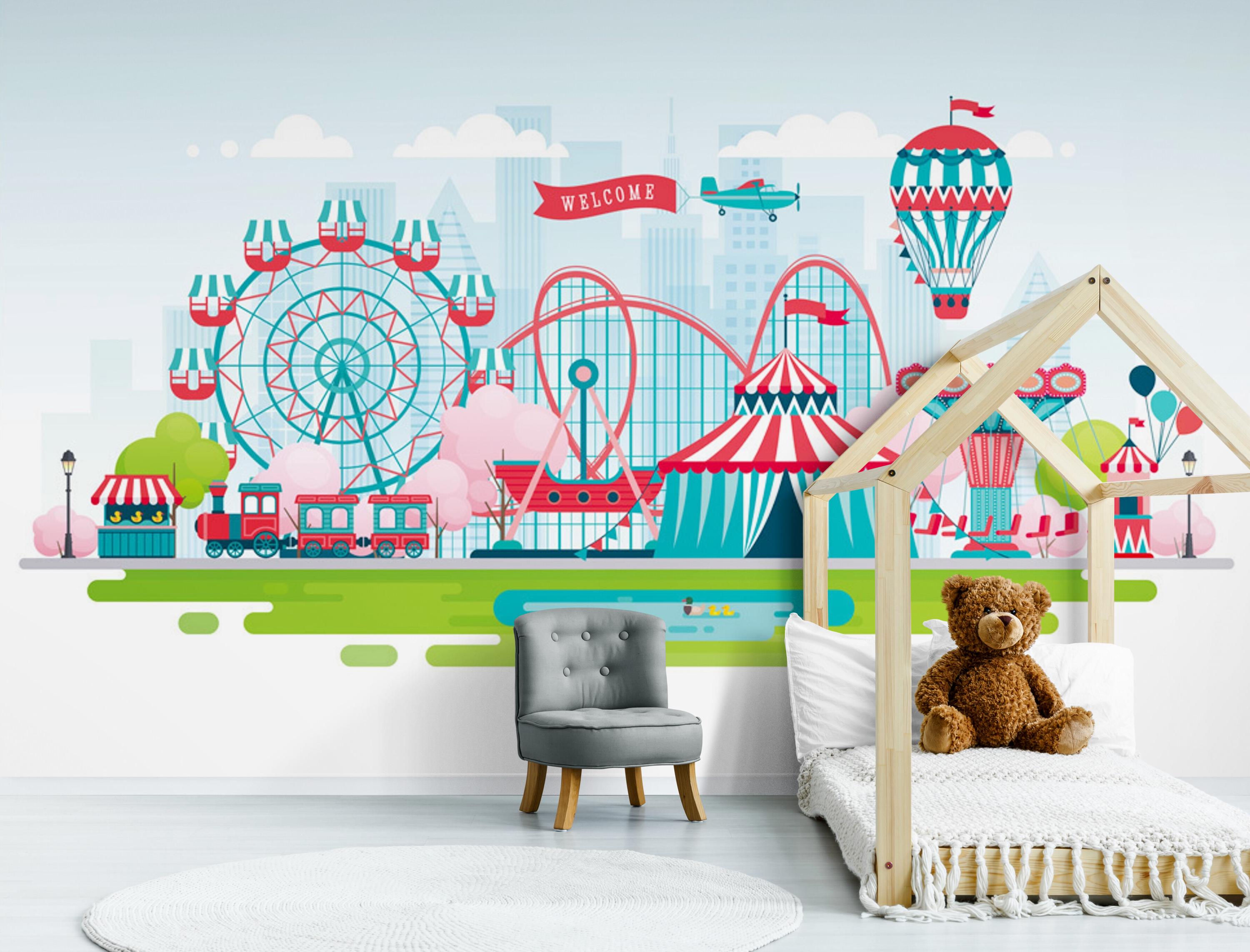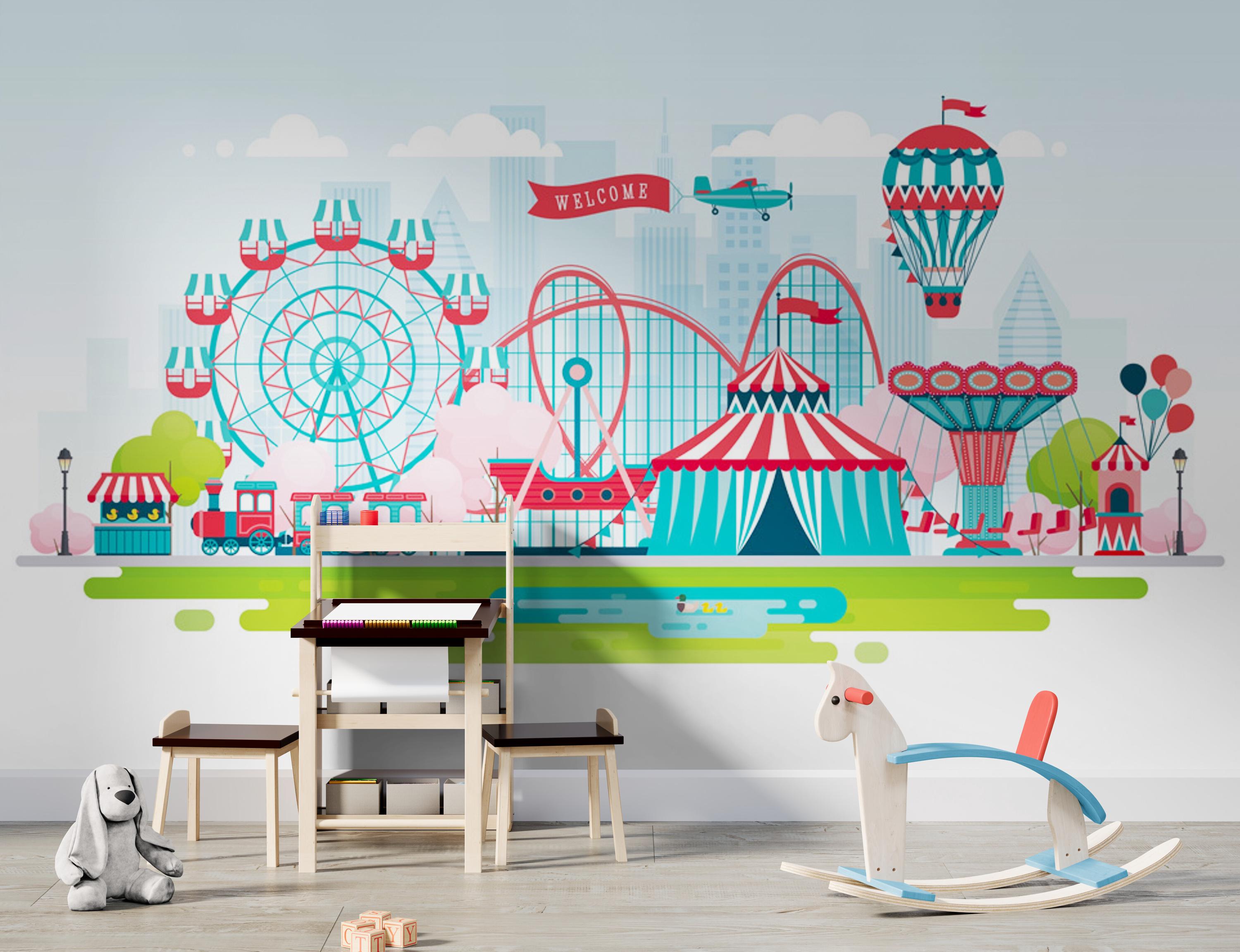 Our Child Room Wallpaper Wall Mural transforms any space into a vibrant theme park adventure, perfect for fostering creativity and joy in your little one's nursery or playroom. With its colorful funfair design, it brings a playful atmosphere that sparks imagination and delights children of all ages, available in both peel and stick or traditional wallpaper options.