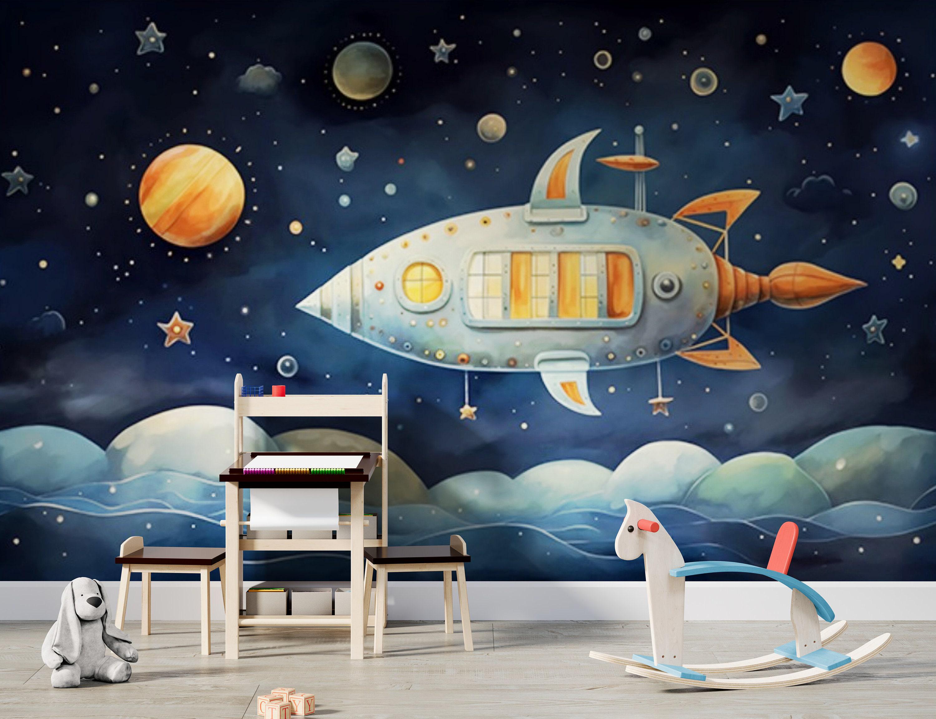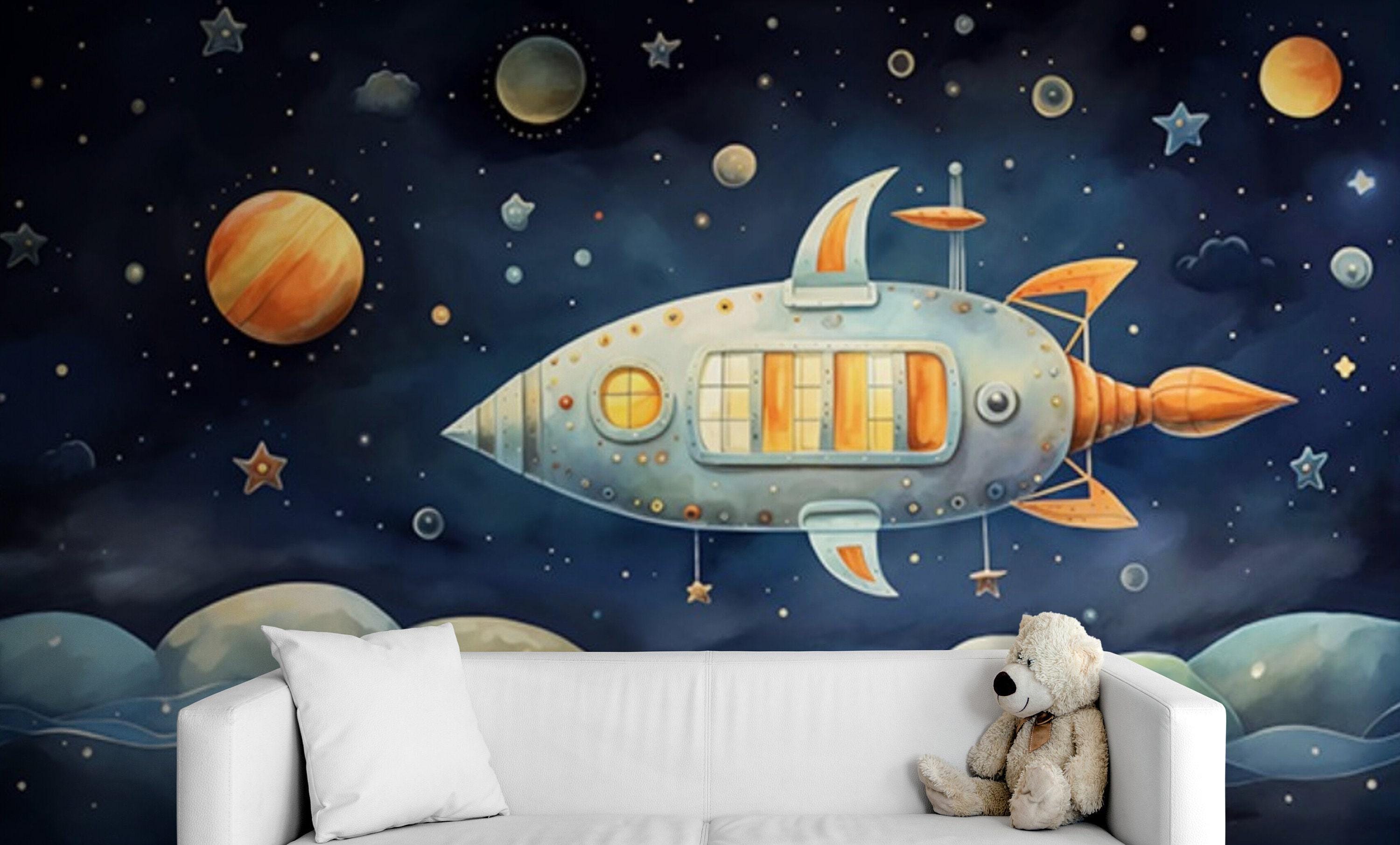 Our Child Room Wallpaper Wall Mural brings the wonders of the cosmos to life with vibrant spacecraft, planets, and stars, creating a colorful and imaginative space for your little one. Transform your baby's nursery or child's room into a fantastic galactic adventure with this captivating space-themed design.
