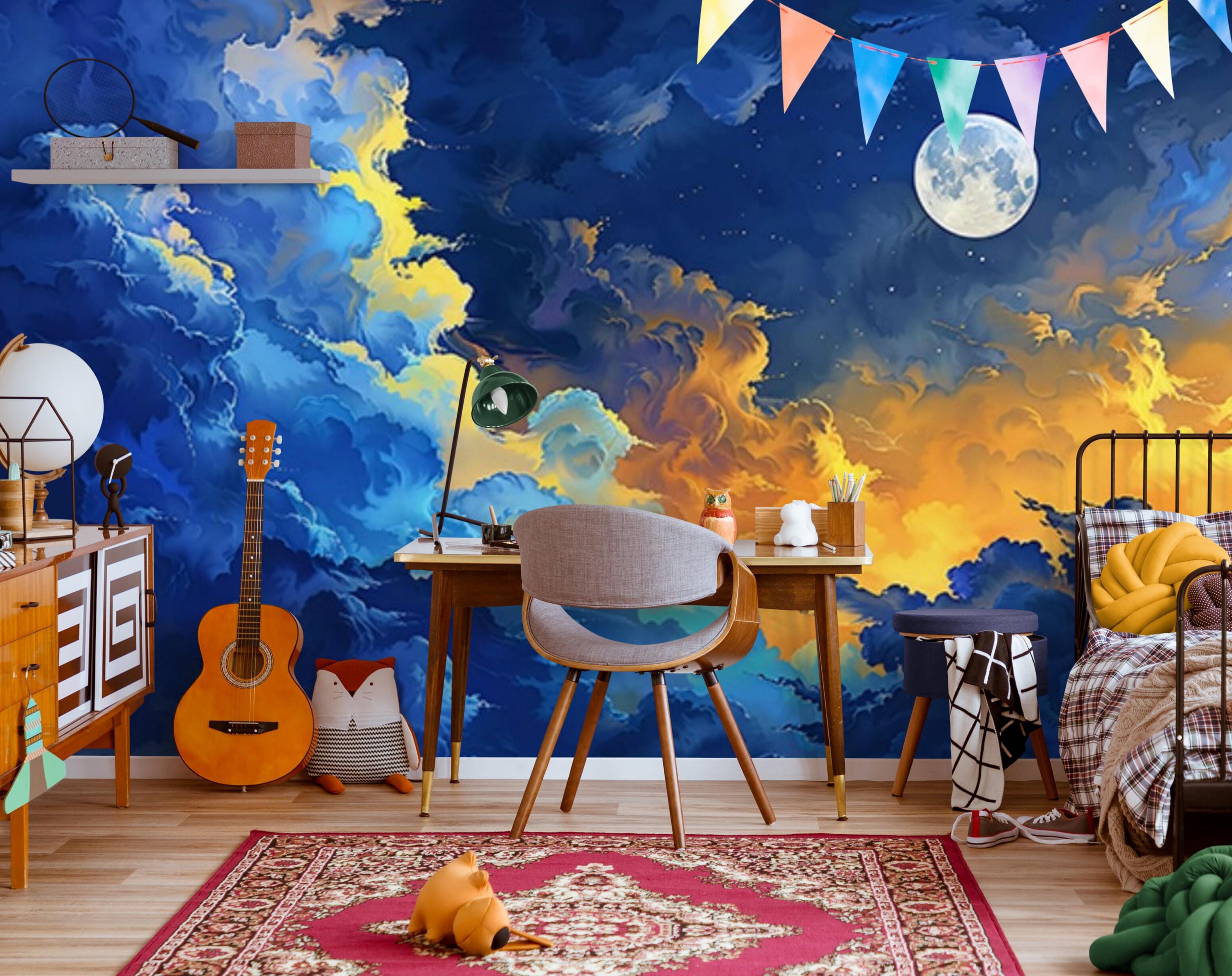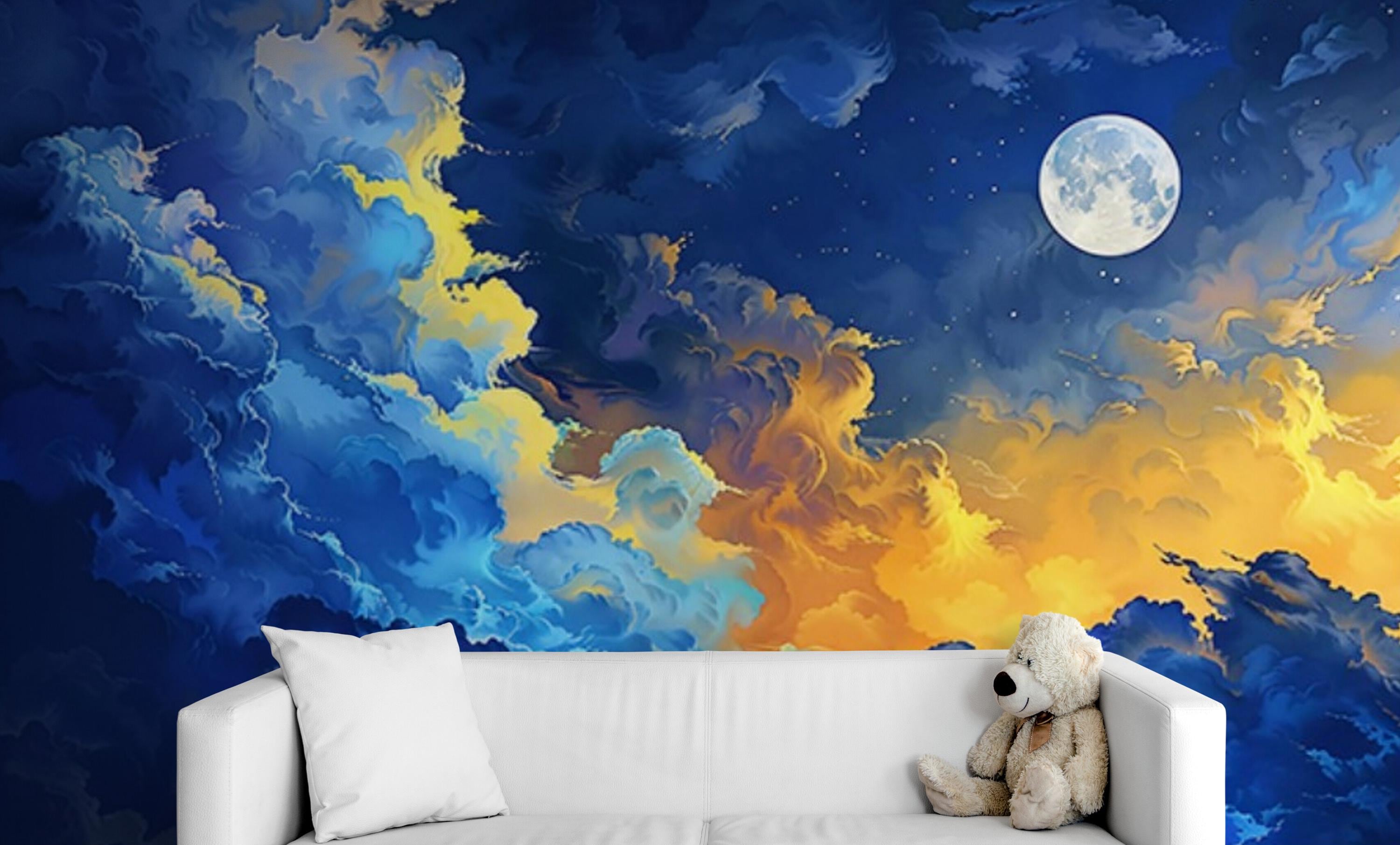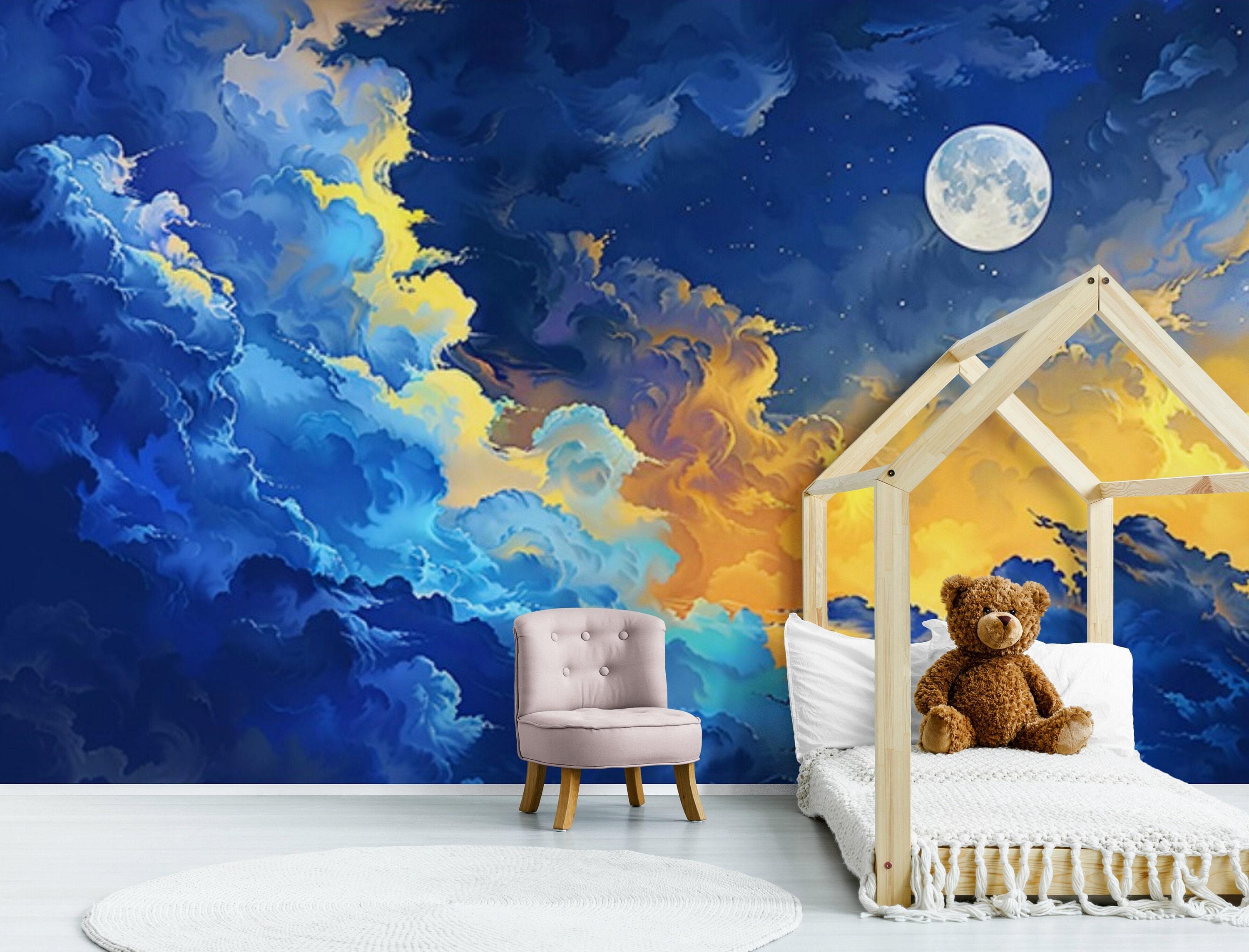Our Child Room Wallpaper Wall Mural transforms nurseries into dreamy realms with its enchanting blend of a midnight sky and vibrant hues. Perfect for creating a cozy yet captivating space for little ones to explore and imagine under the moonlit sky.