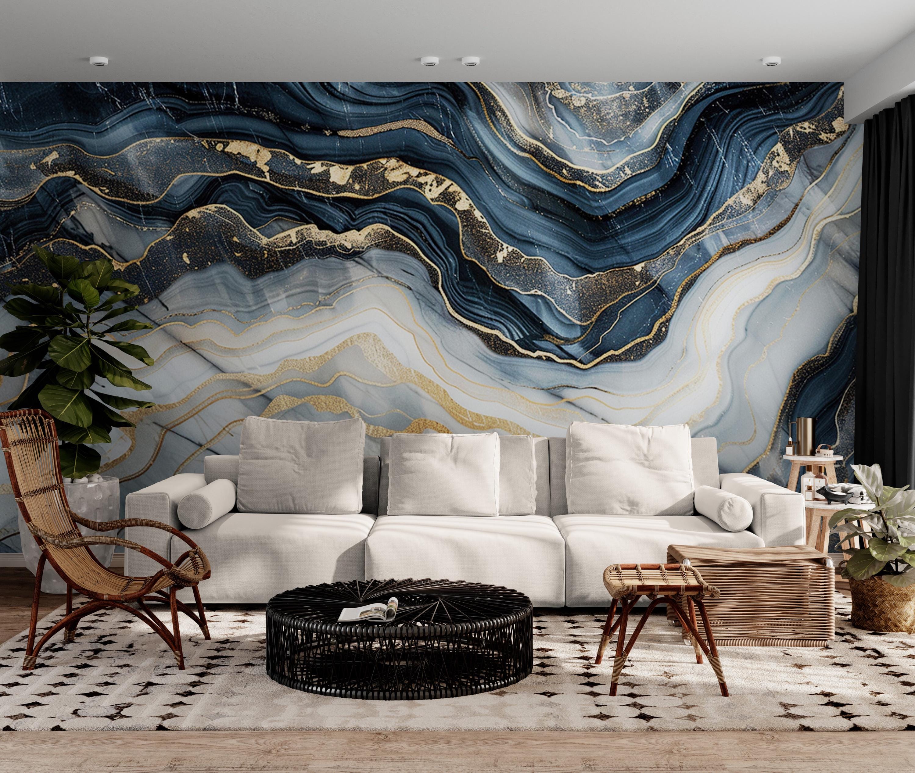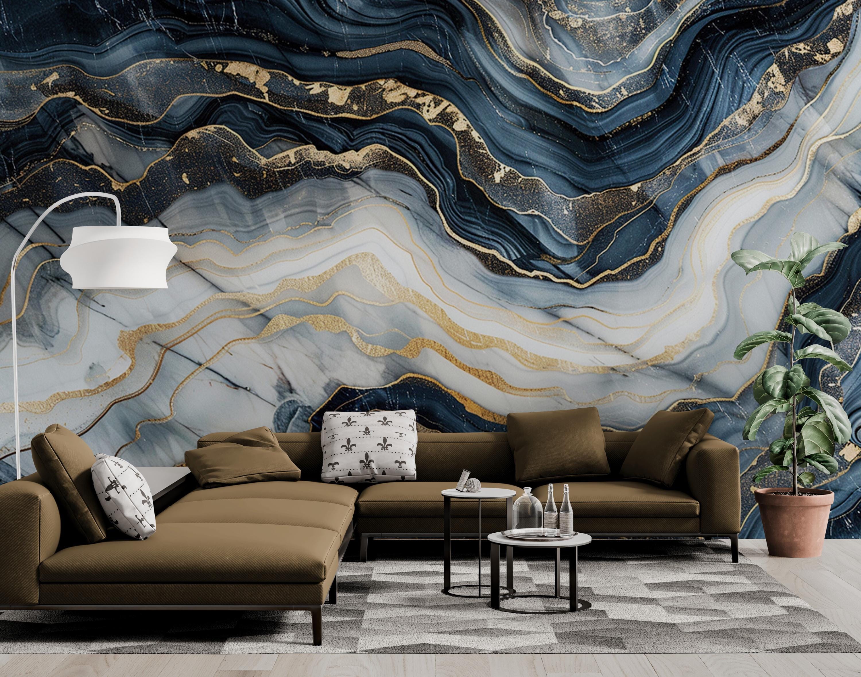 Our Marble Style Wallpaper Wall Mural brings the timeless allure of blue and gray marble infused with golden hues, adding a touch of luxury to any space. Transform your bedroom, living room, or entryway effortlessly with this stunning natural stone-inspired wallpaper.