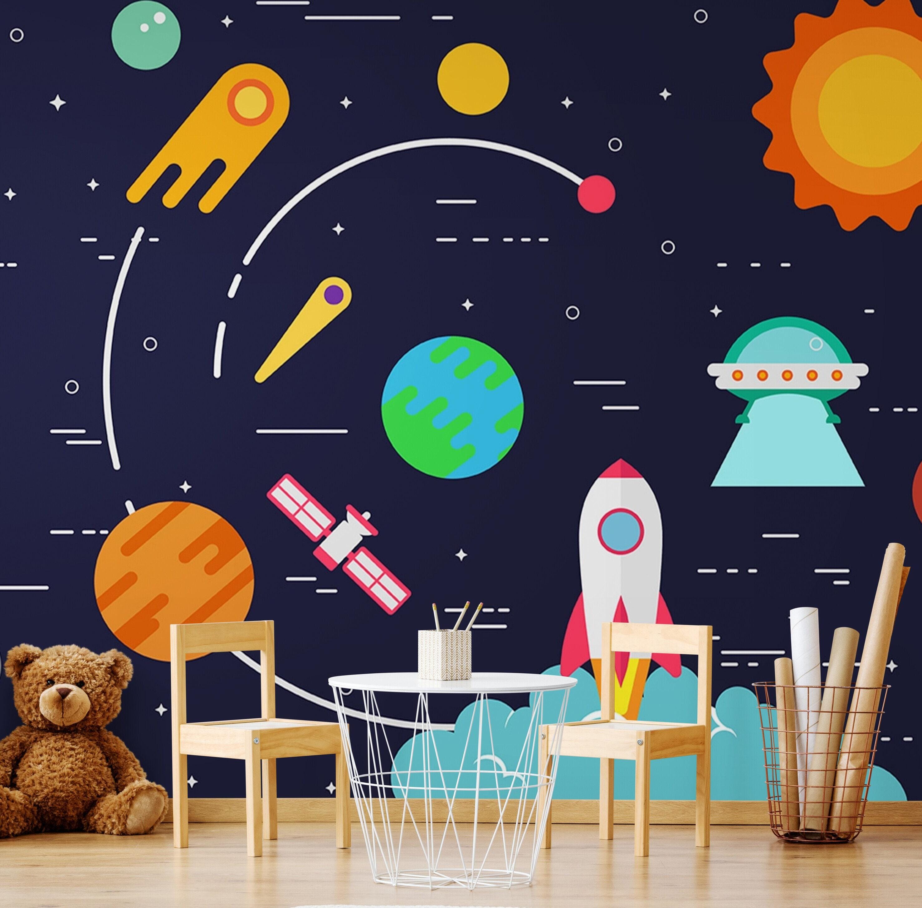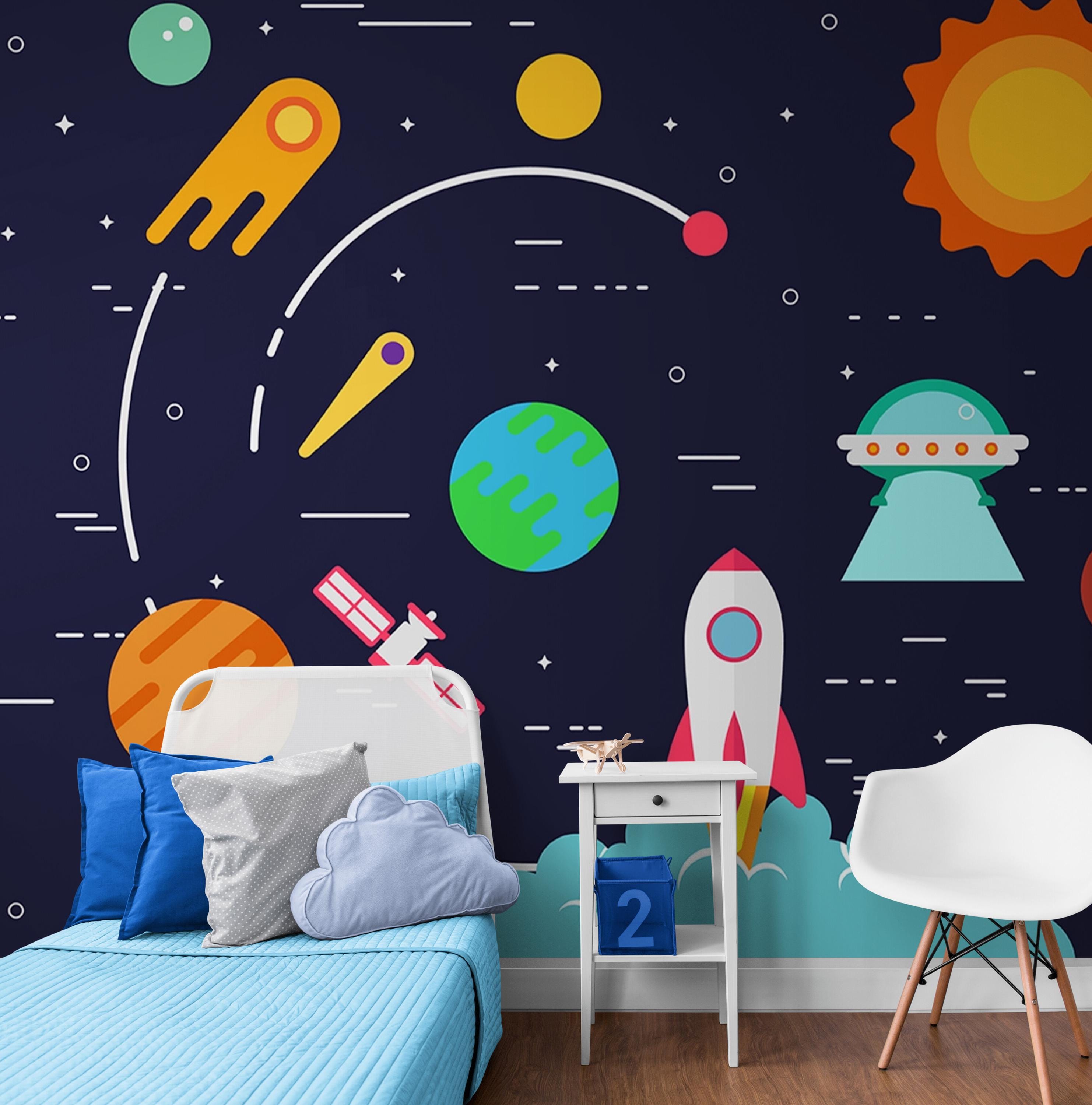 Our Child Room Wallpaper Wall Mural transforms any space into a cosmic adventure, featuring vibrant spacecrafts and planets in a playful cartoon style. Perfect for creating a captivating atmosphere in your little one's nursery or baby room with its unique blue theme.