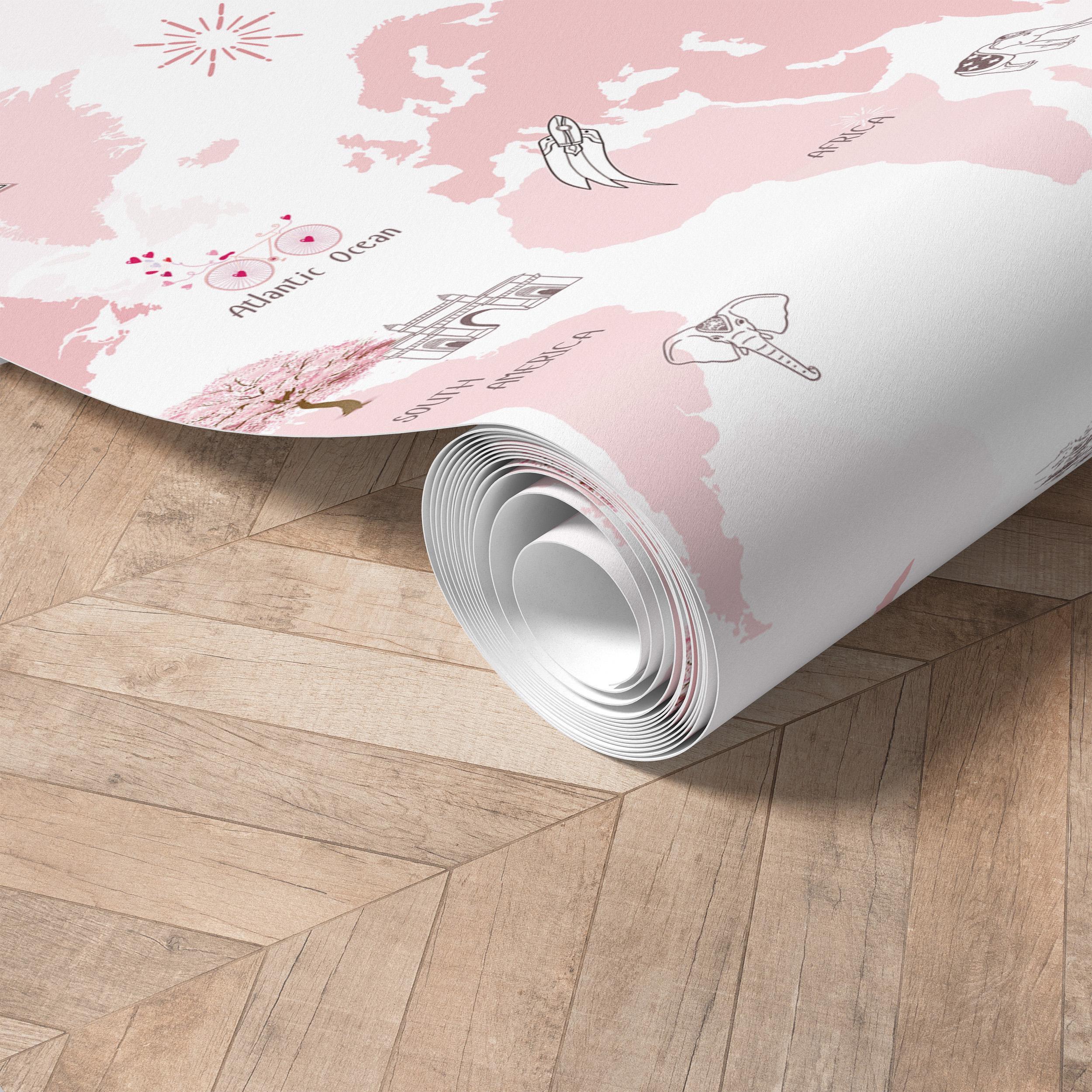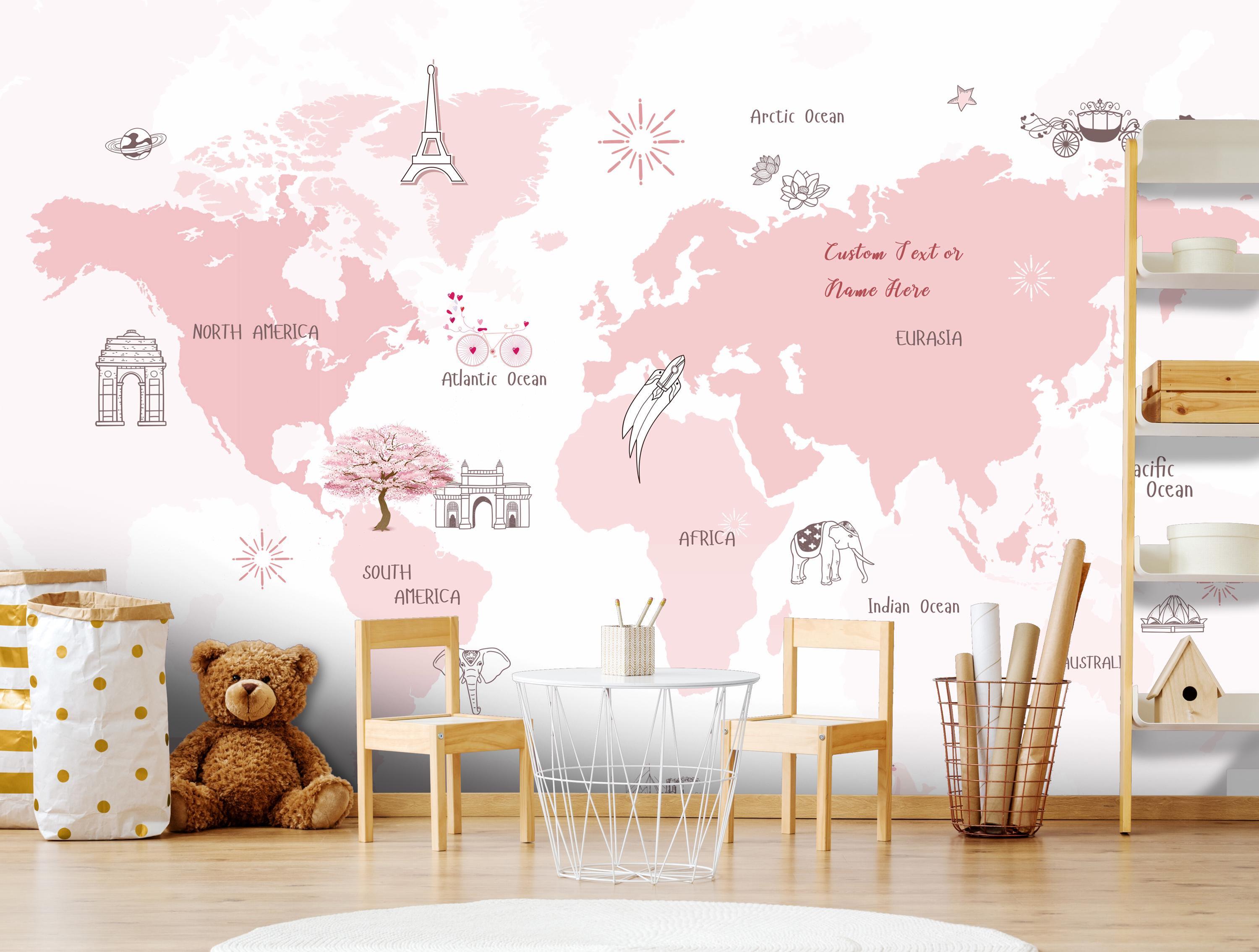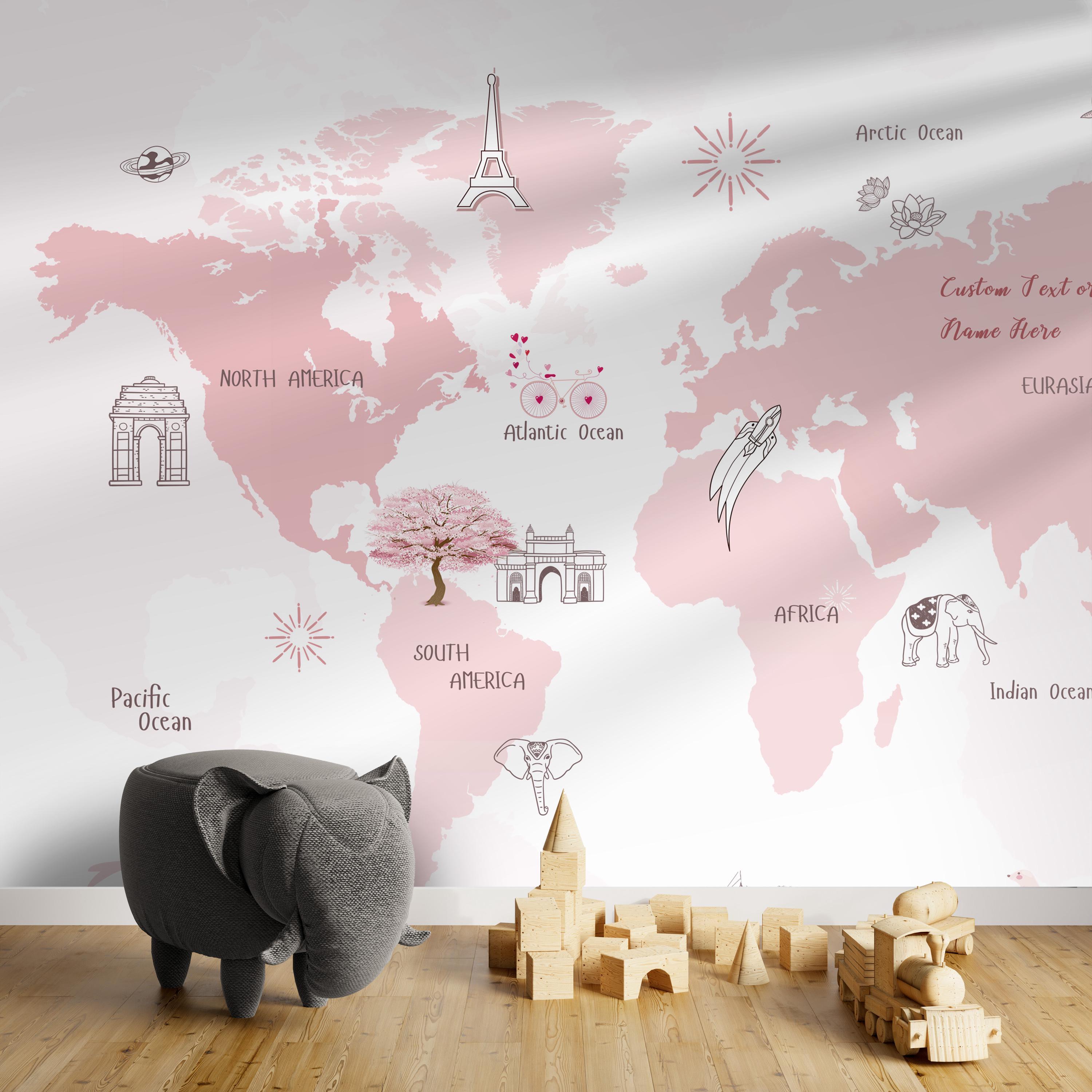 Custom Size Pink World Map Children's Room Wallpaper, Peel and Stick Nursery or Kids Room Wallpaper, Self Adhesive Girl Room Wall Mural,