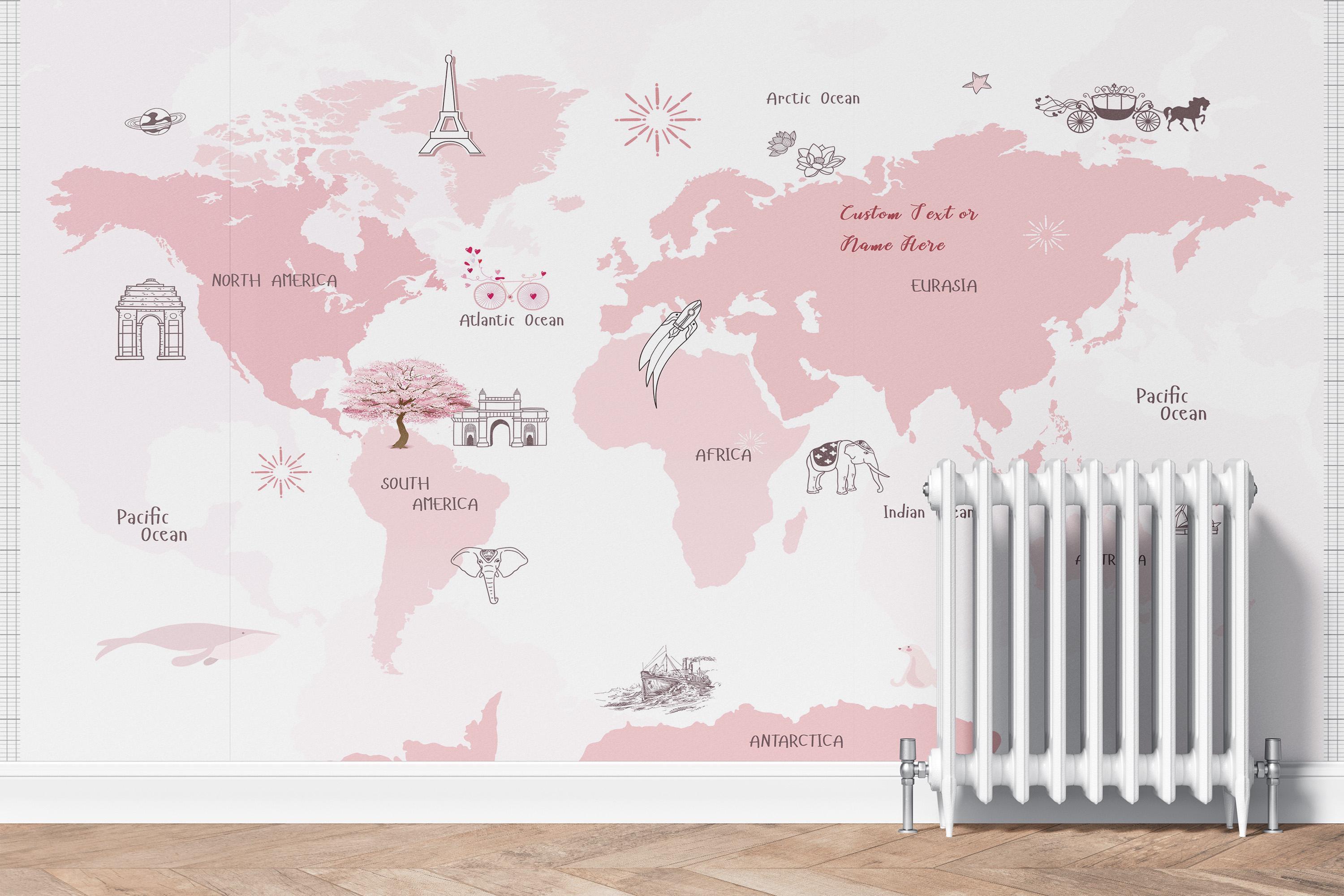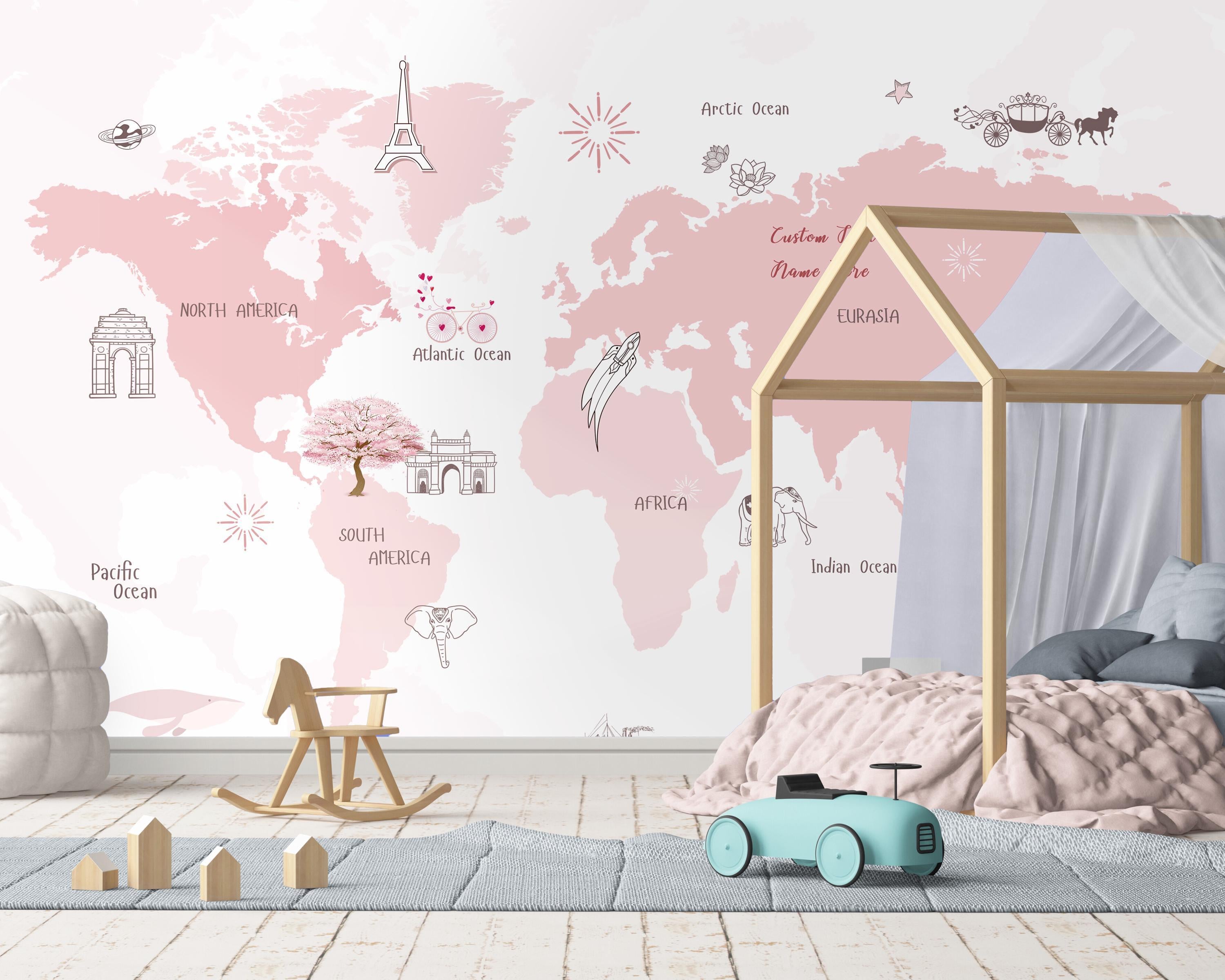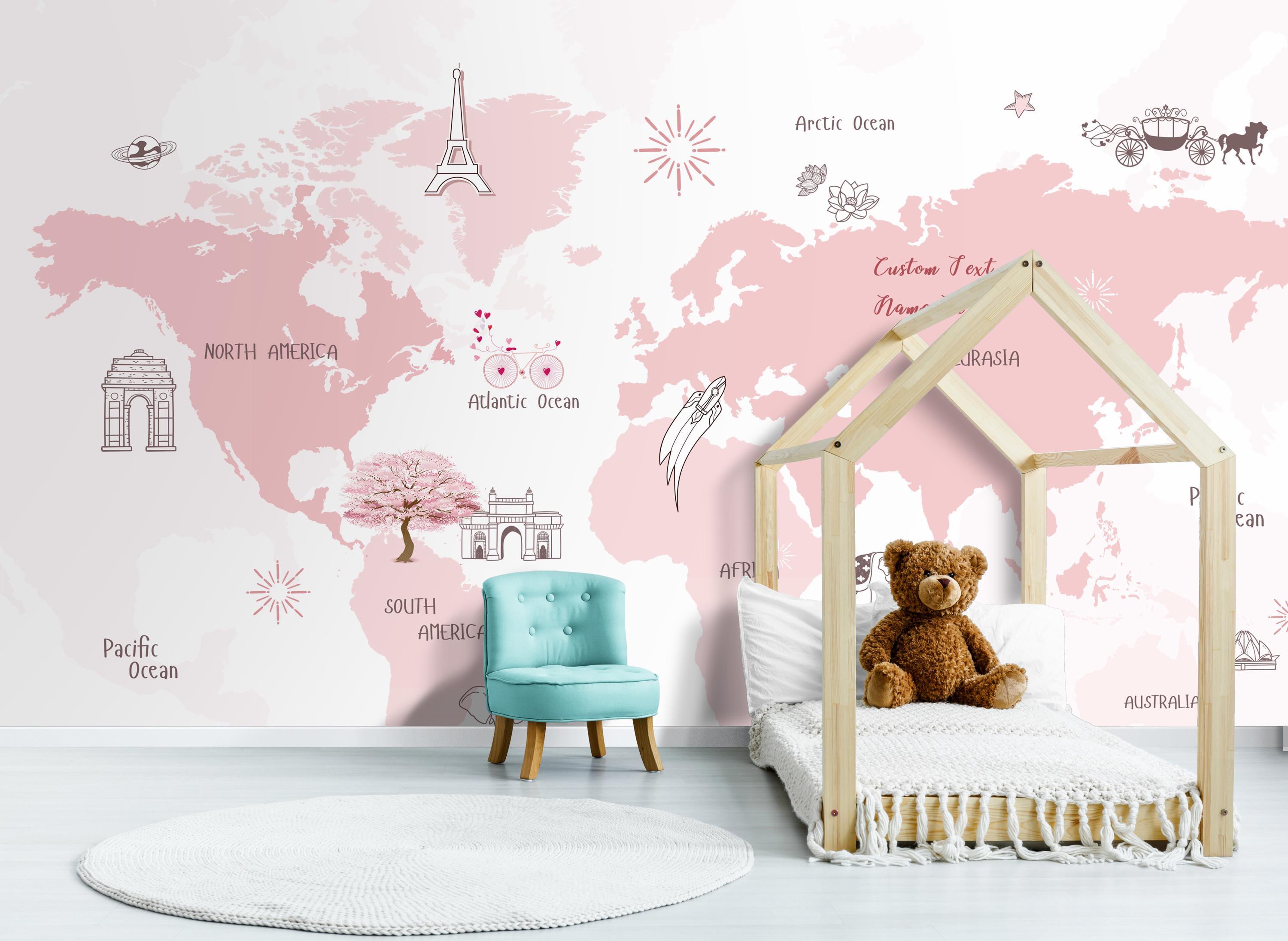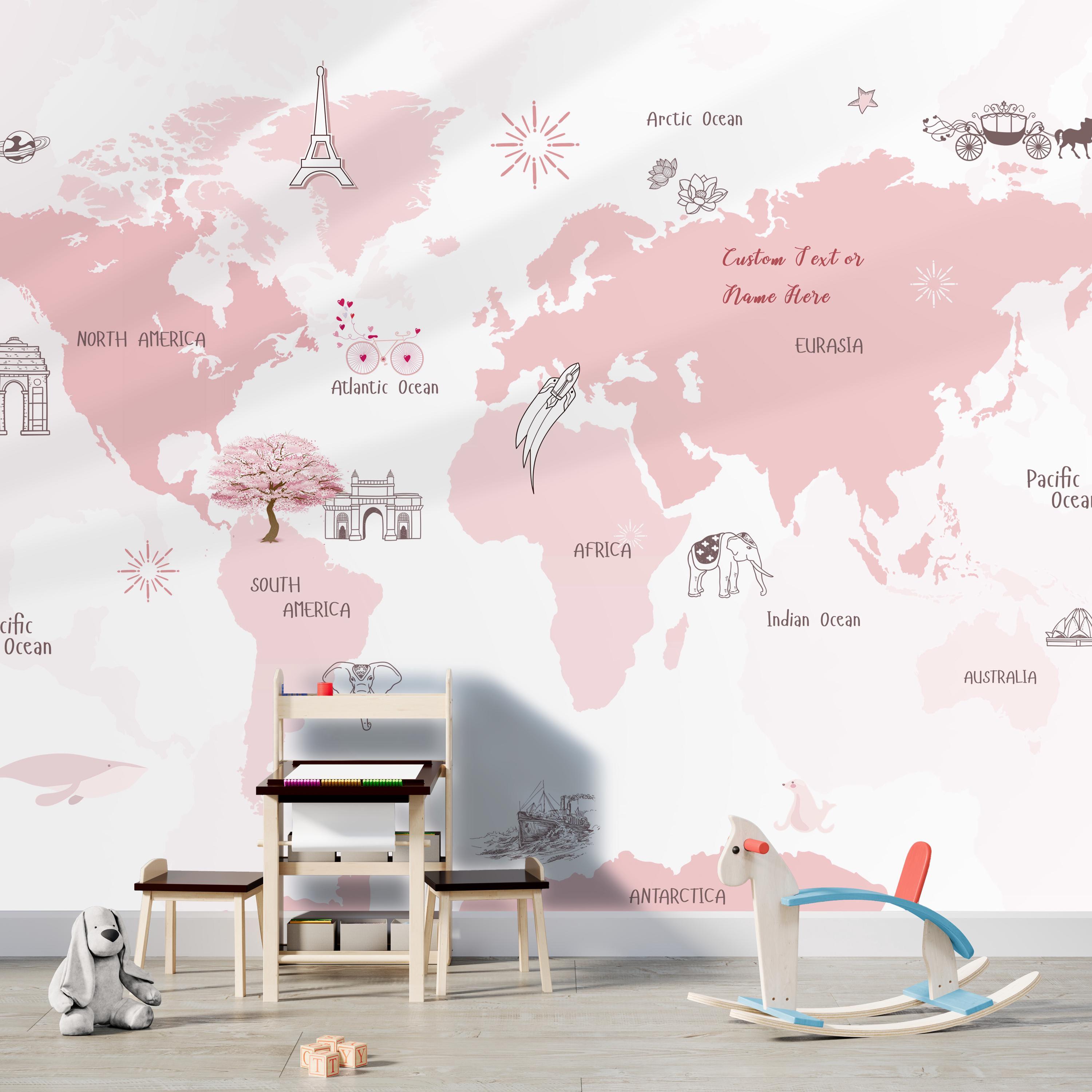 Custom Size Pink World Map Children's Room Wallpaper, Peel and Stick Nursery or Kids Room Wallpaper, Self Adhesive Girl Room Wall Mural,