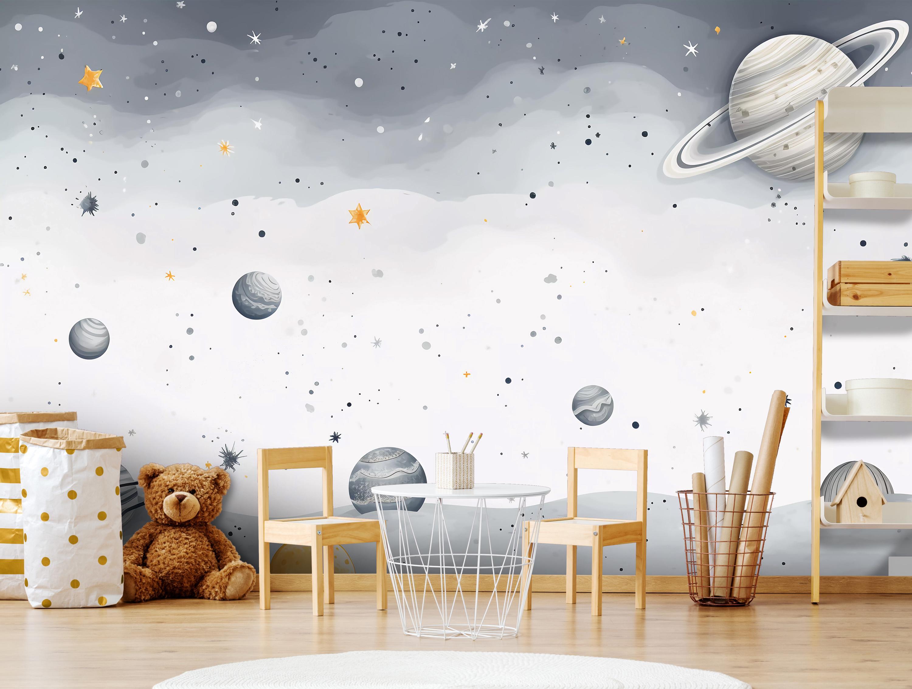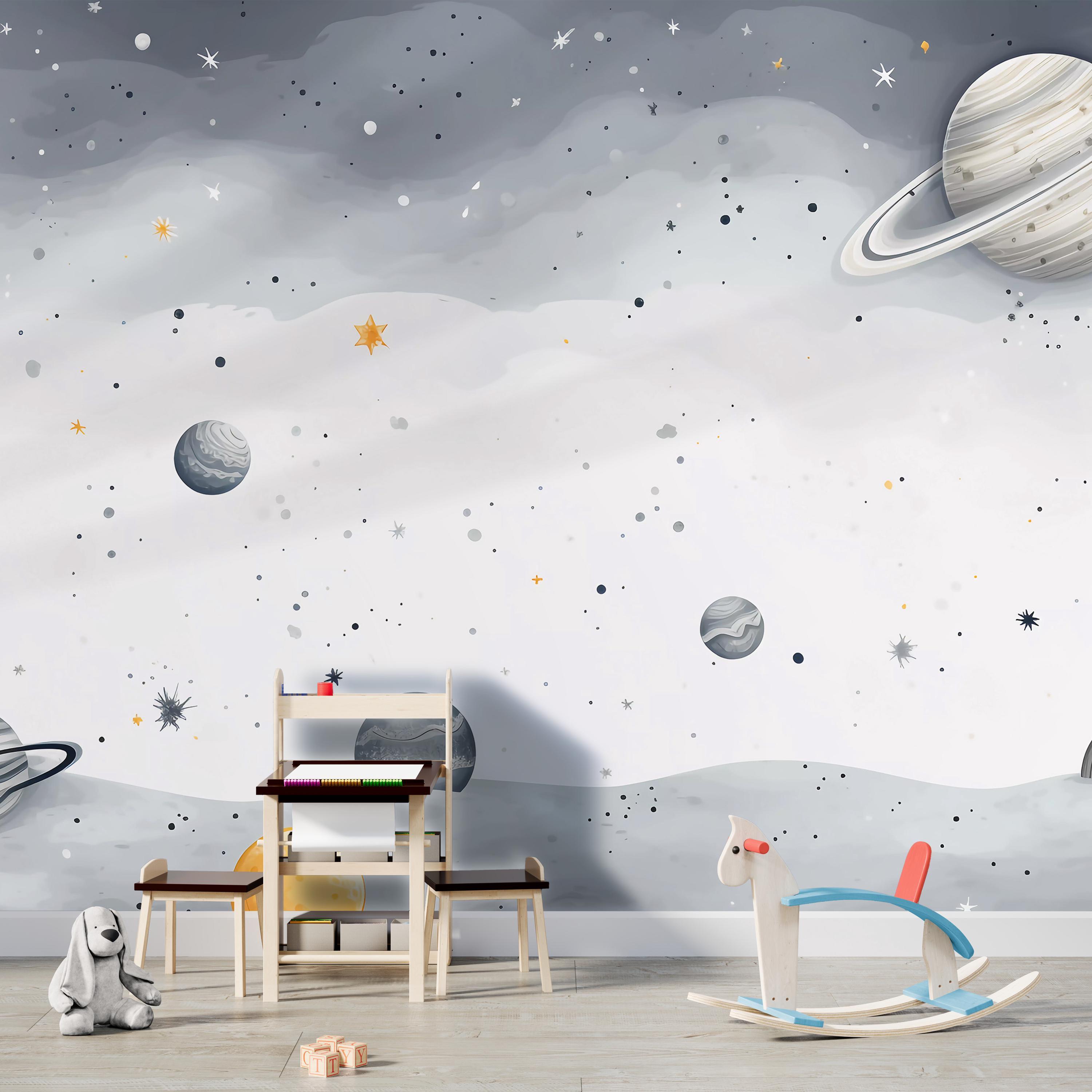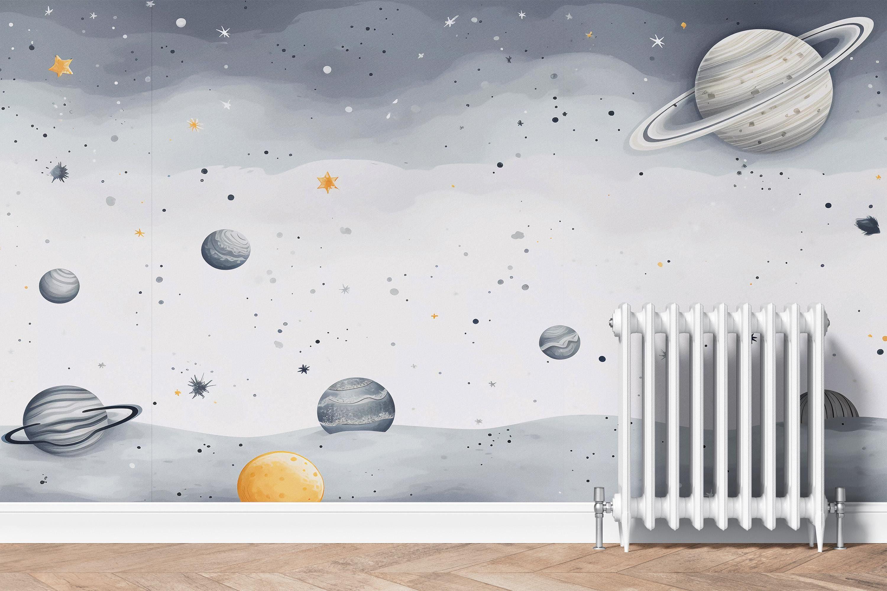 Abstract Gray Planet and Stars Children Wallpaper, Self Adhesive Peel and Stick or Traditional Wall Murals, Unique Space Nursery Wall Decals