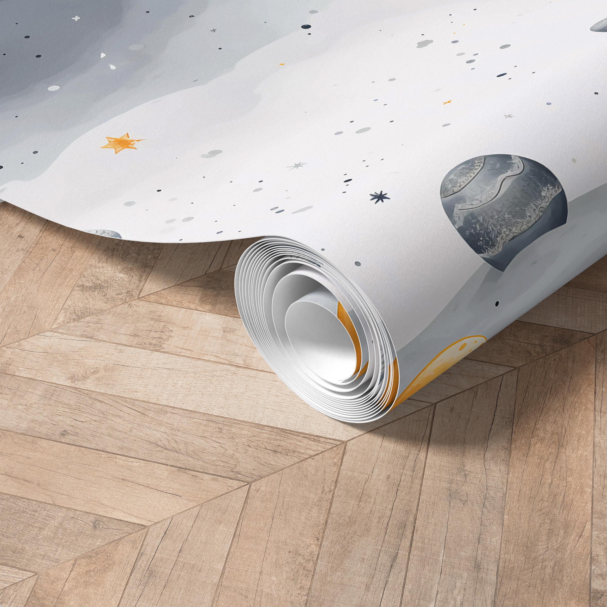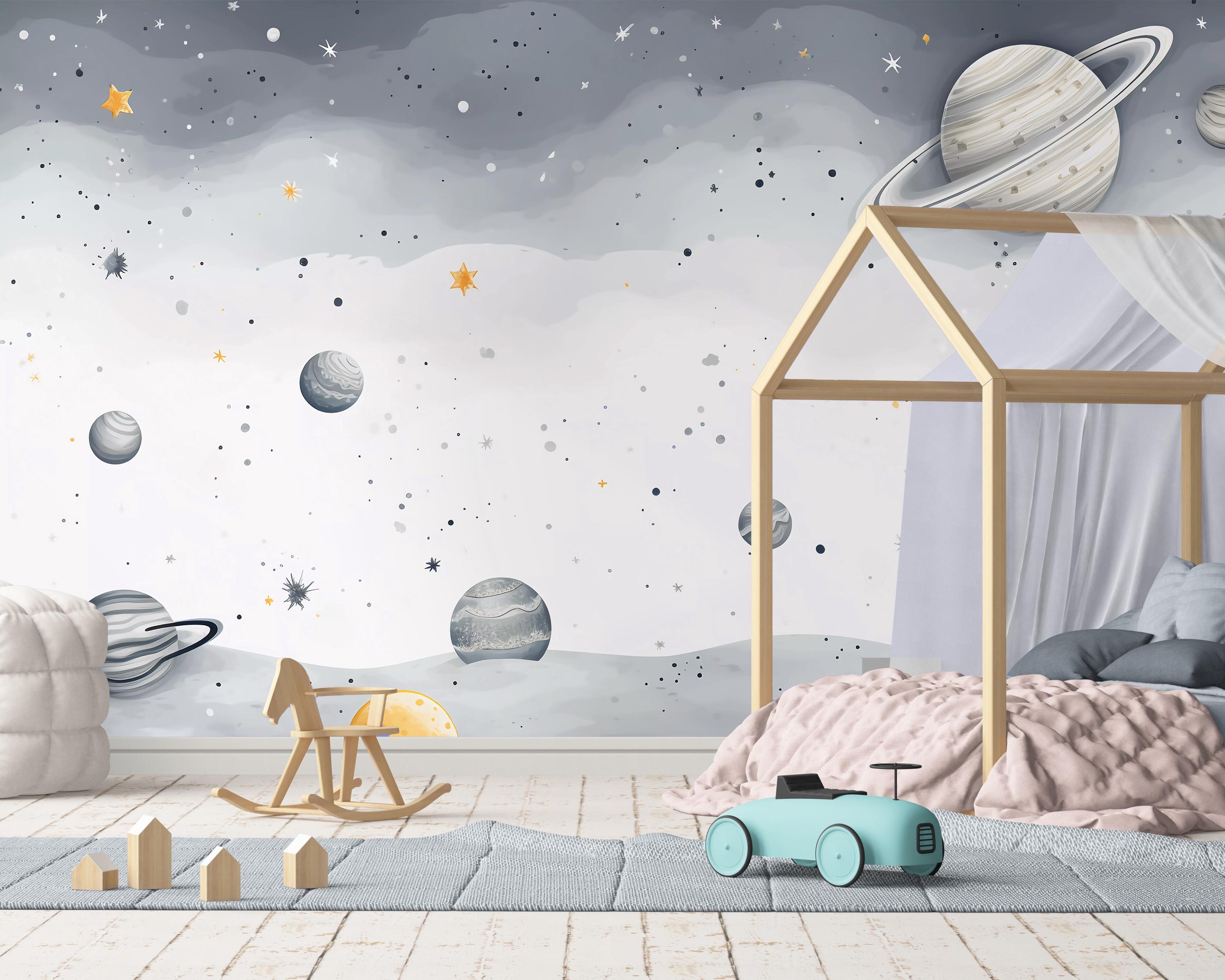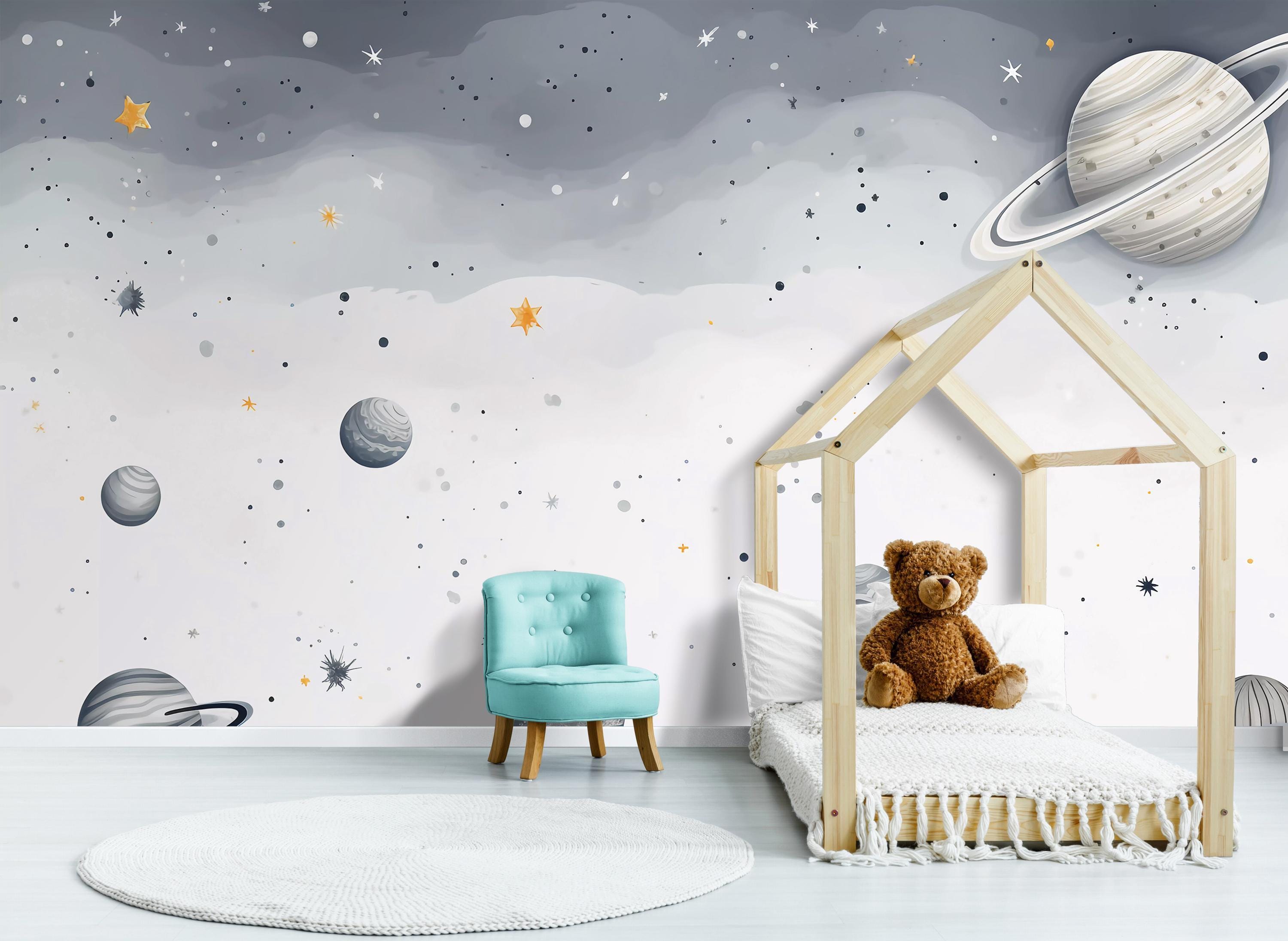 Abstract Gray Planet and Stars Children Wallpaper, Self Adhesive Peel and Stick or Traditional Wall Murals, Unique Space Nursery Wall Decals
