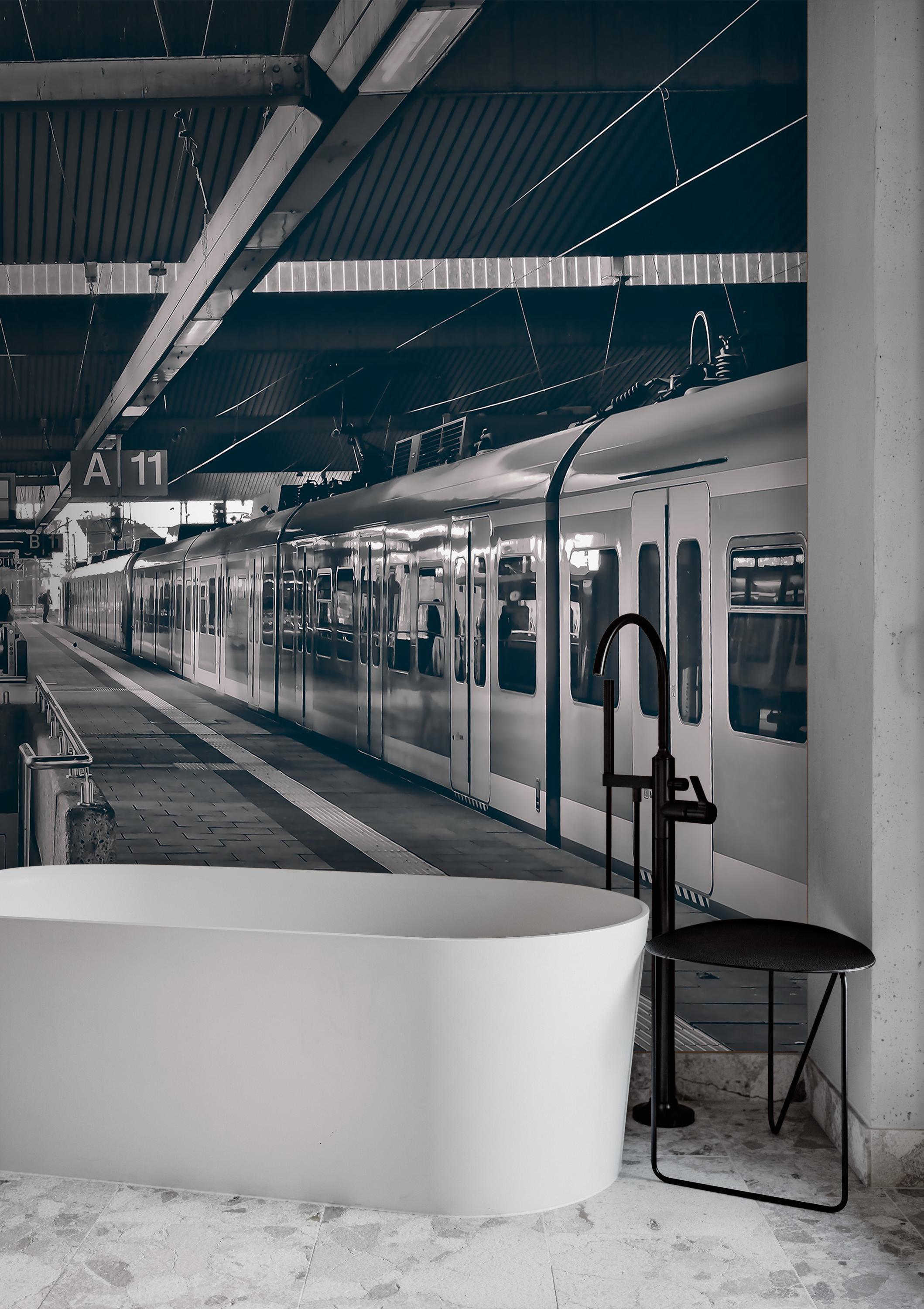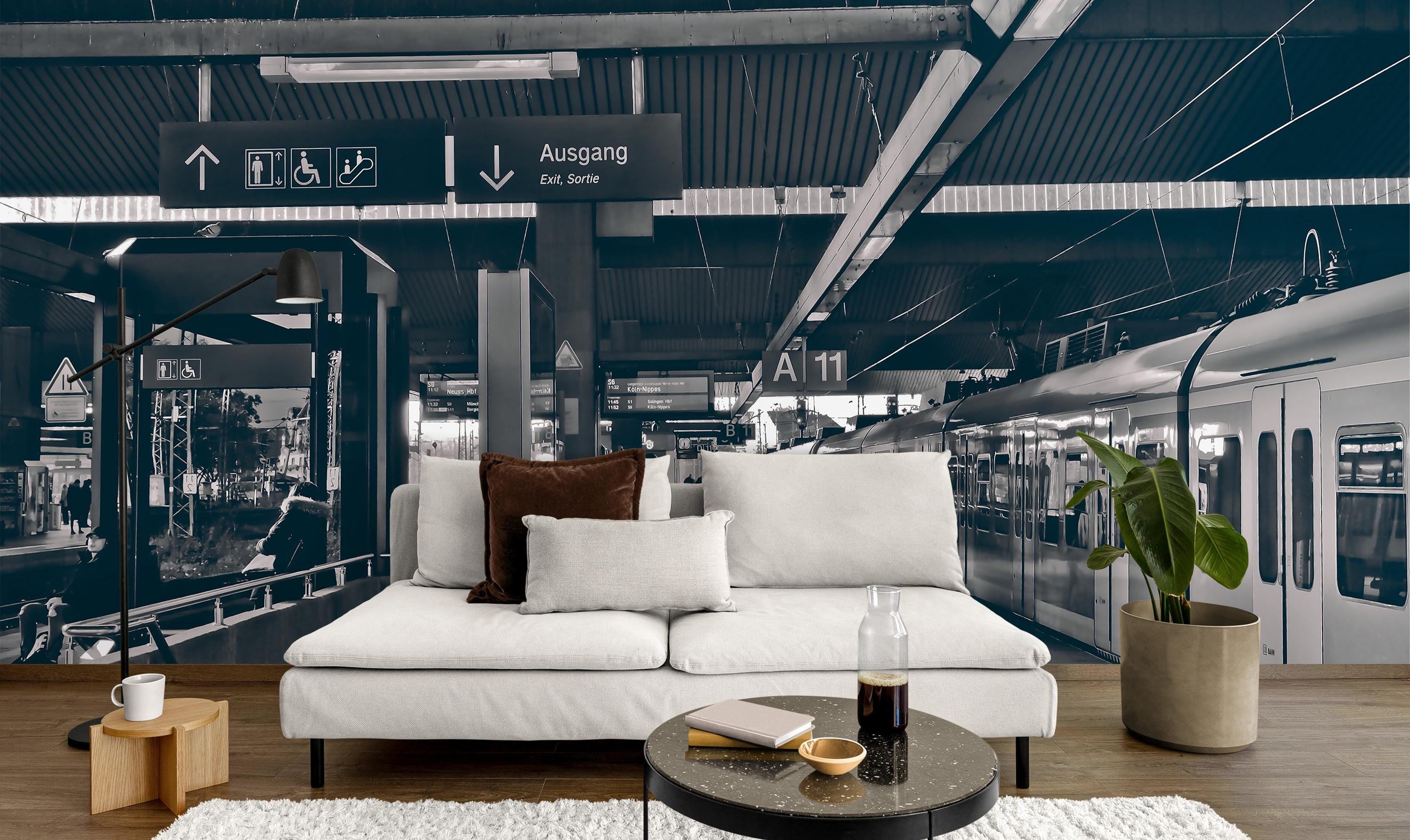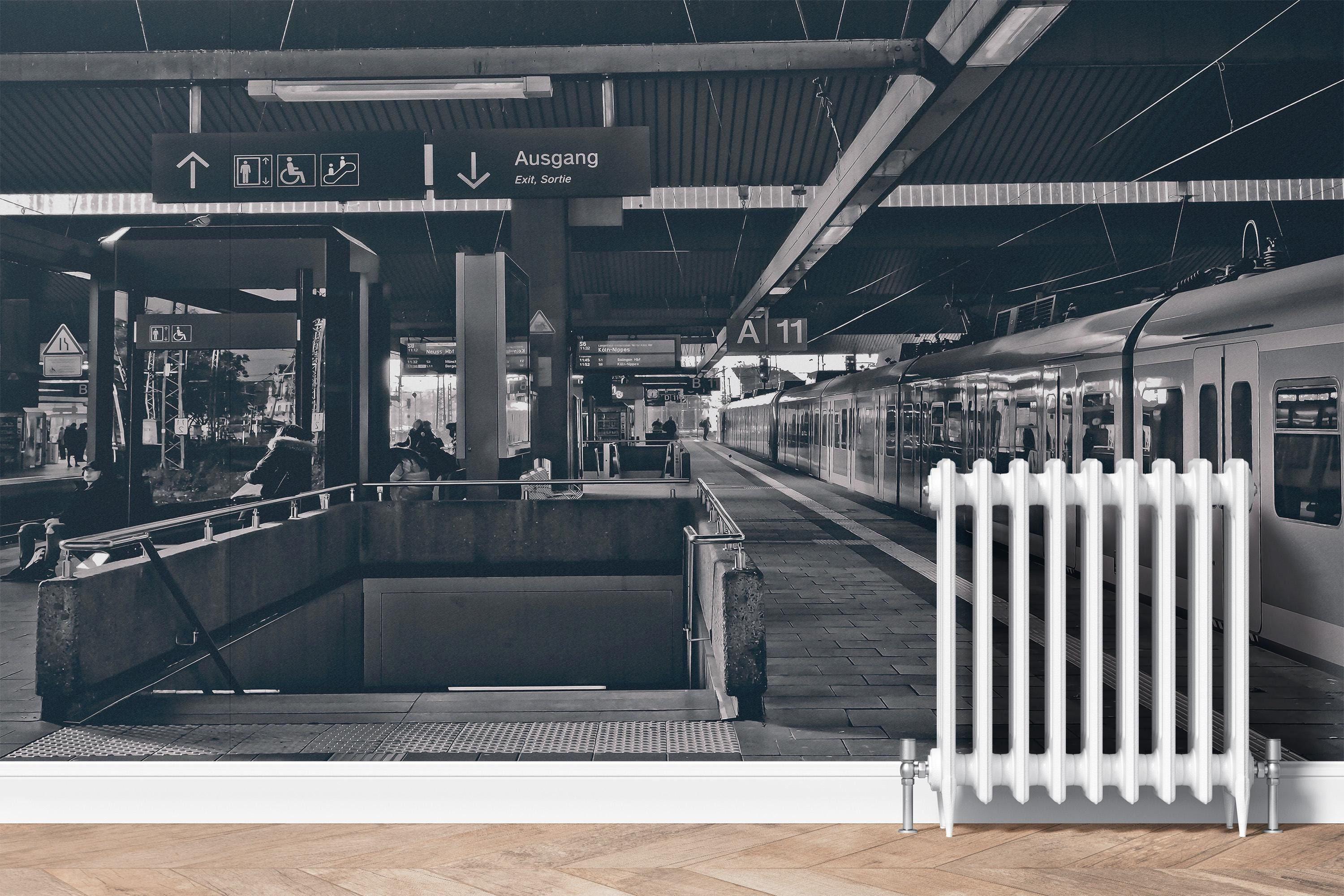 Train Station Wallpaper, Modern Black and White Wall Mural, Large Luxury Wall Decal for Livingroom or Office, Peel and Stick or Traditional