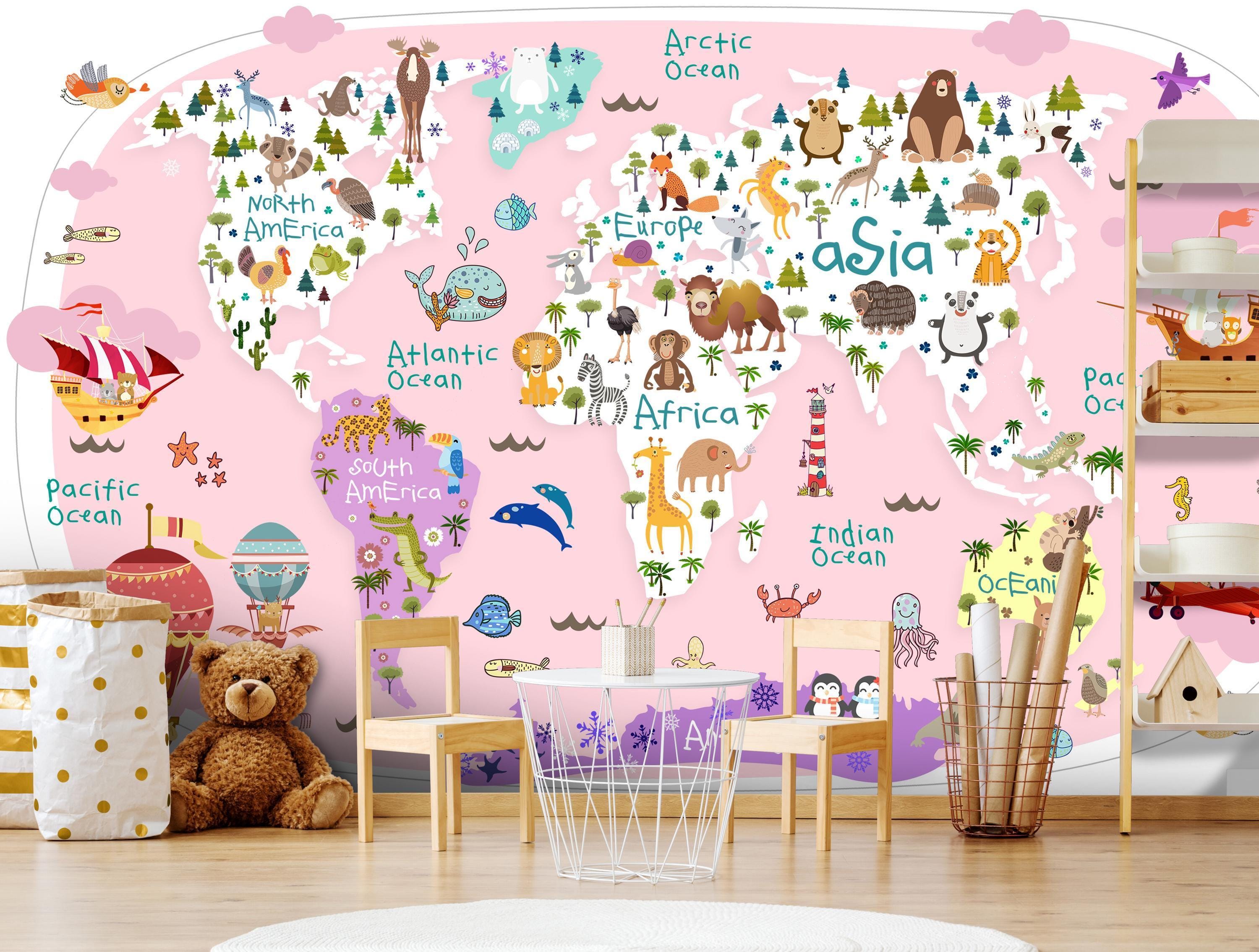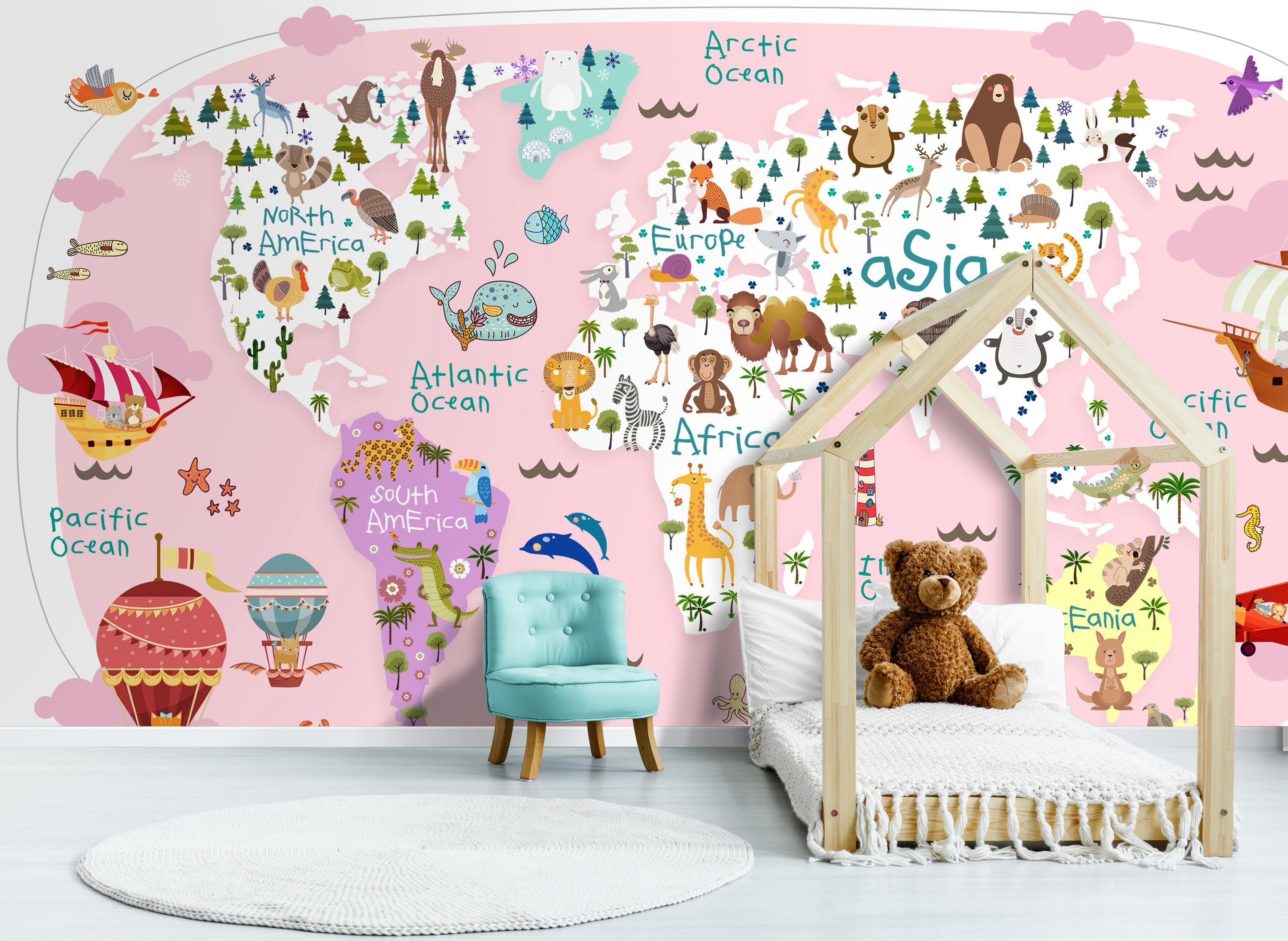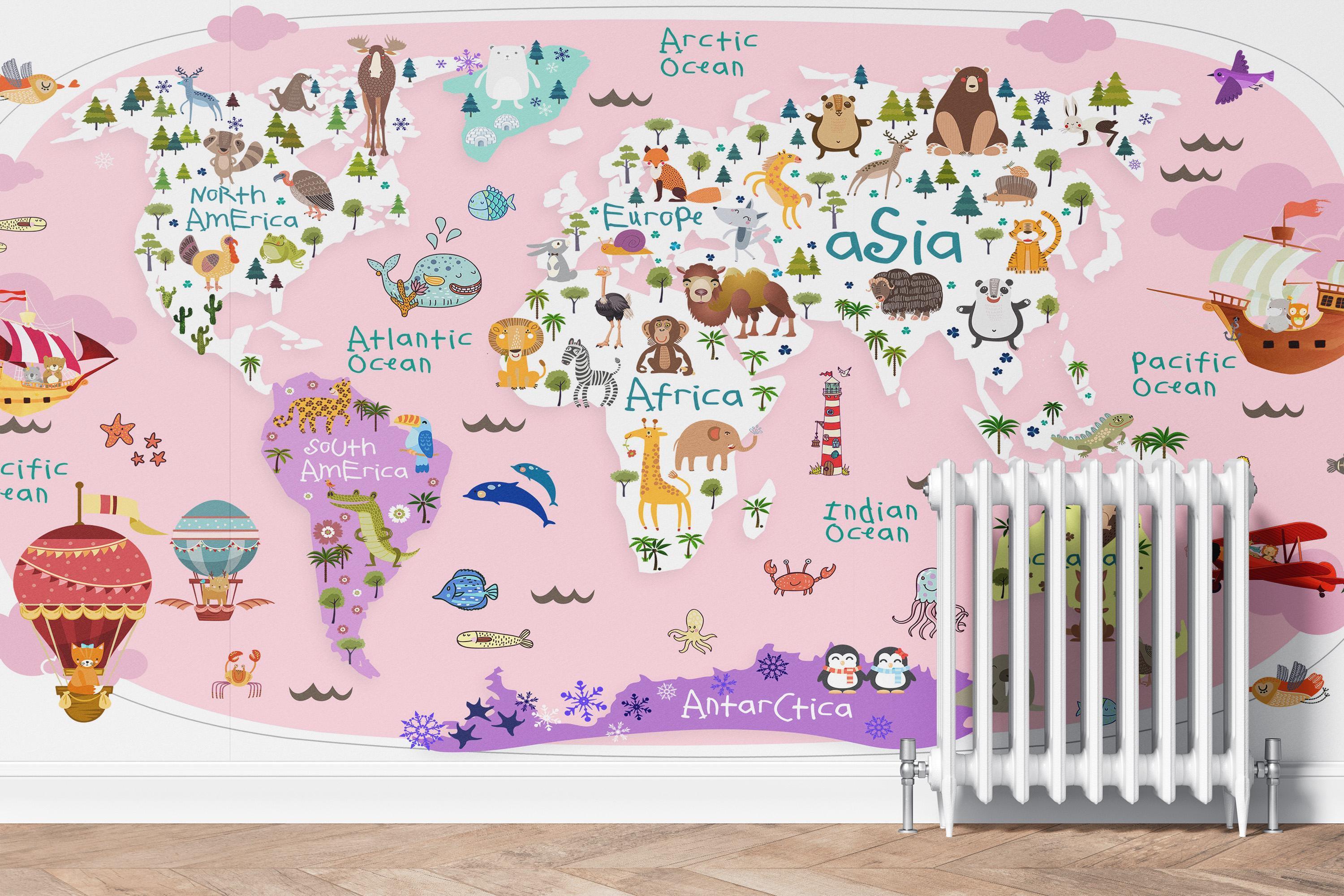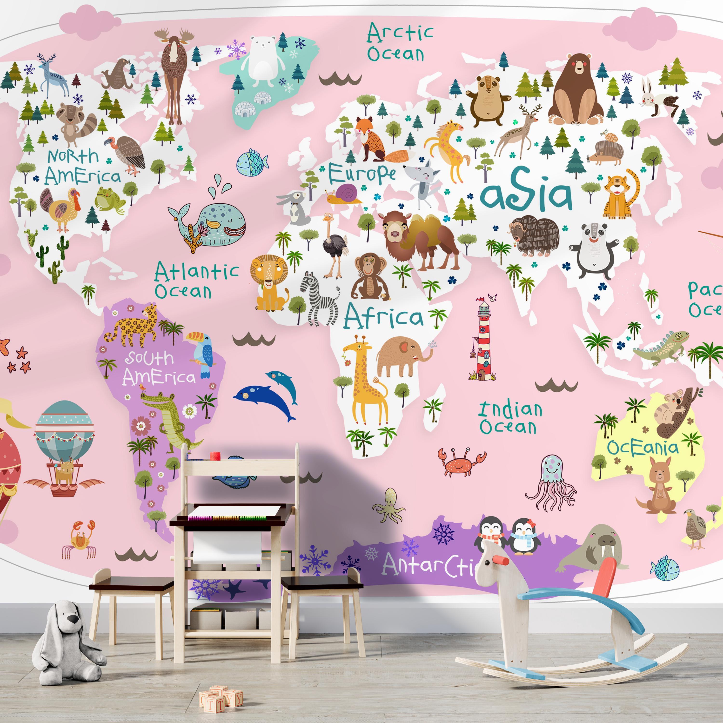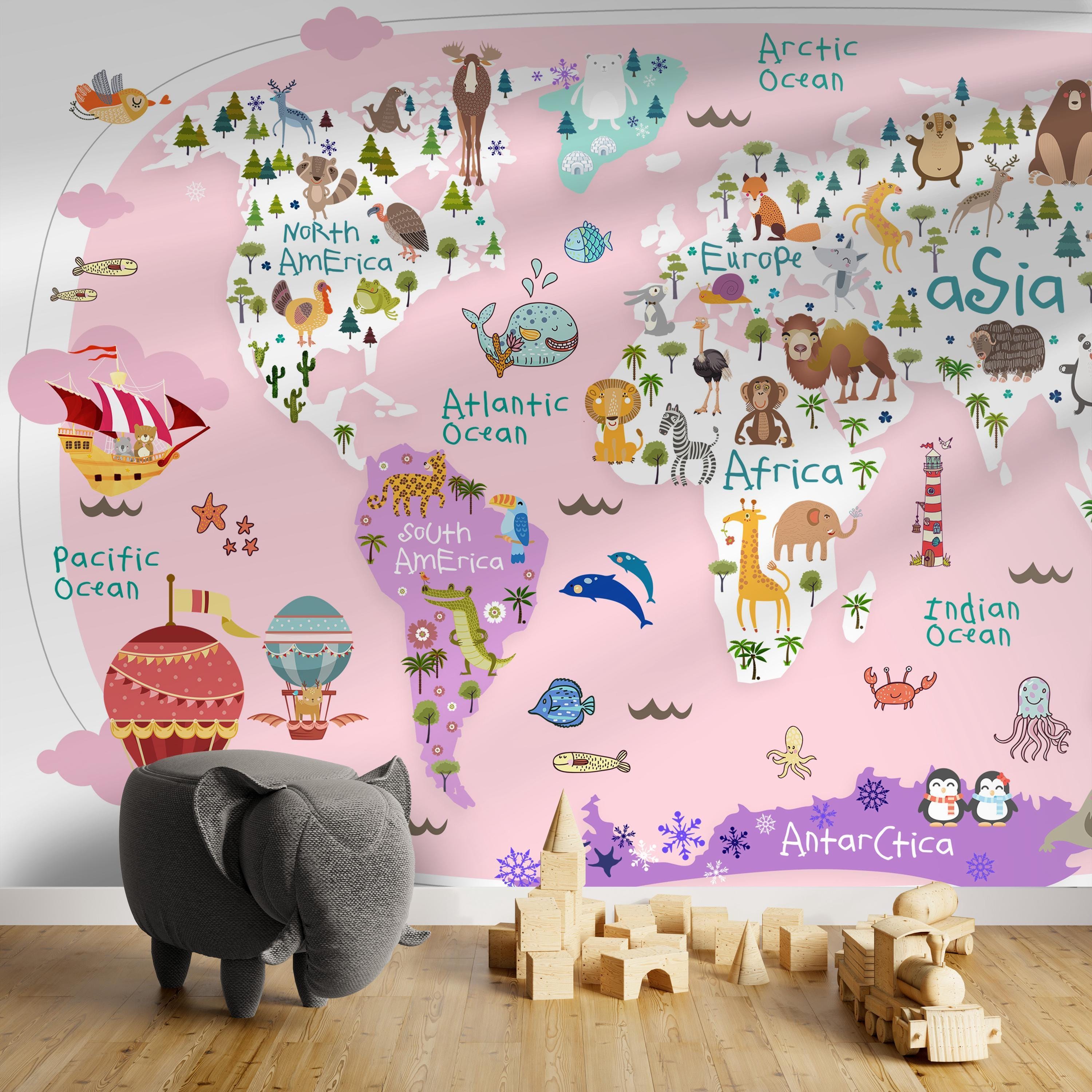 Custom Size Pink World Map Wallpaper - Kids Room Wall Mural