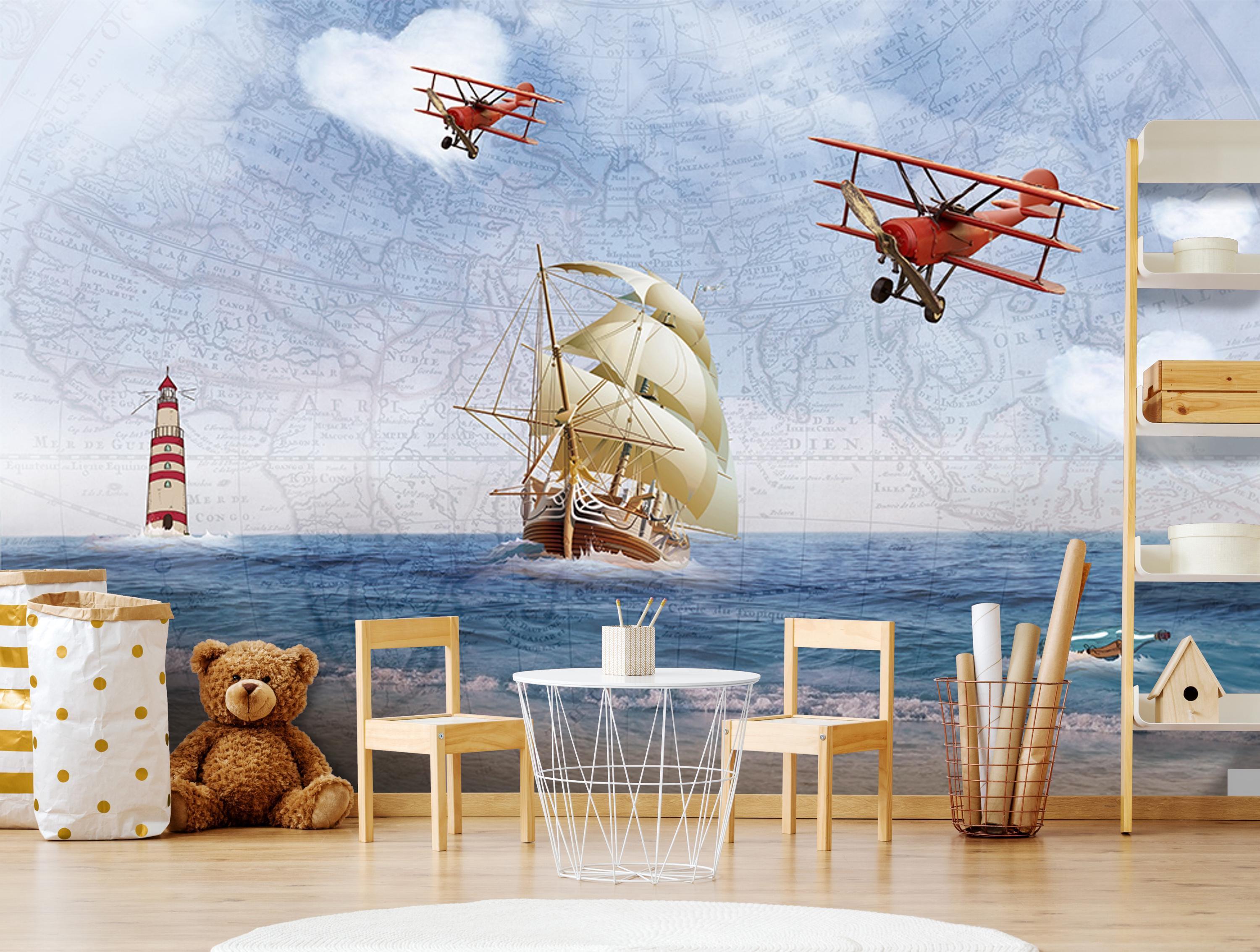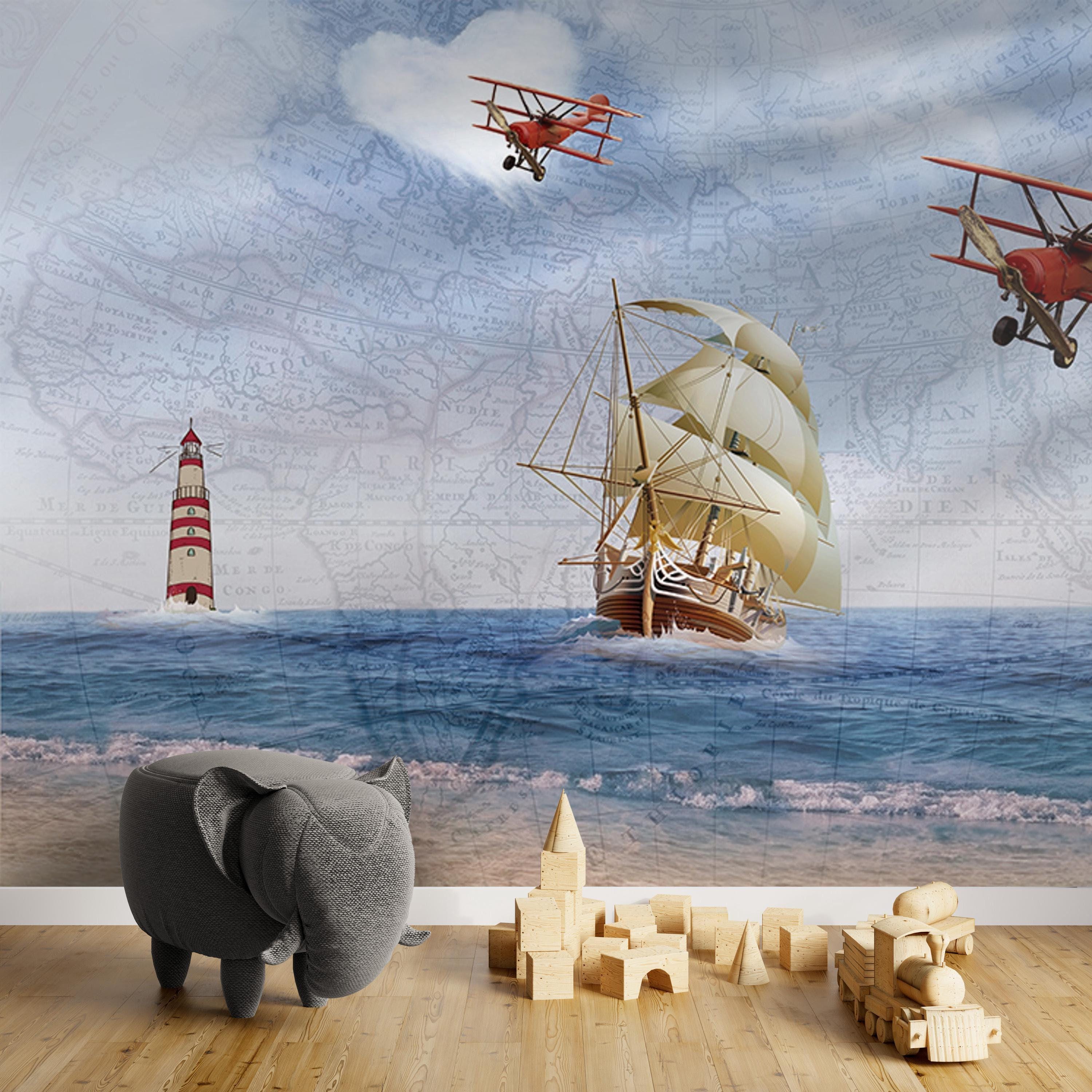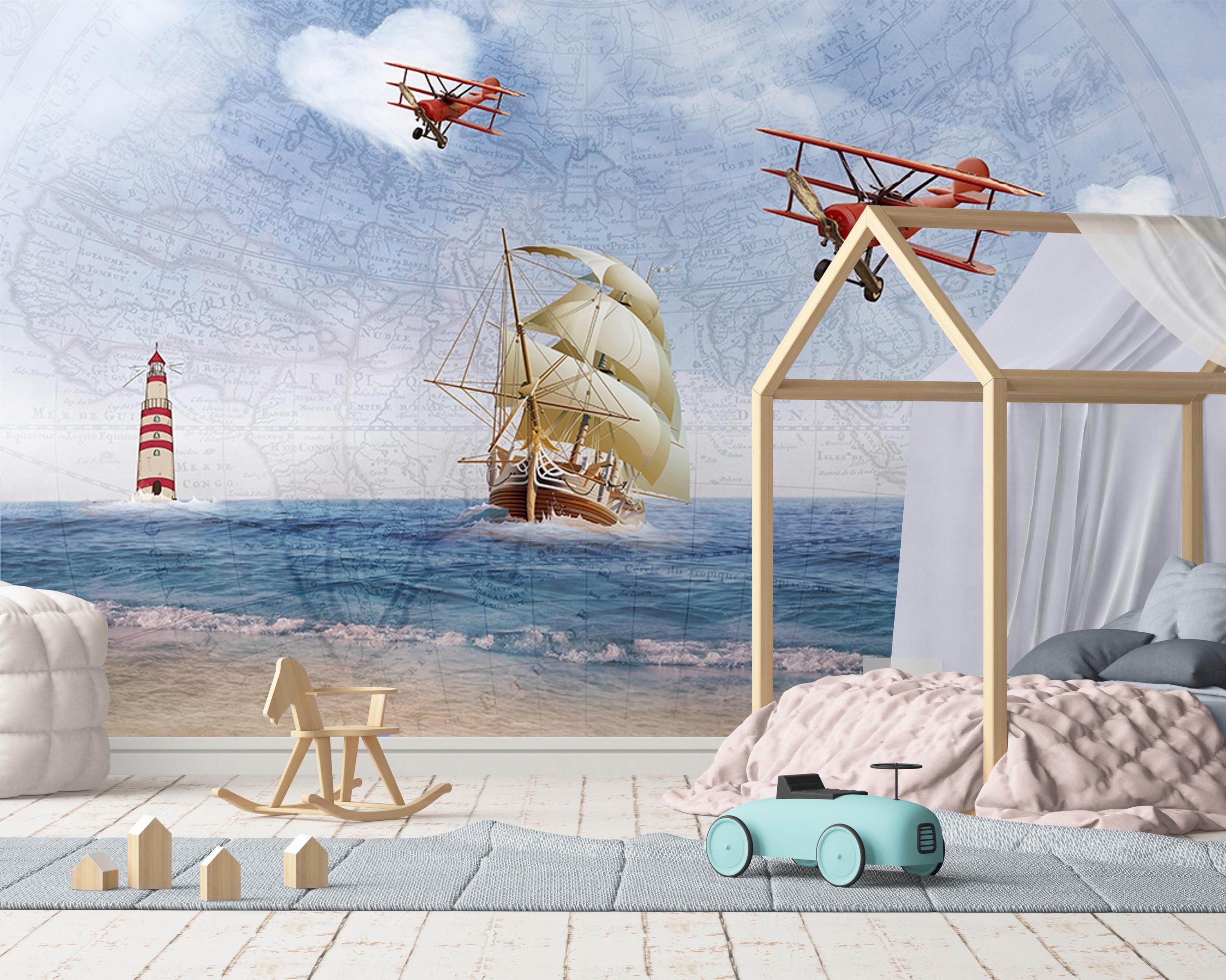 Nursery and Chil Room Wallpaper Air Baloon Plane Lighthouse and Sailboat Wall Mural Child Room Decoration