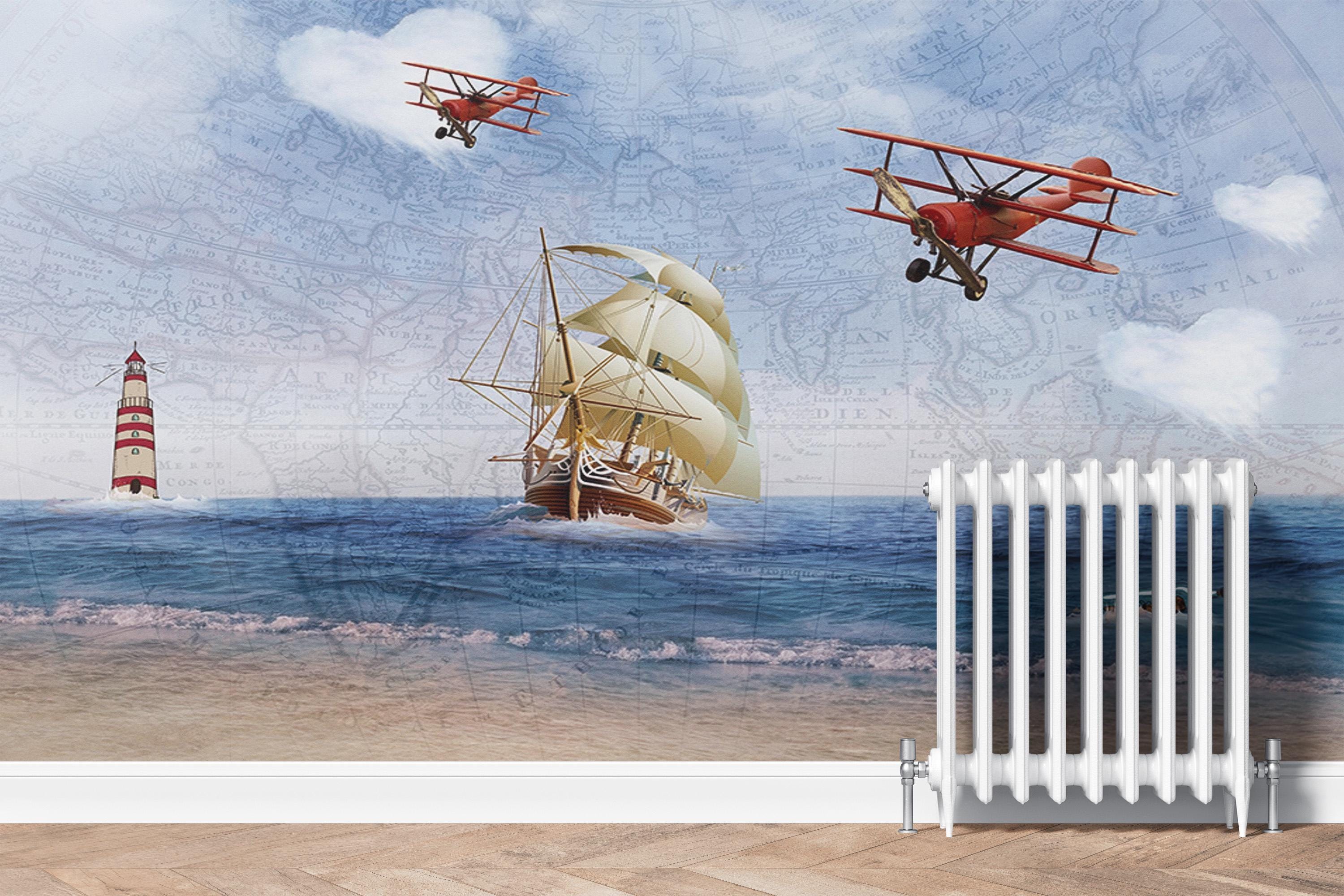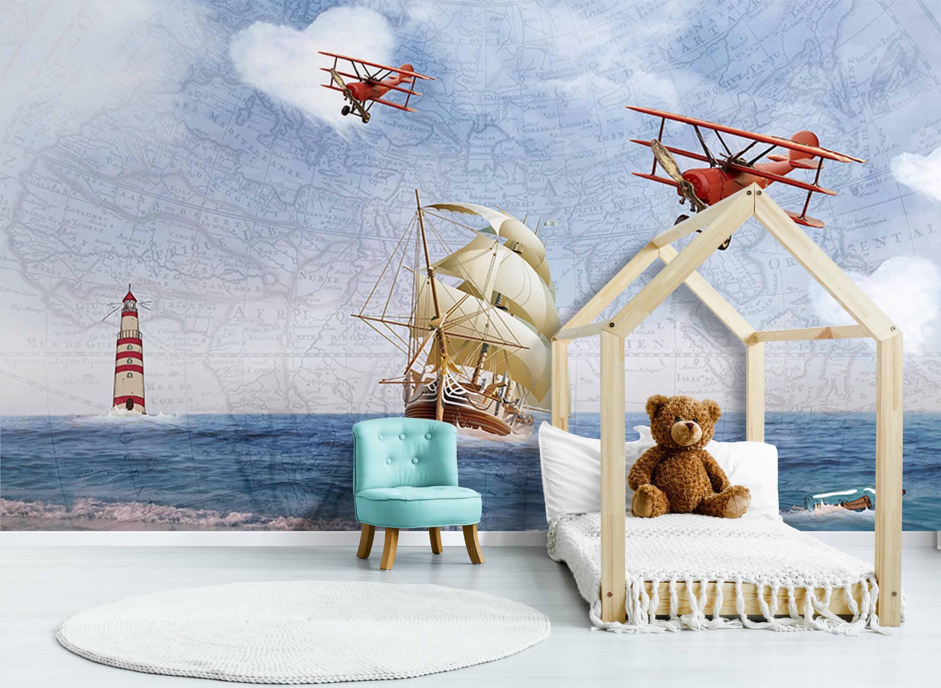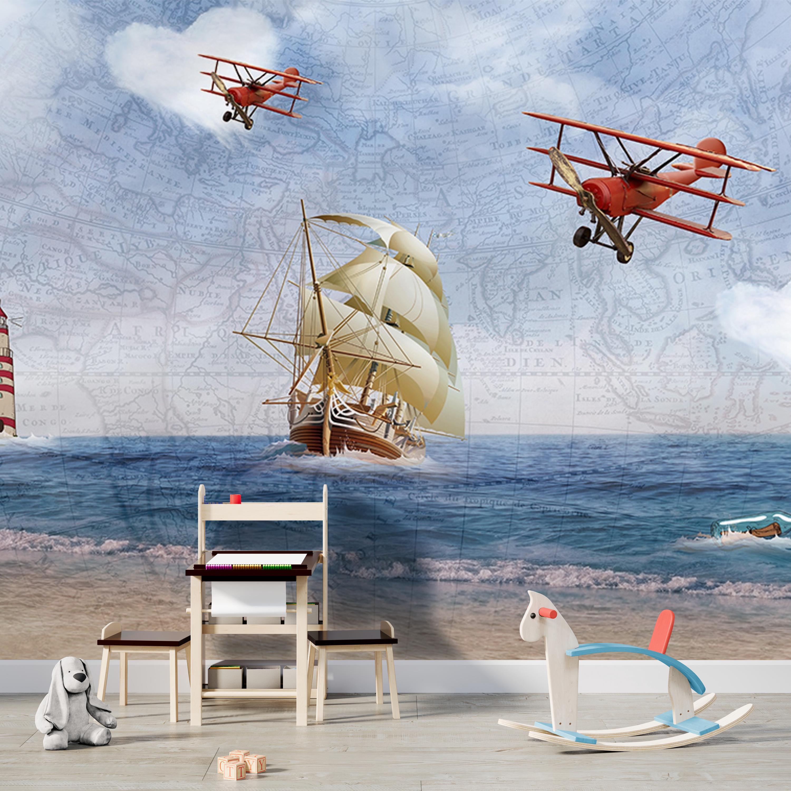 Nursery and Chil Room Wallpaper Air Baloon Plane Lighthouse and Sailboat Wall Mural Child Room Decoration