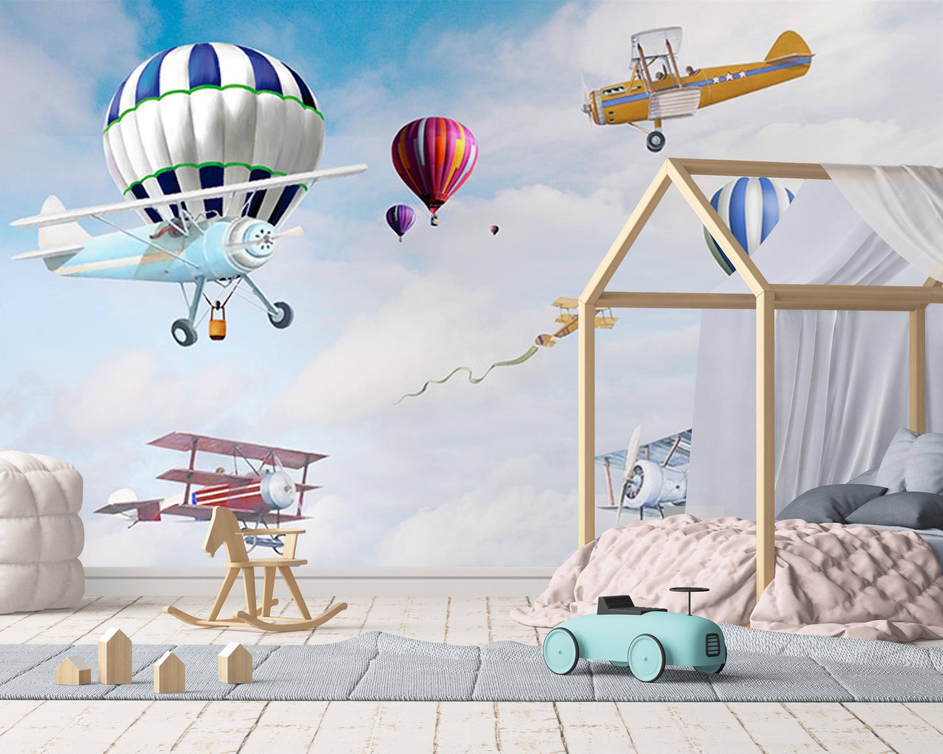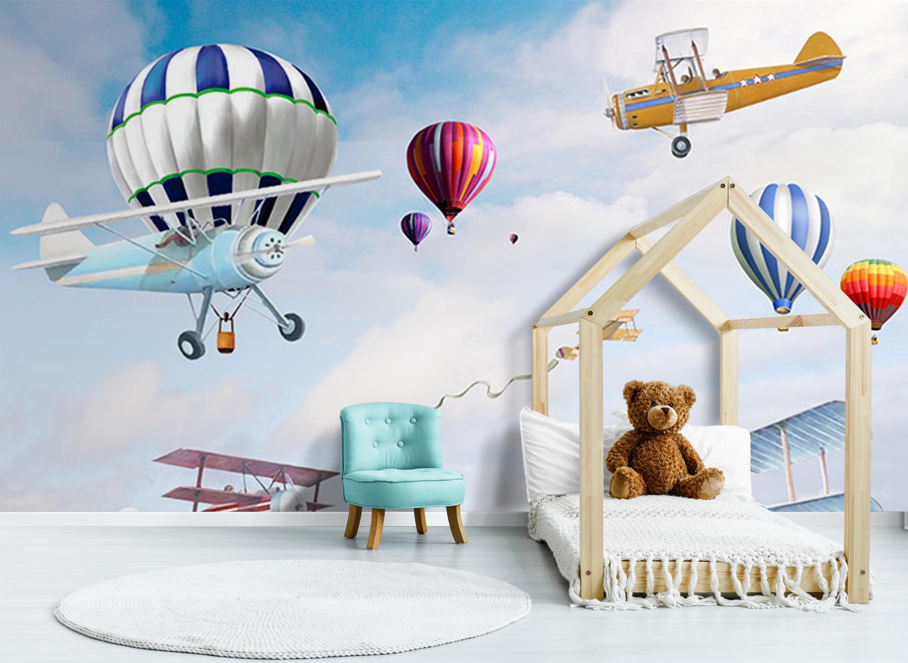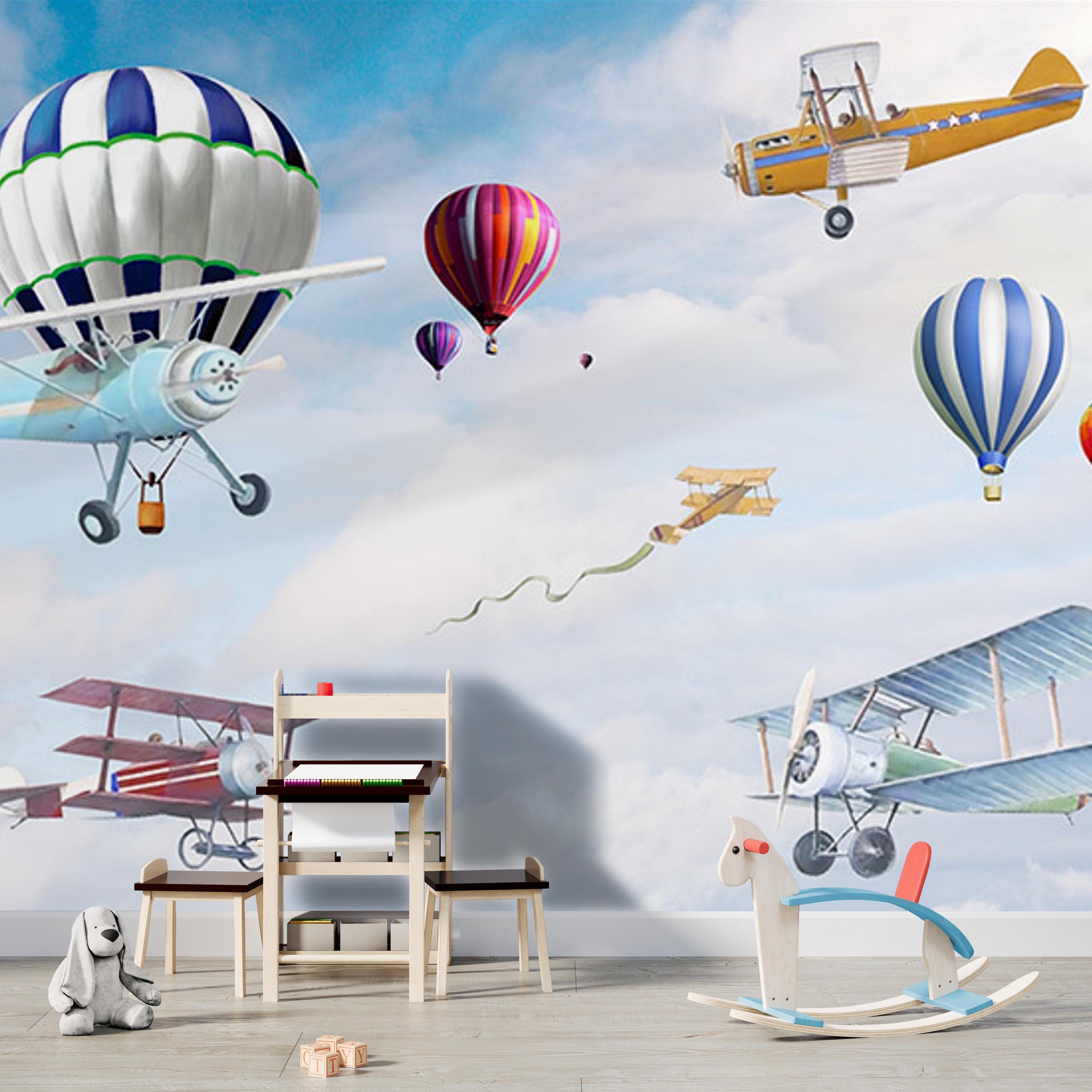 Our Kids Room Wall Mural featuring White Clouds, Planes, and Air Balloons is a playful and imaginative design perfect for a boys' room. This whimsical wall decal transforms the space with soft, dreamy clouds and fun air travel elements, sparking your child's imagination. Available in peel-and-stick or traditional non-woven materials, it’s easy to apply and remove. The mural features a 1-inch overlapping installation style, where the panels slightly overlap to create a smooth and seamless look. Whether you opt for the peel-and-stick version for simple installation or the non-woven option for a durable finish, this mural will bring a sense of adventure and wonder to your child’s room
