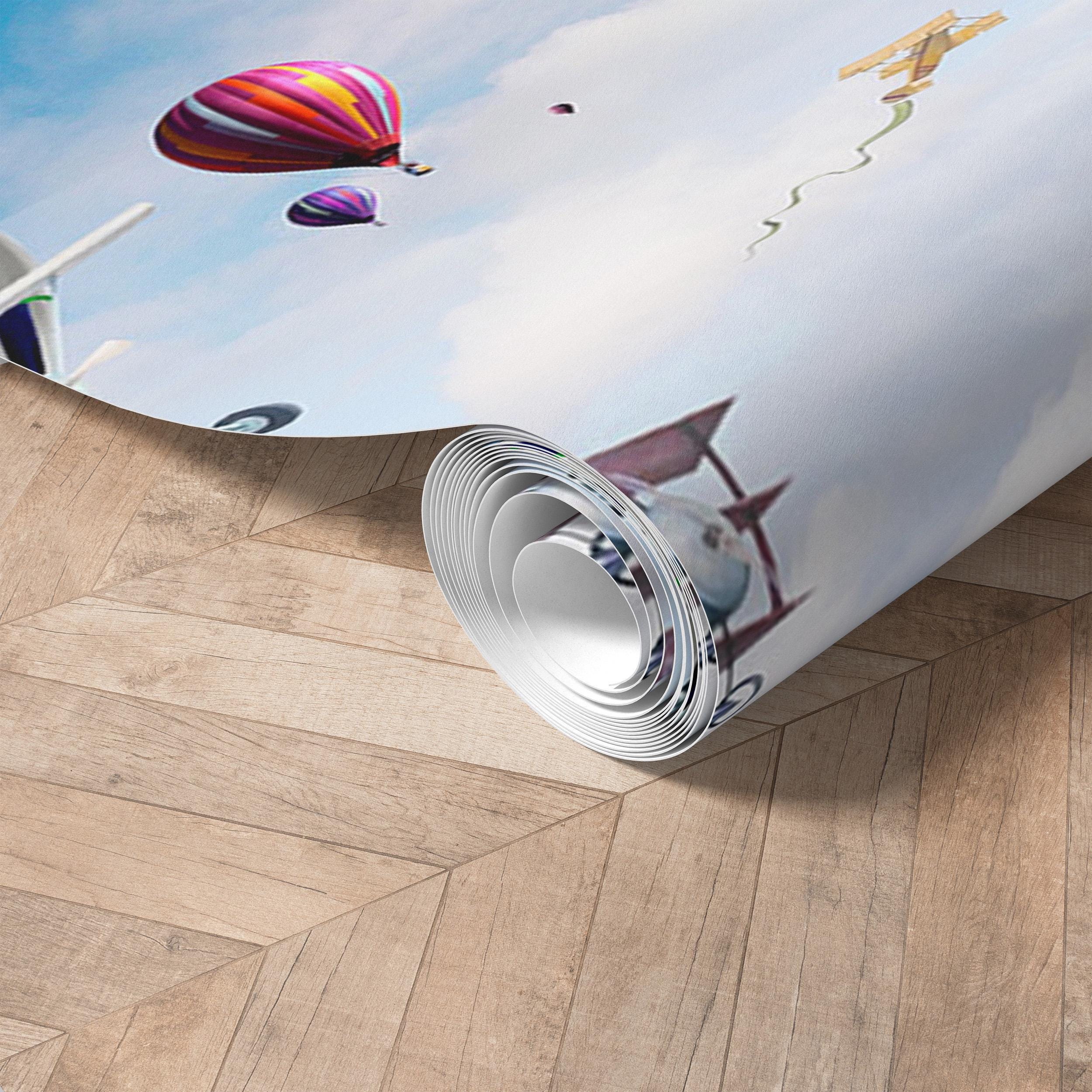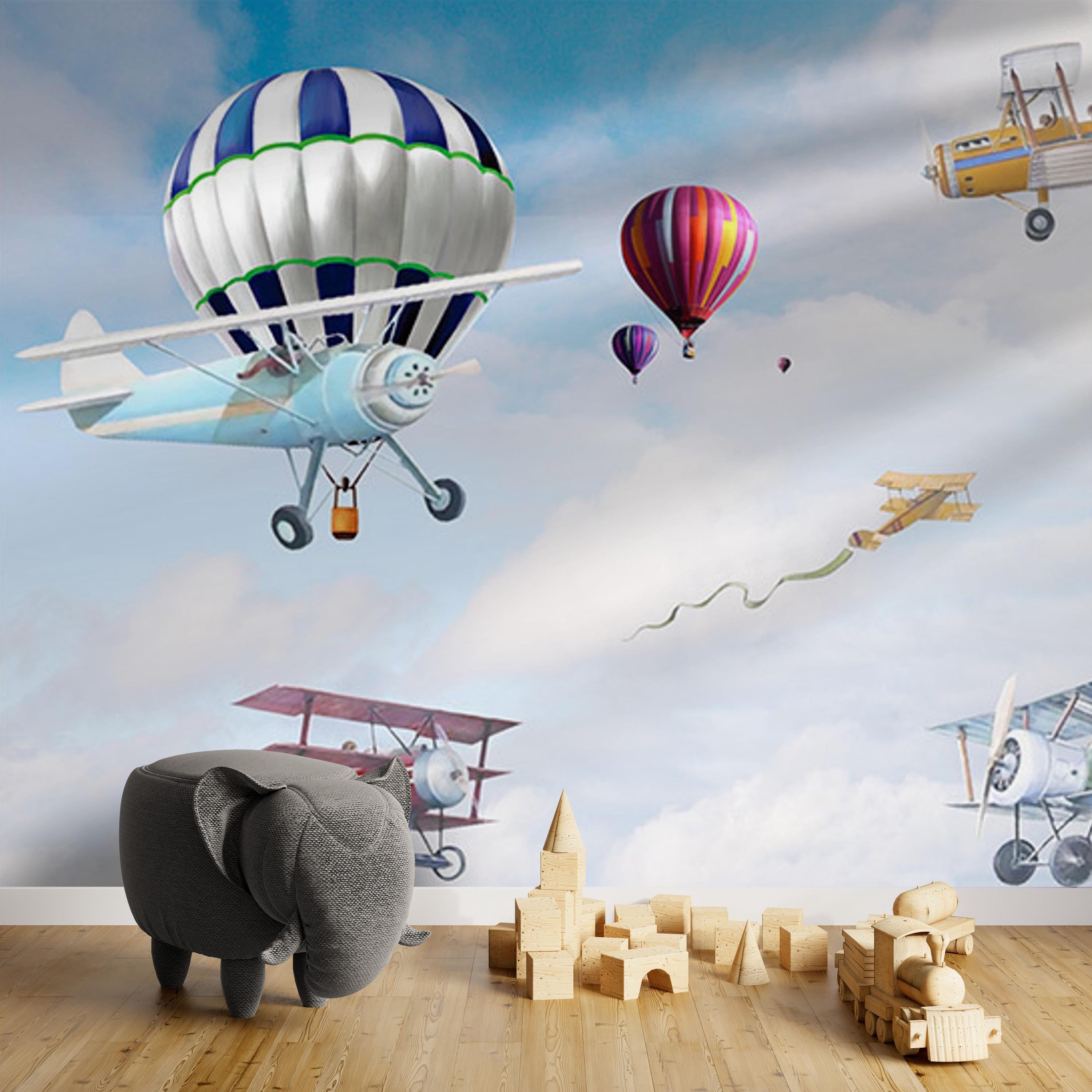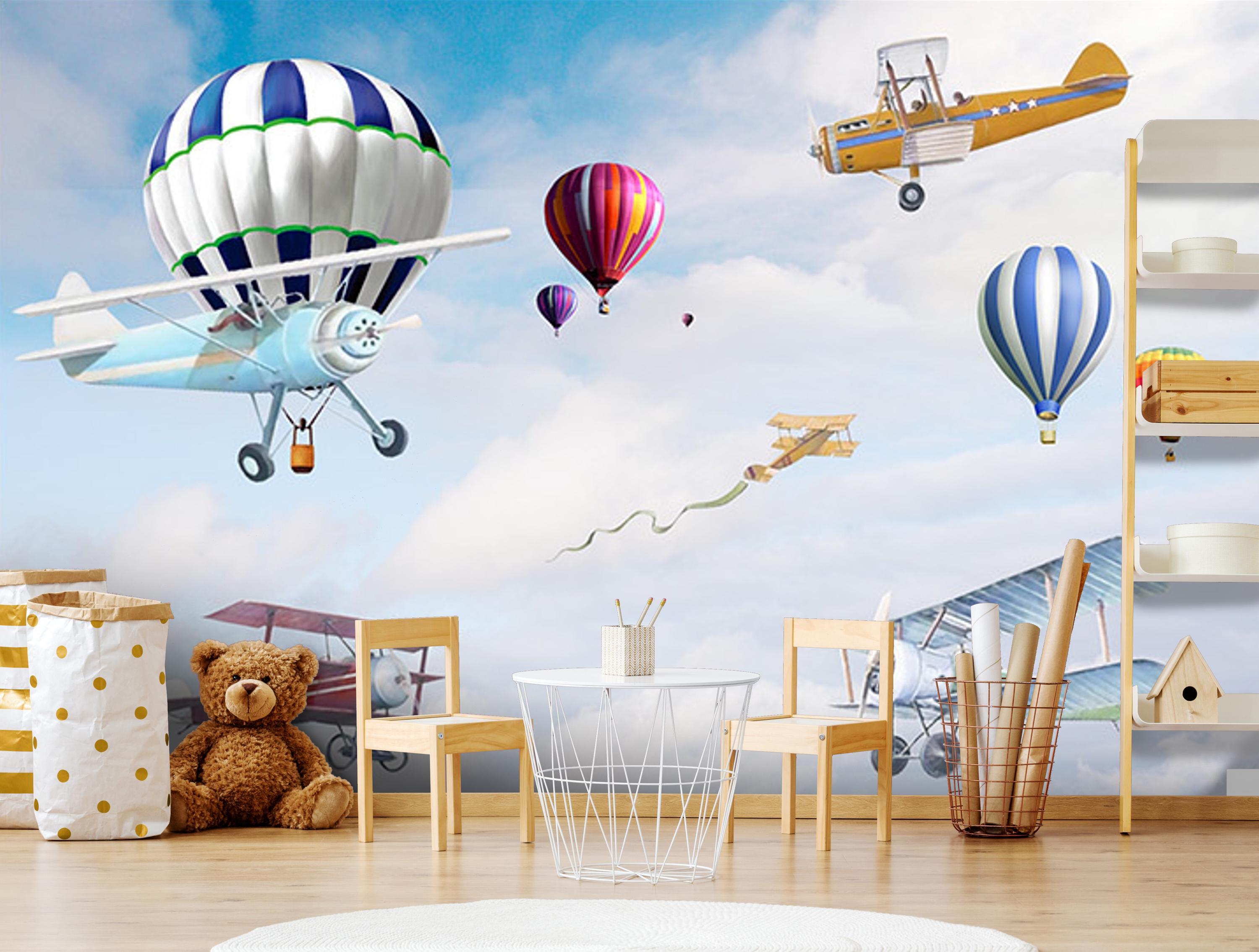 Our Kids Room Wall Mural featuring White Clouds, Planes, and Air Balloons is a playful and imaginative design perfect for a boys' room. This whimsical wall decal transforms the space with soft, dreamy clouds and fun air travel elements, sparking your child's imagination. Available in peel-and-stick or traditional non-woven materials, it’s easy to apply and remove. The mural features a 1-inch overlapping installation style, where the panels slightly overlap to create a smooth and seamless look. Whether you opt for the peel-and-stick version for simple installation or the non-woven option for a durable finish, this mural will bring a sense of adventure and wonder to your child’s room
