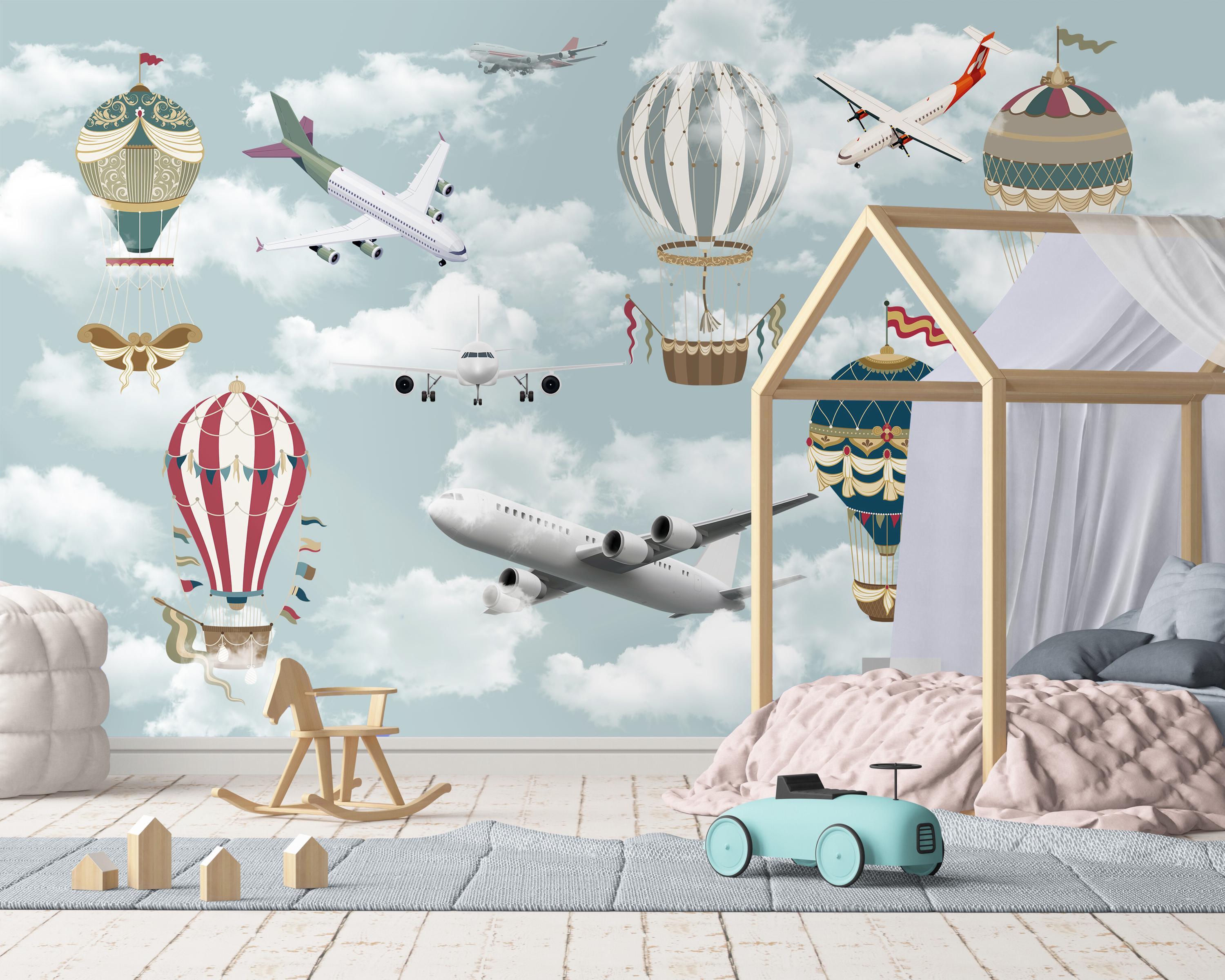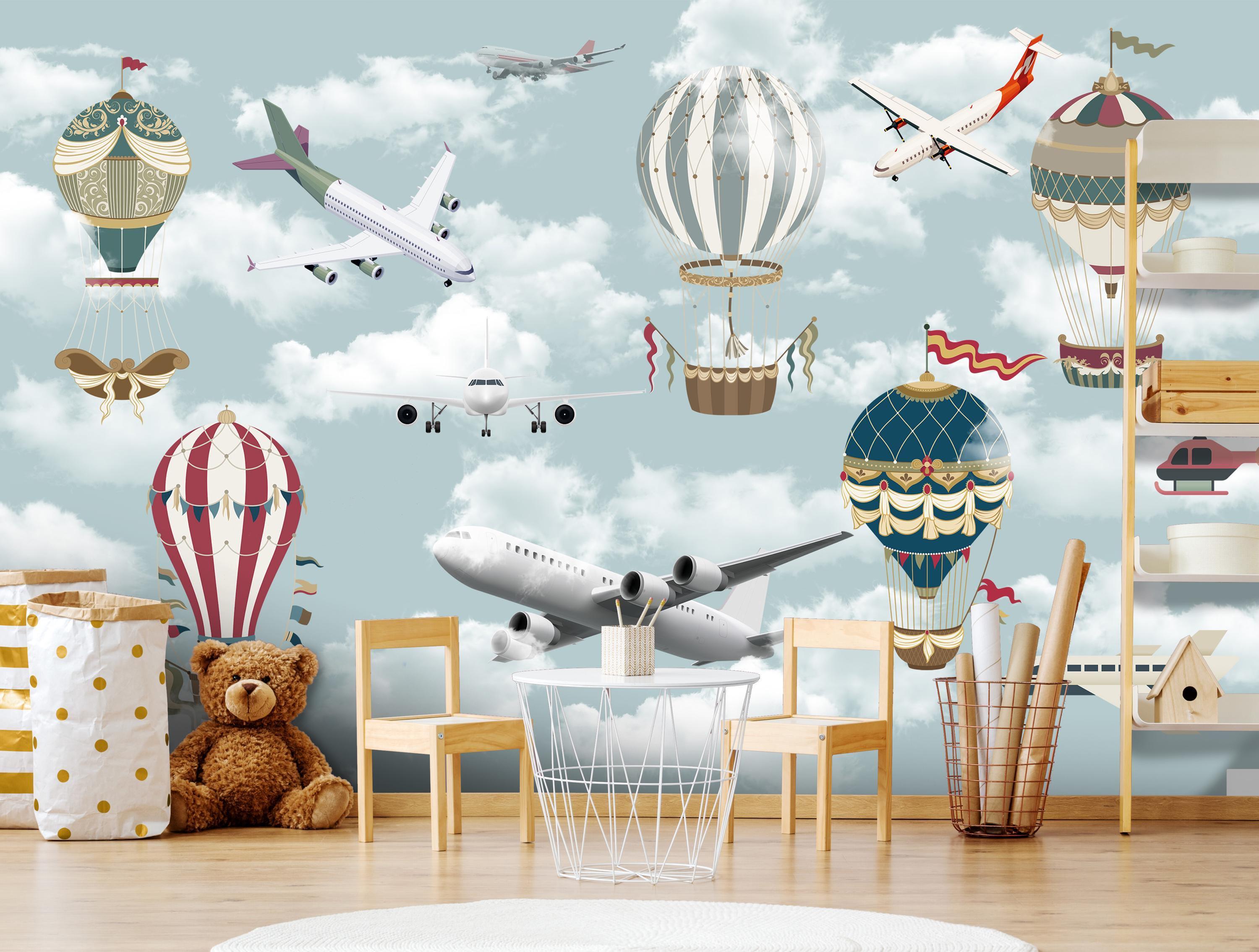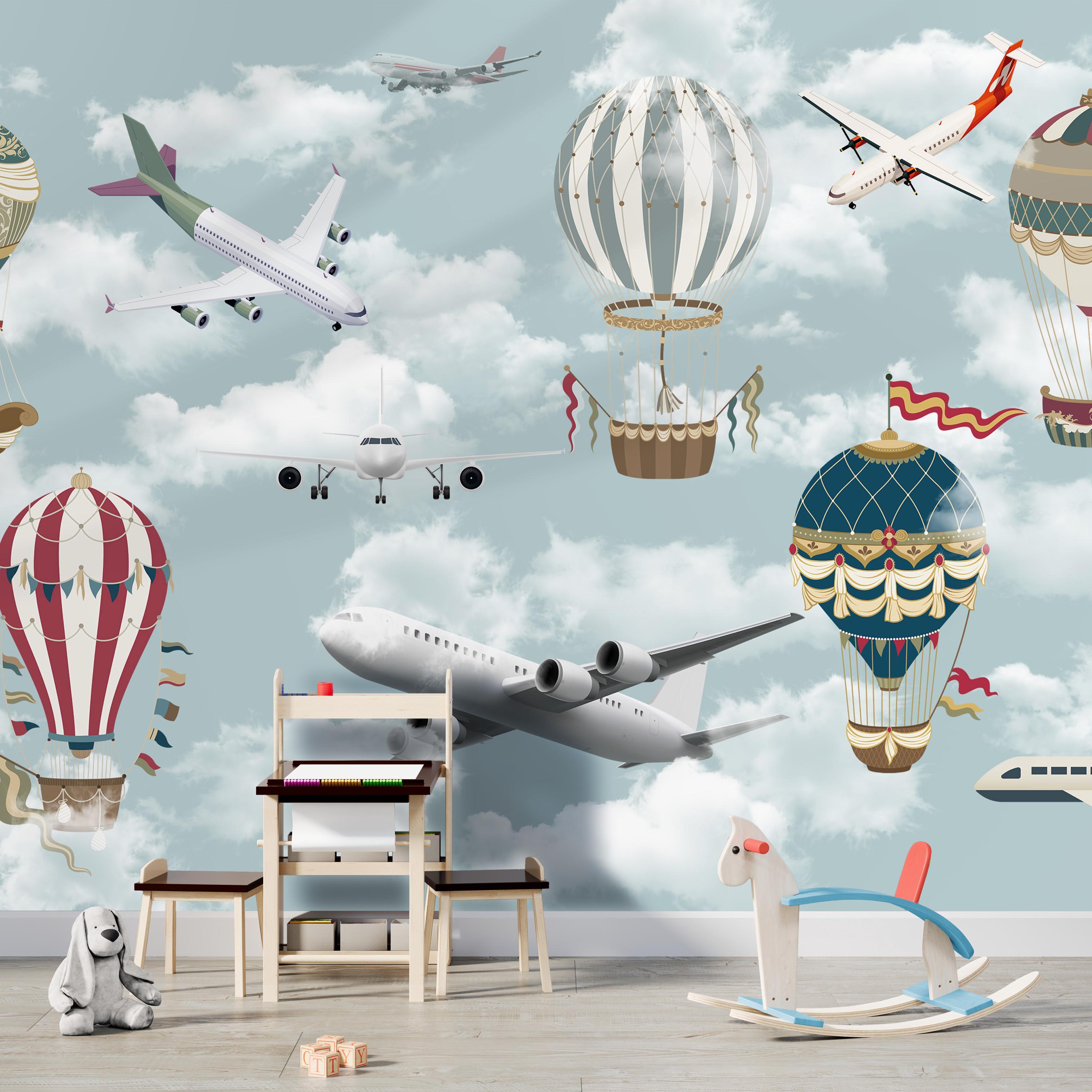 Transform your child's room with our Custom Size Blue Sky Wallpaper, featuring air balloons, planes, and fluffy white clouds. This delightful mural creates a dreamy, sky-high adventure, perfect for nurseries and kids' rooms. Available in peel-and-stick for easy application and removal, it’s a hassle-free way to bring a playful and uplifting atmosphere to any space.