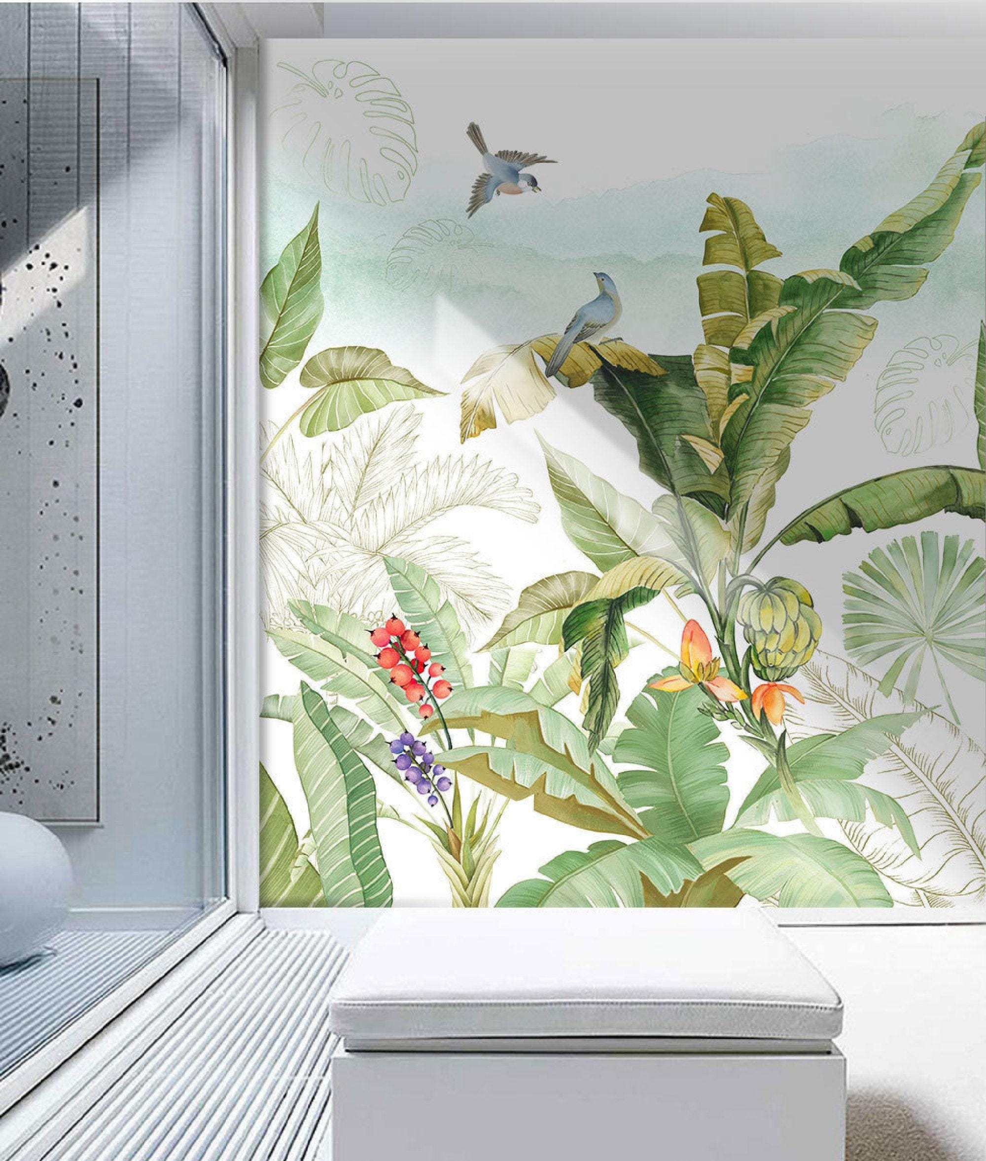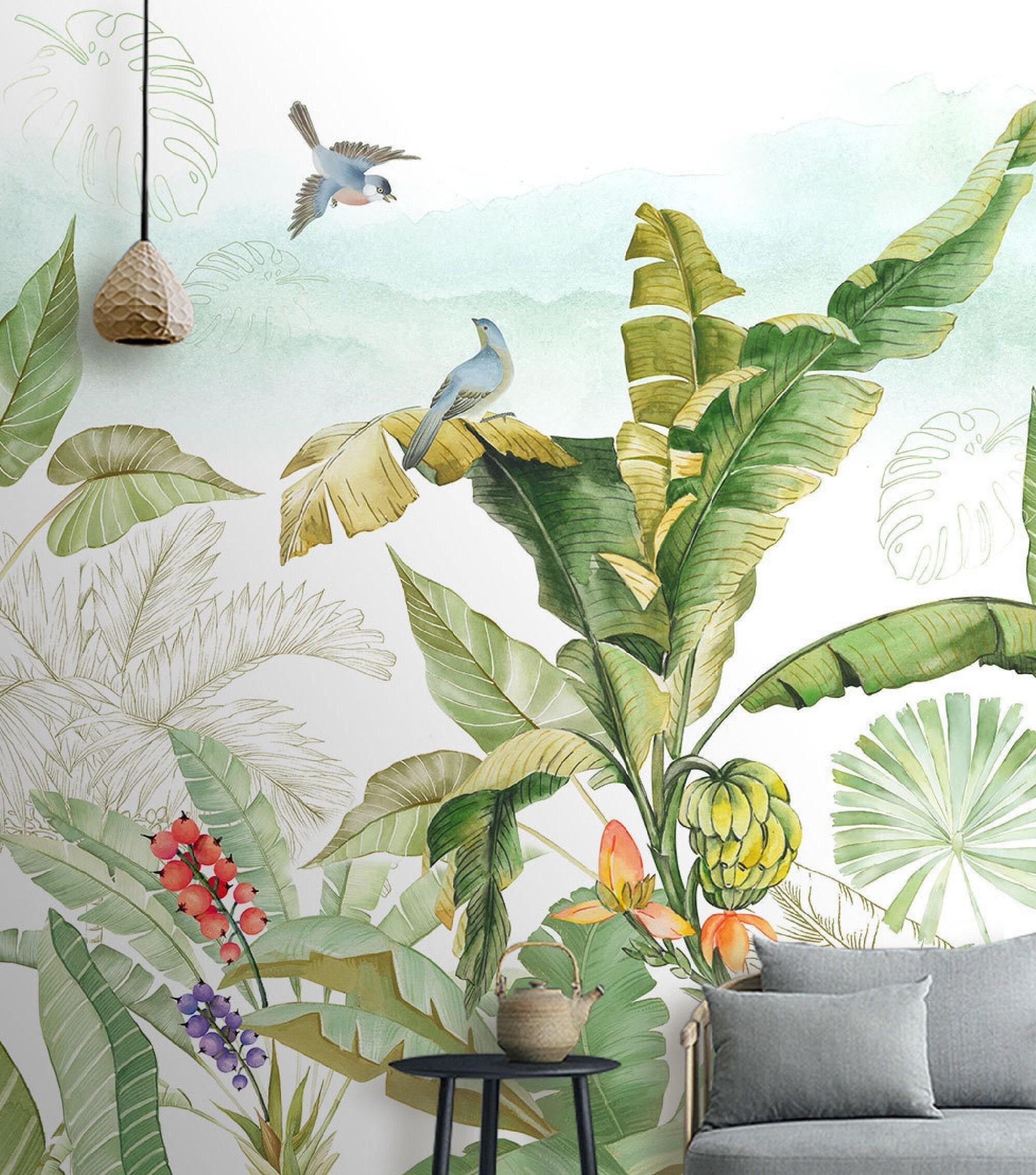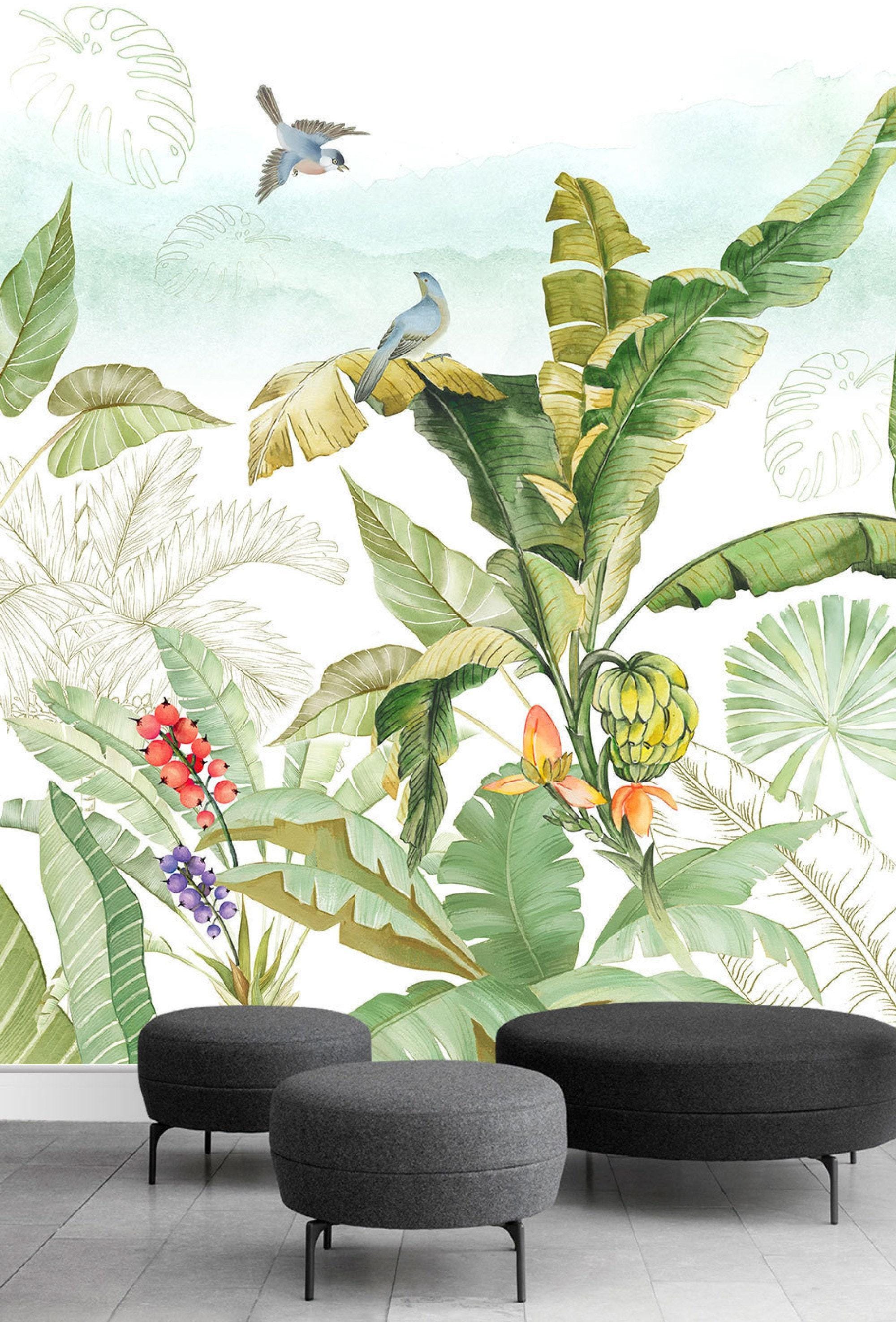 Bring the freshness of the tropics into your home with this vibrant tropical jungle wallpaper mural. Featuring lush banana leaves, colorful birds, exotic fruits, and watercolor-style greenery, this design adds life and natural beauty to any room. Ideal for living rooms, nurseries, or sunrooms, the mural blends modern artistry with botanical charm. Custom sizes available to suit your wall perfectly. Sample available for testing. Colors: Green, Yellow, Blue, Red, White.