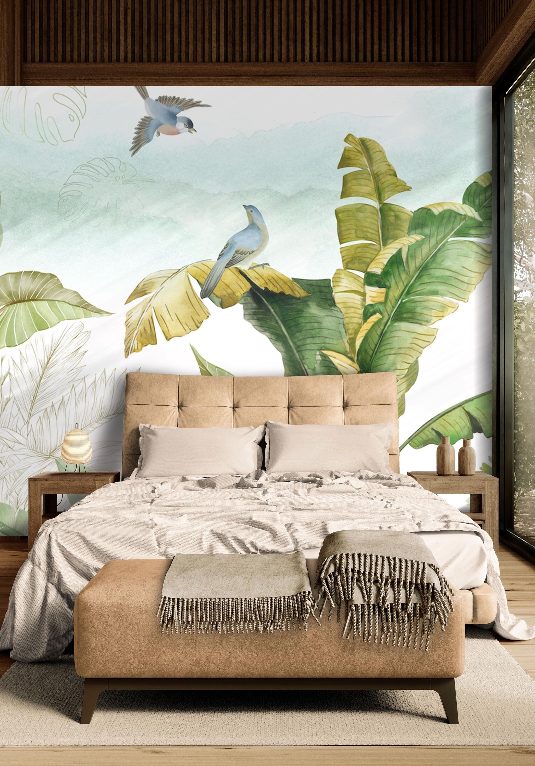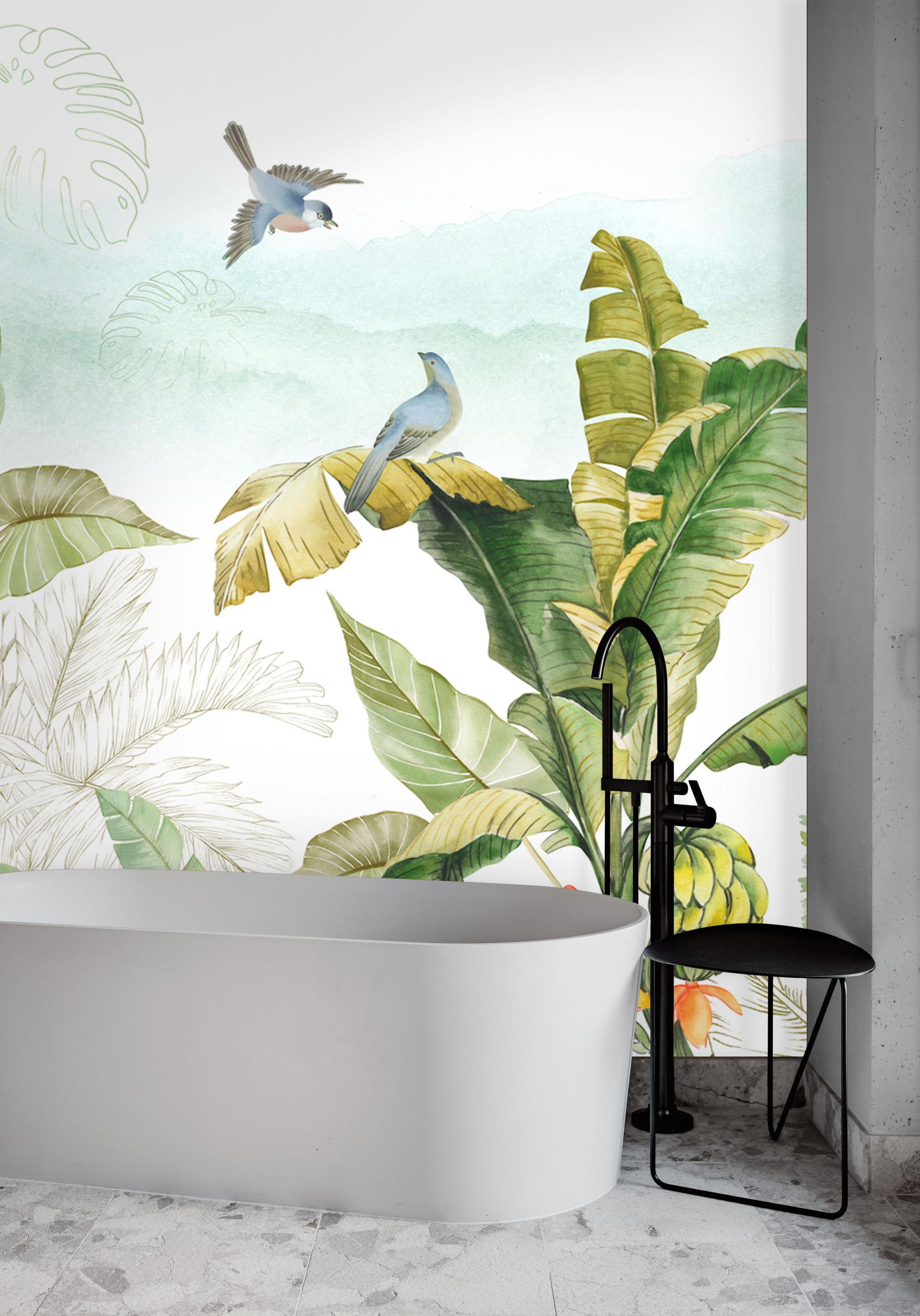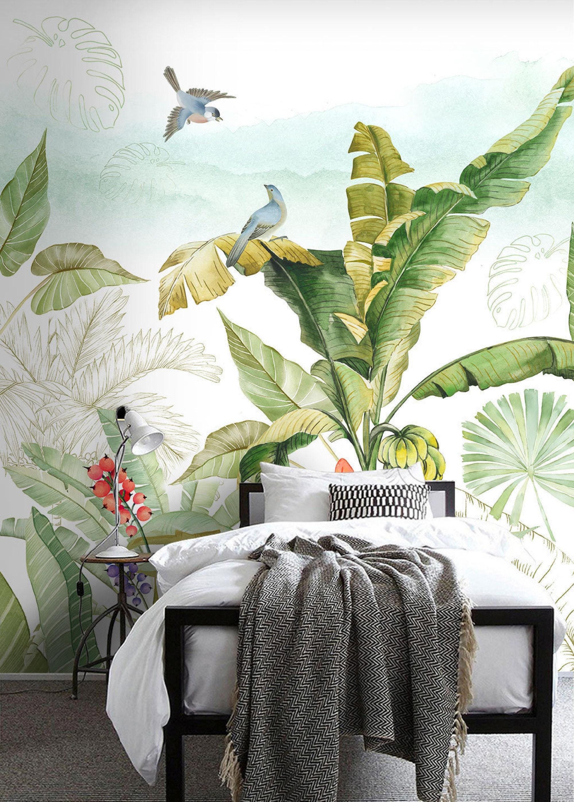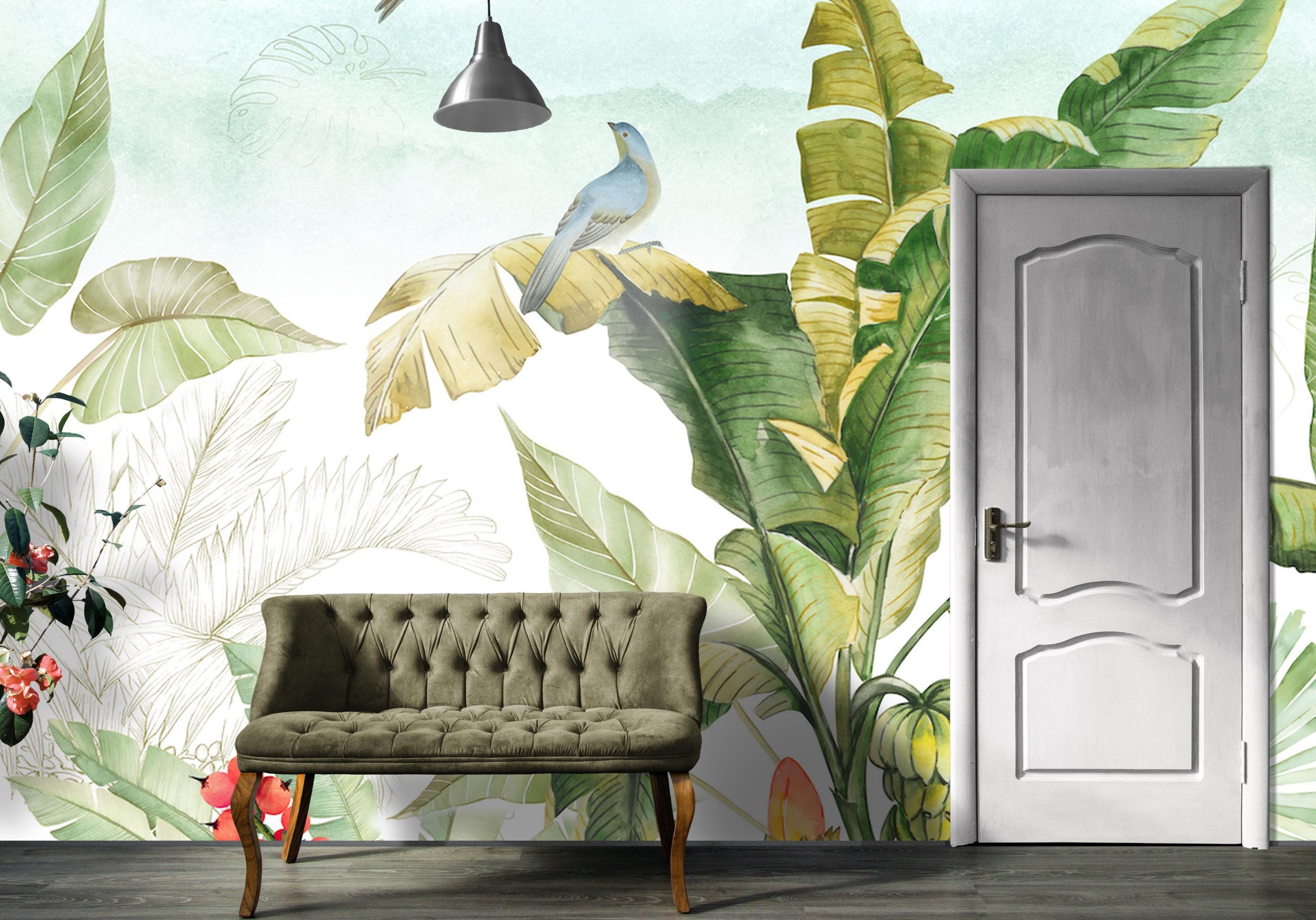 Bring the freshness of the tropics into your home with this vibrant tropical jungle wallpaper mural. Featuring lush banana leaves, colorful birds, exotic fruits, and watercolor-style greenery, this design adds life and natural beauty to any room. Ideal for living rooms, nurseries, or sunrooms, the mural blends modern artistry with botanical charm. Custom sizes available to suit your wall perfectly. Sample available for testing. Colors: Green, Yellow, Blue, Red, White.