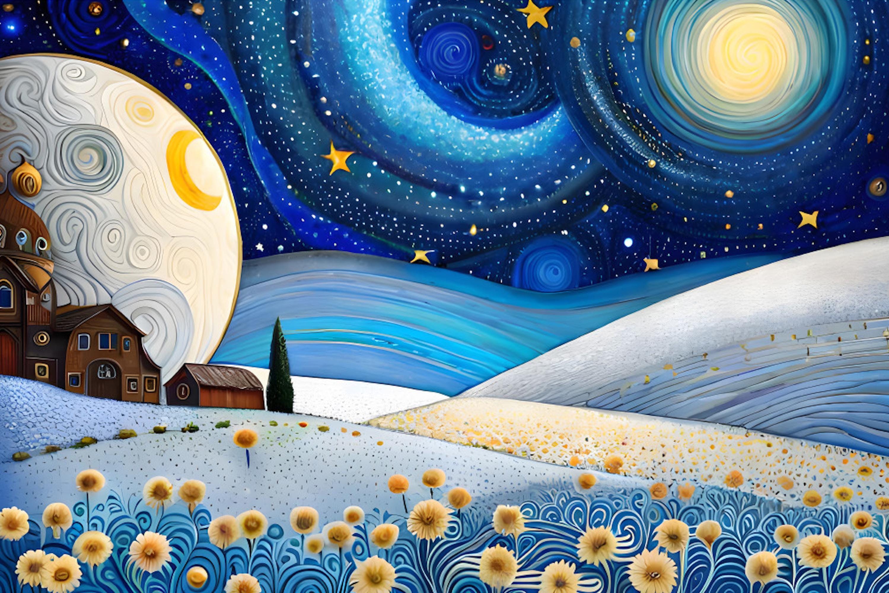 Our Custom Van Gogh-Style Children's Room Wallpaper brings a dreamy and artistic touch to your little one's space. Inspired by the iconic swirling night skies, this peel-and-stick mural creates a magical atmosphere with its starry sky and moon design, perfect for nurseries, kids' rooms, or play areas.