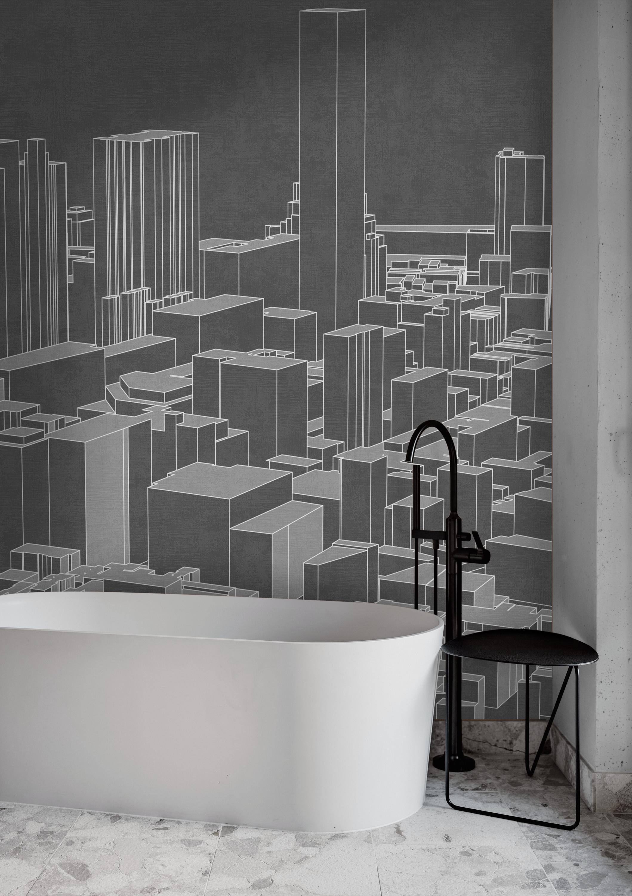 Chalkboard City Blueprint Wall Mural, Dark Charcoal Skyline Peel and Stick Wallpaper for Modern Office Décor, Custom Size Available