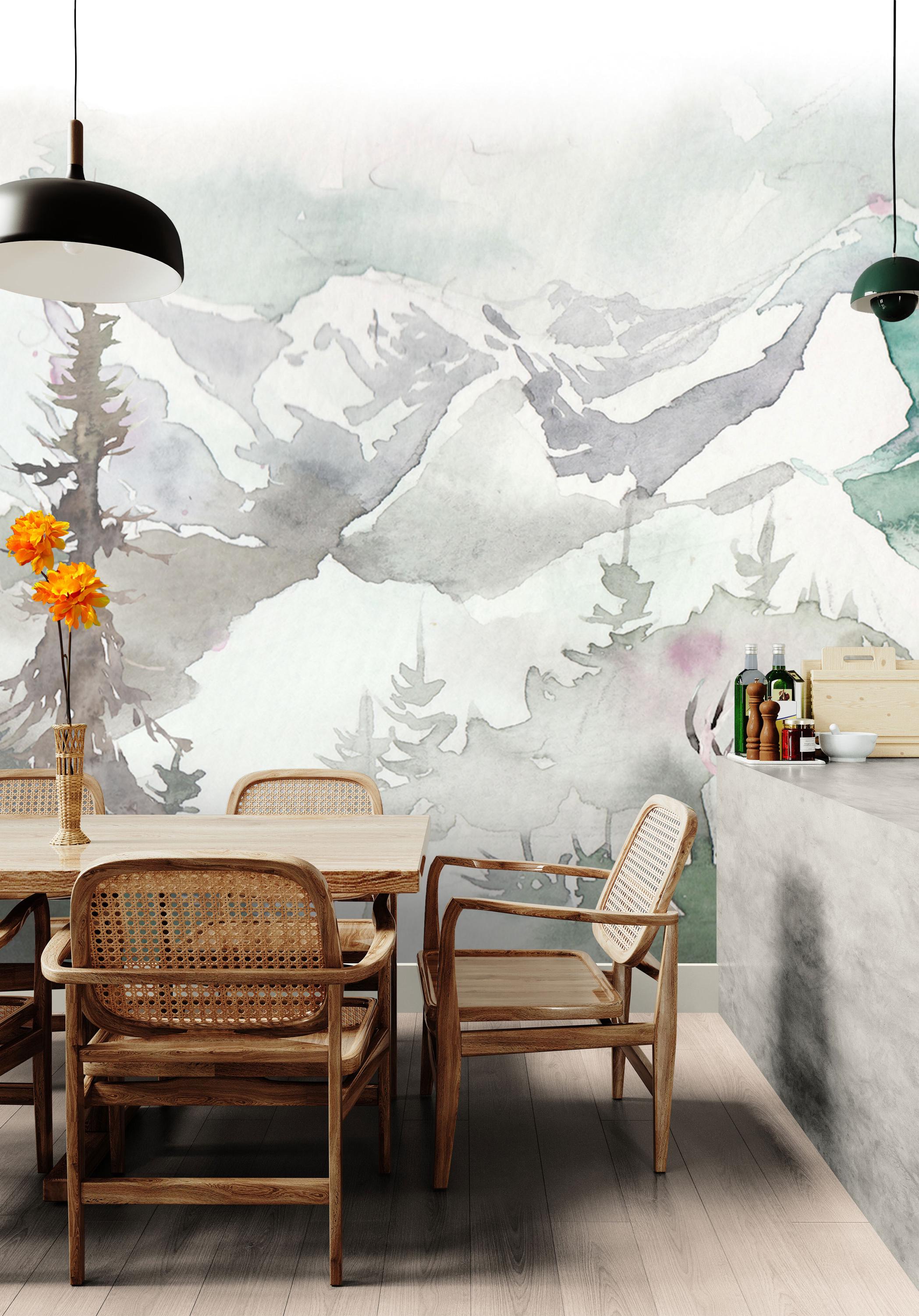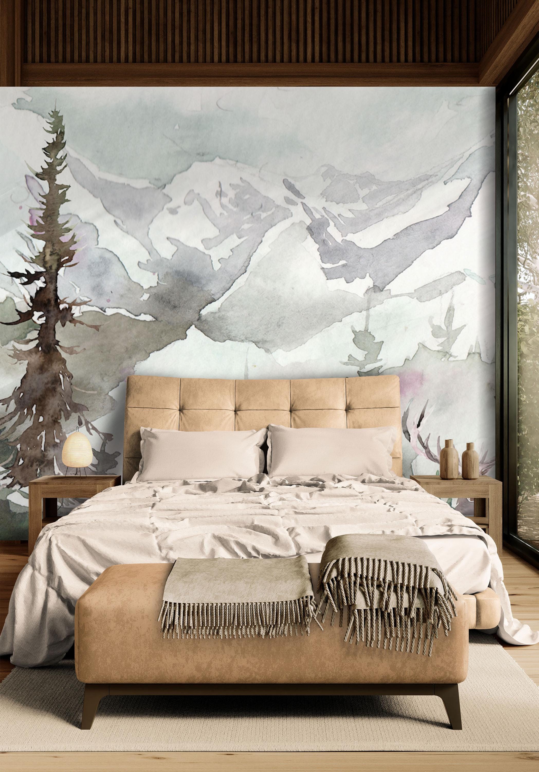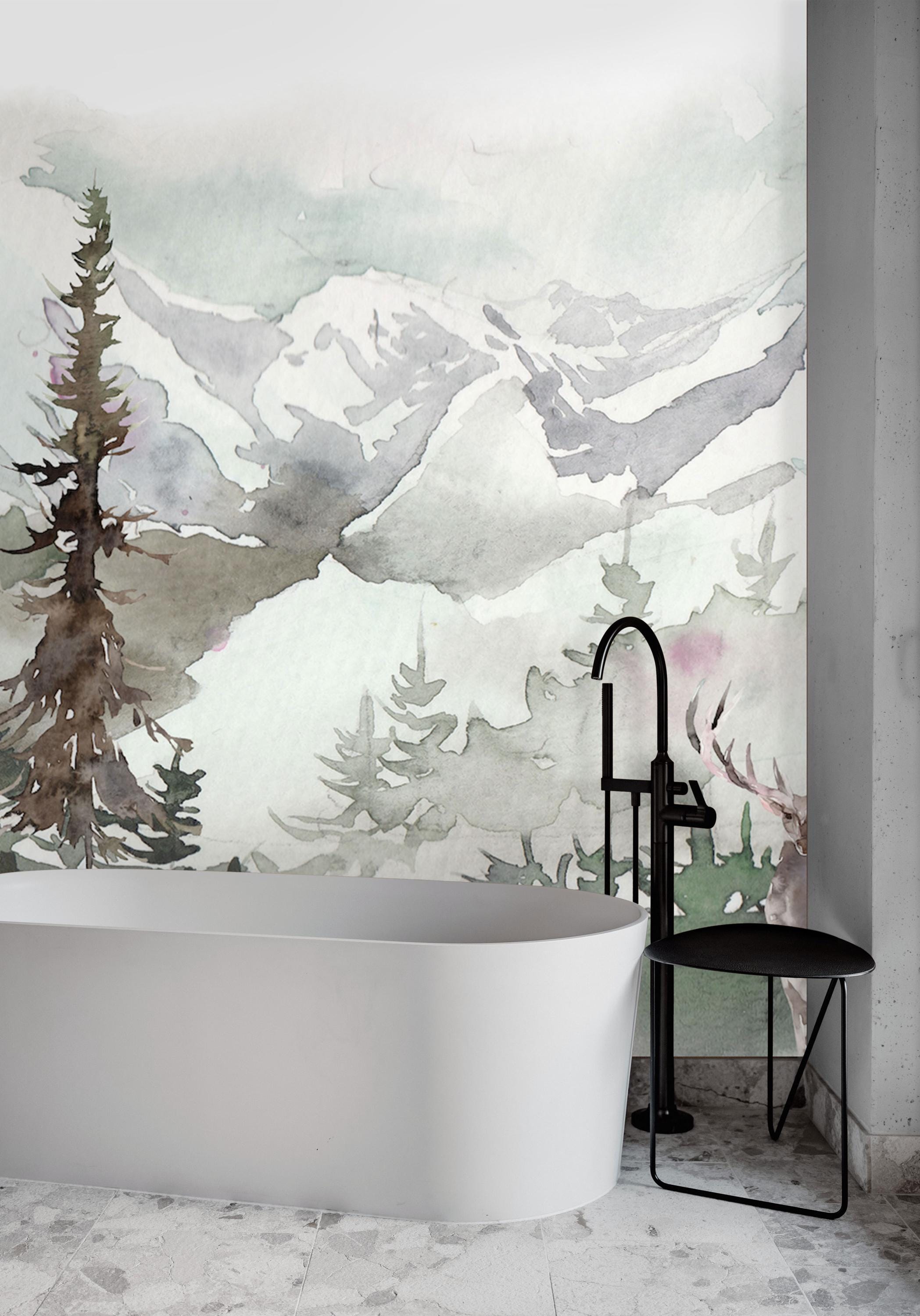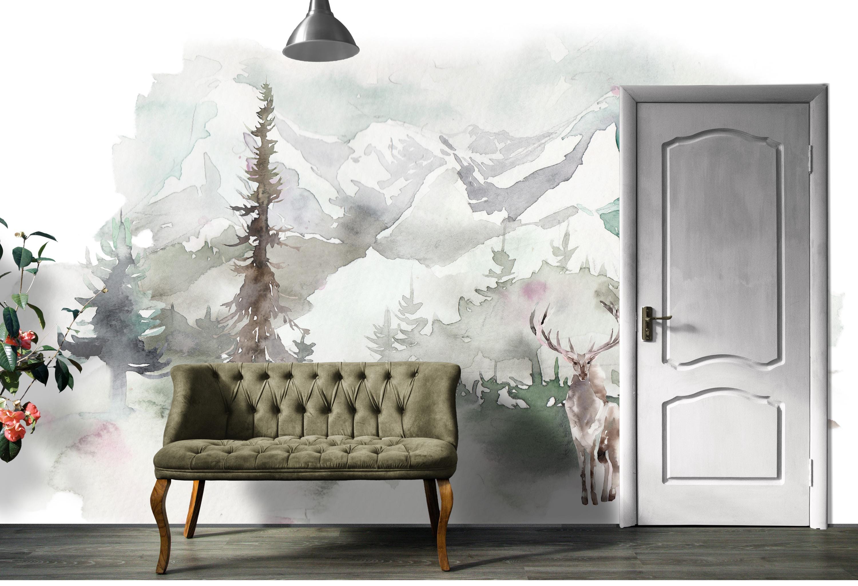 Create a serene retreat in your home with this watercolor forest wallpaper mural featuring a majestic deer, evergreen trees, and distant mountains. The hand-painted effect brings a calming, artistic touch to entryways, living rooms, cabins, and nature-themed interiors. Made from premium peel and stick material, it’s easy to install and renter-friendly.