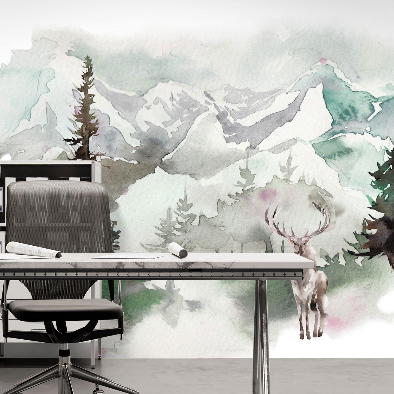 Watercolor-style forest mural with deer and mountains