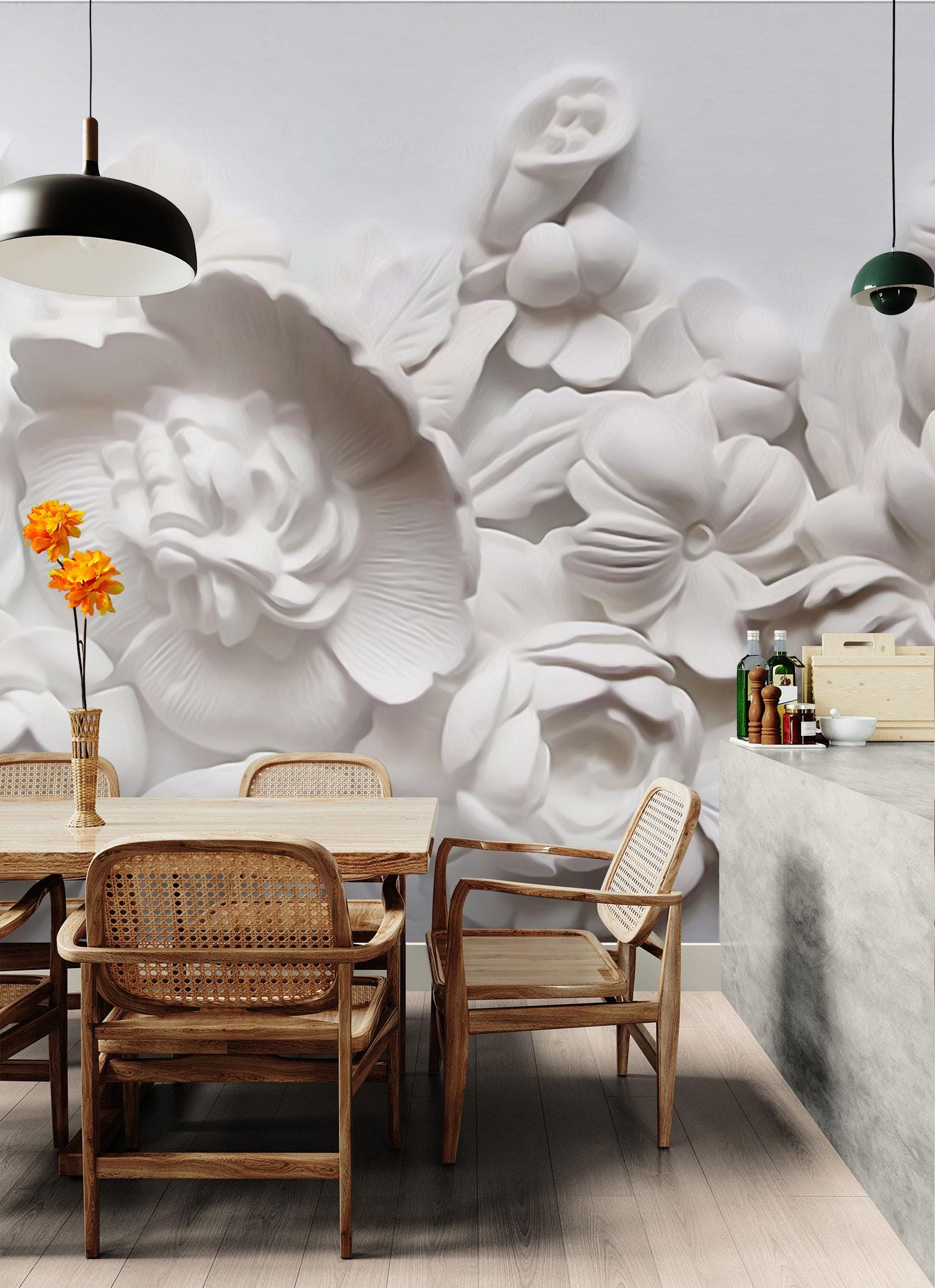 Create an eye-catching feature wall with this gorgeous floral wall mural. The oversized flowers in 3d effects will add a touch of whimsy and charm to any room.
