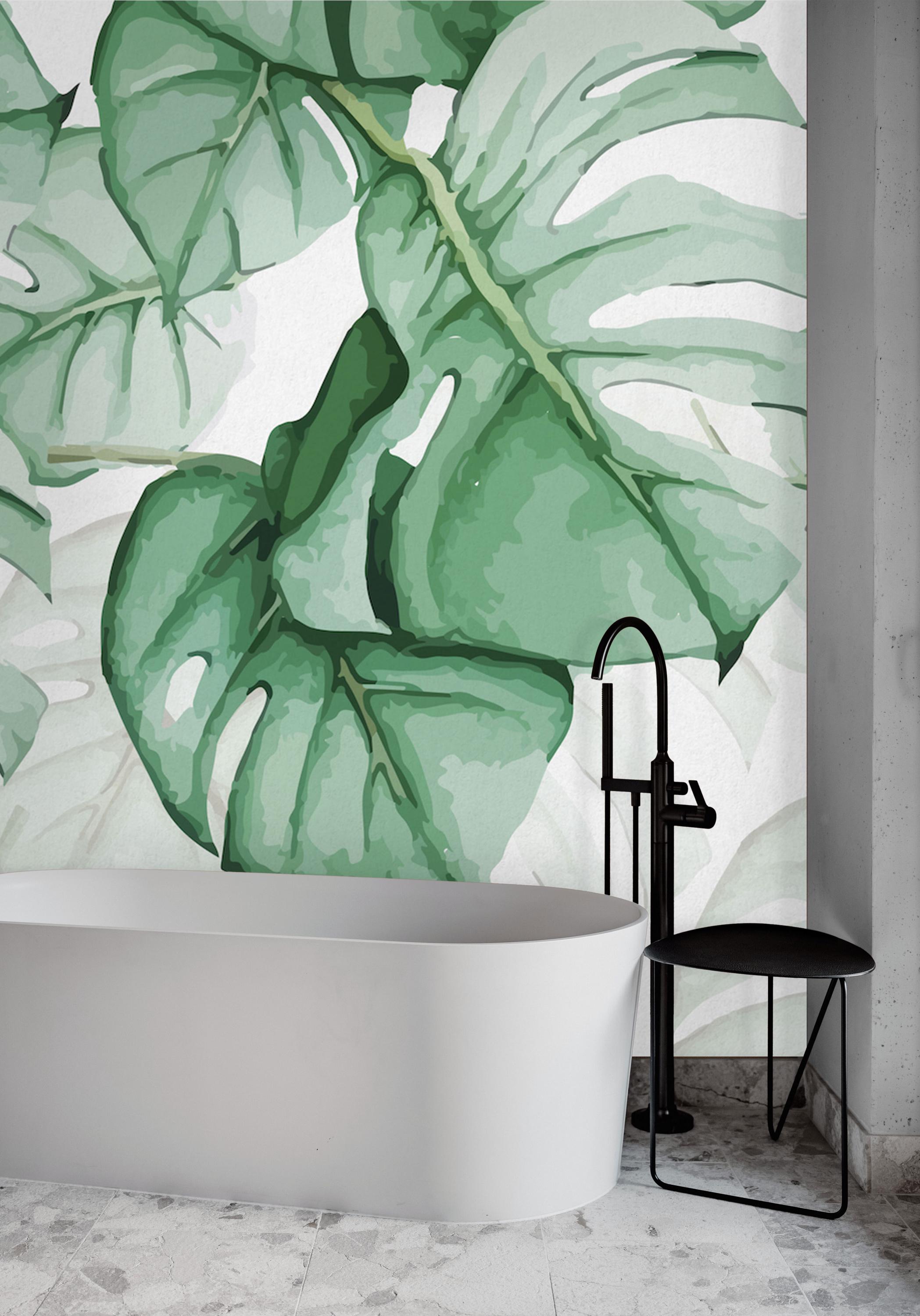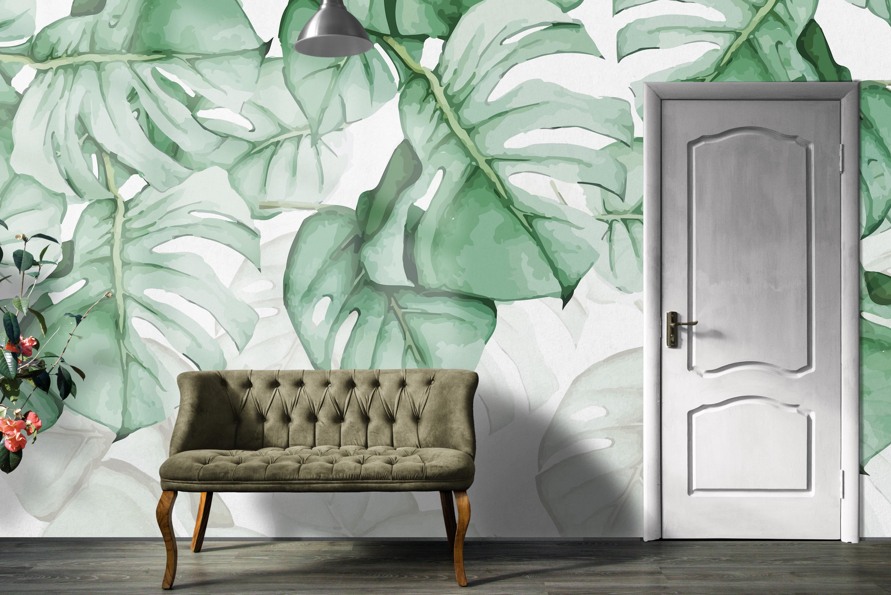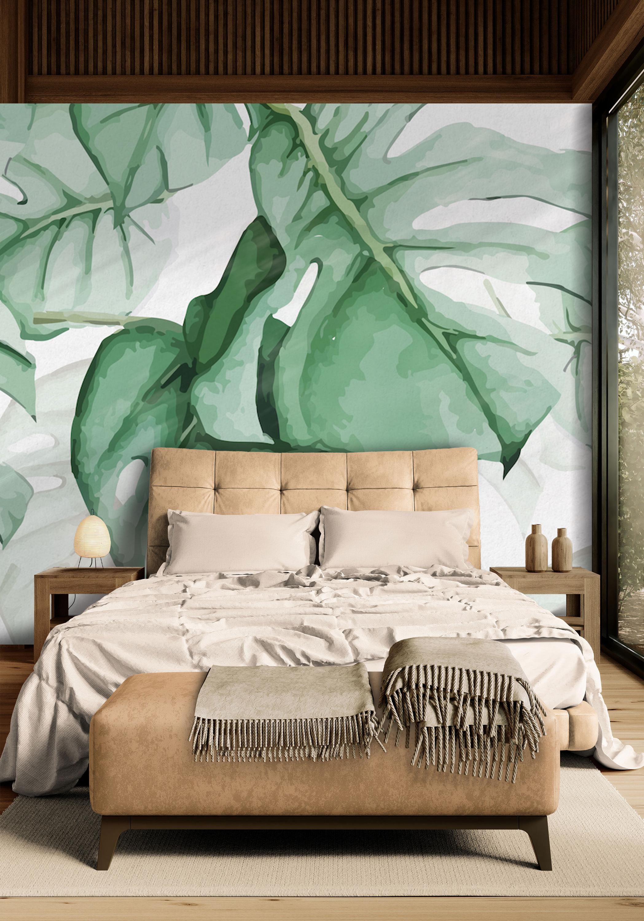 Monstera Leaf Wall Mural, Watercolor Tropical Wallpaper, Green Botanical Peel and Stick Accent Wall for Bedroom, Office or Bathroom Decor