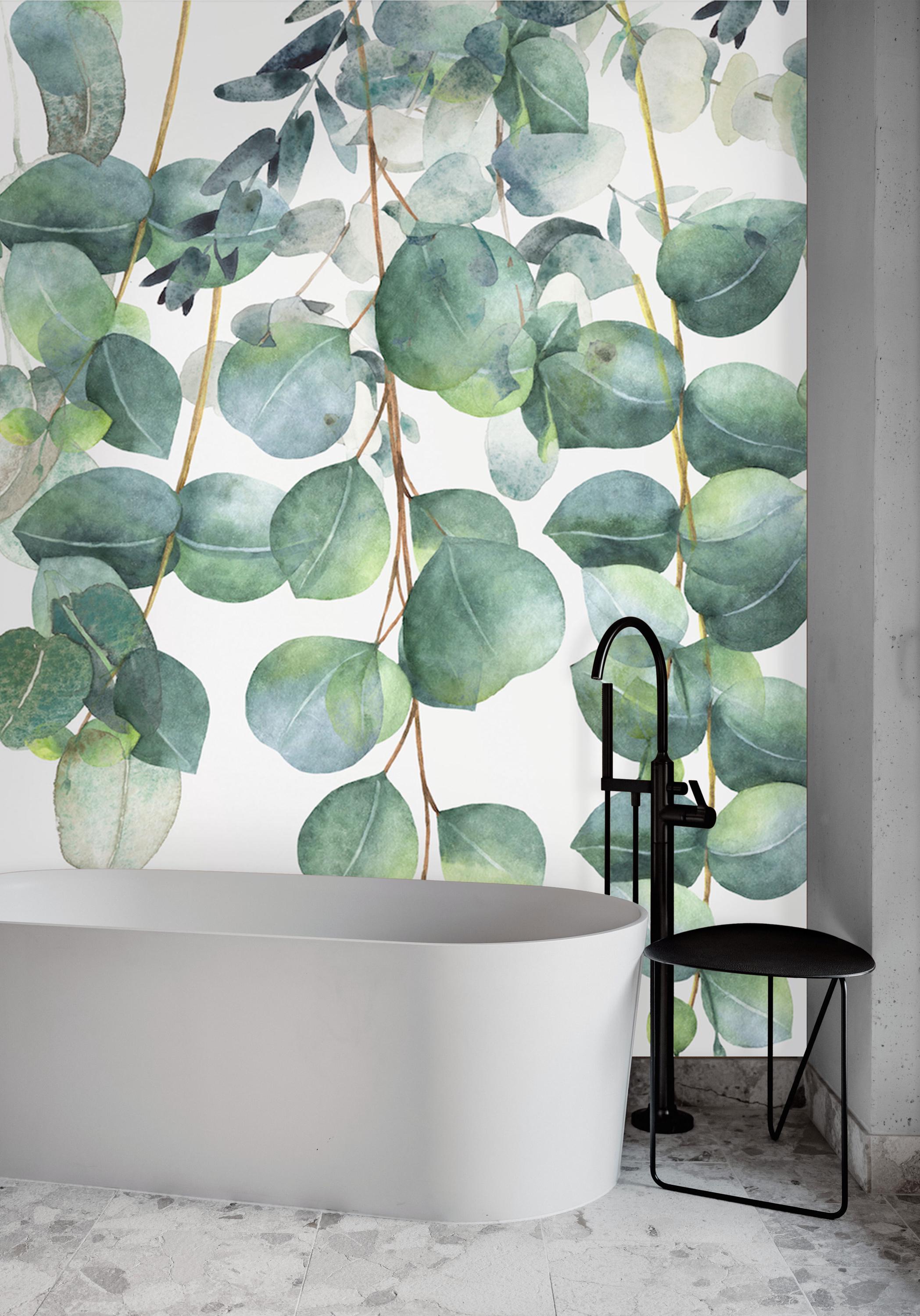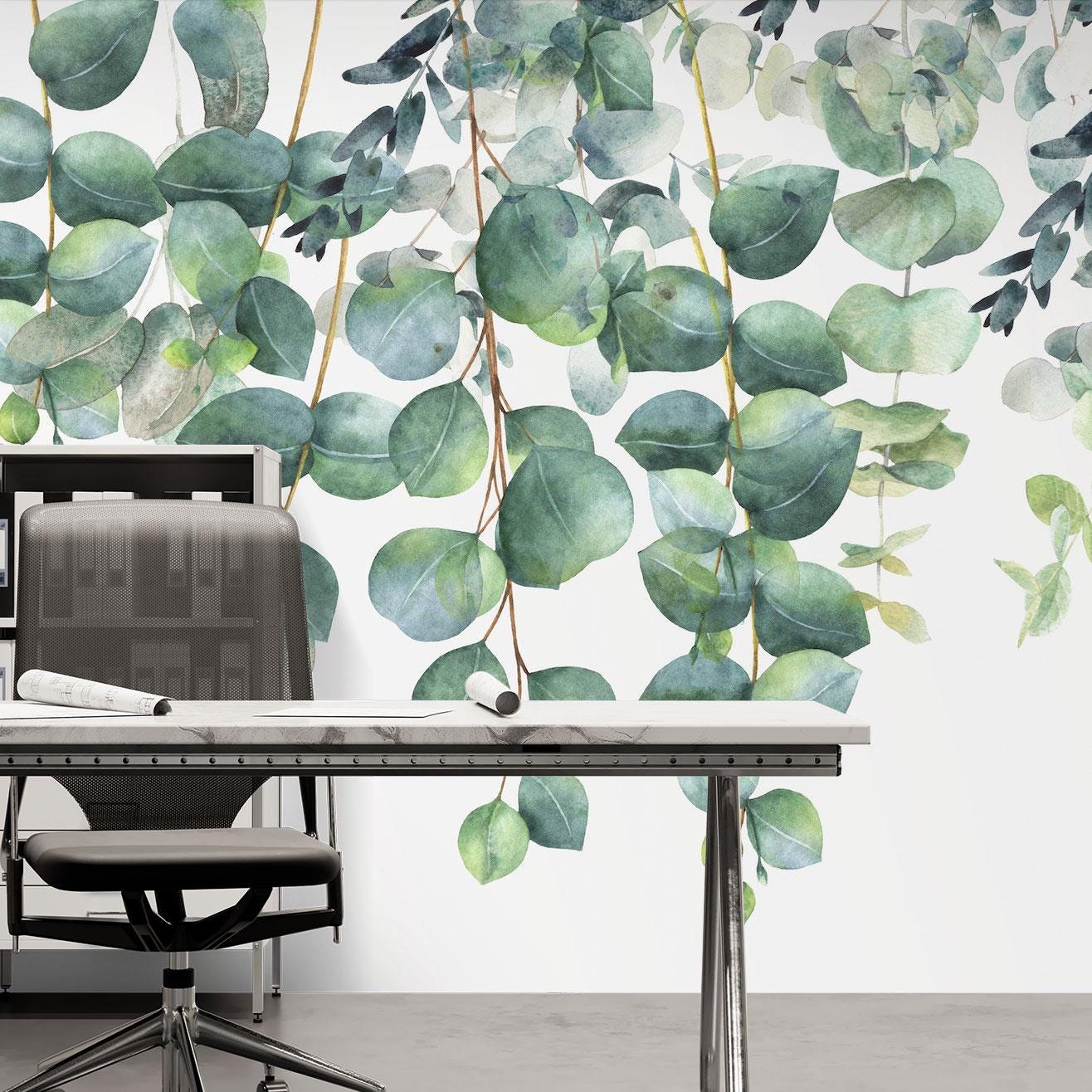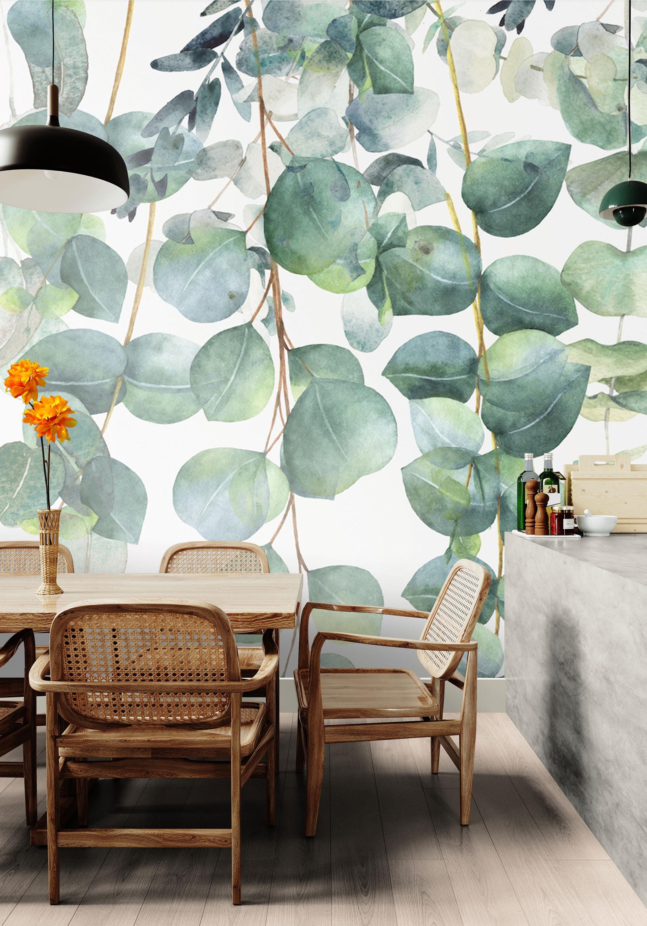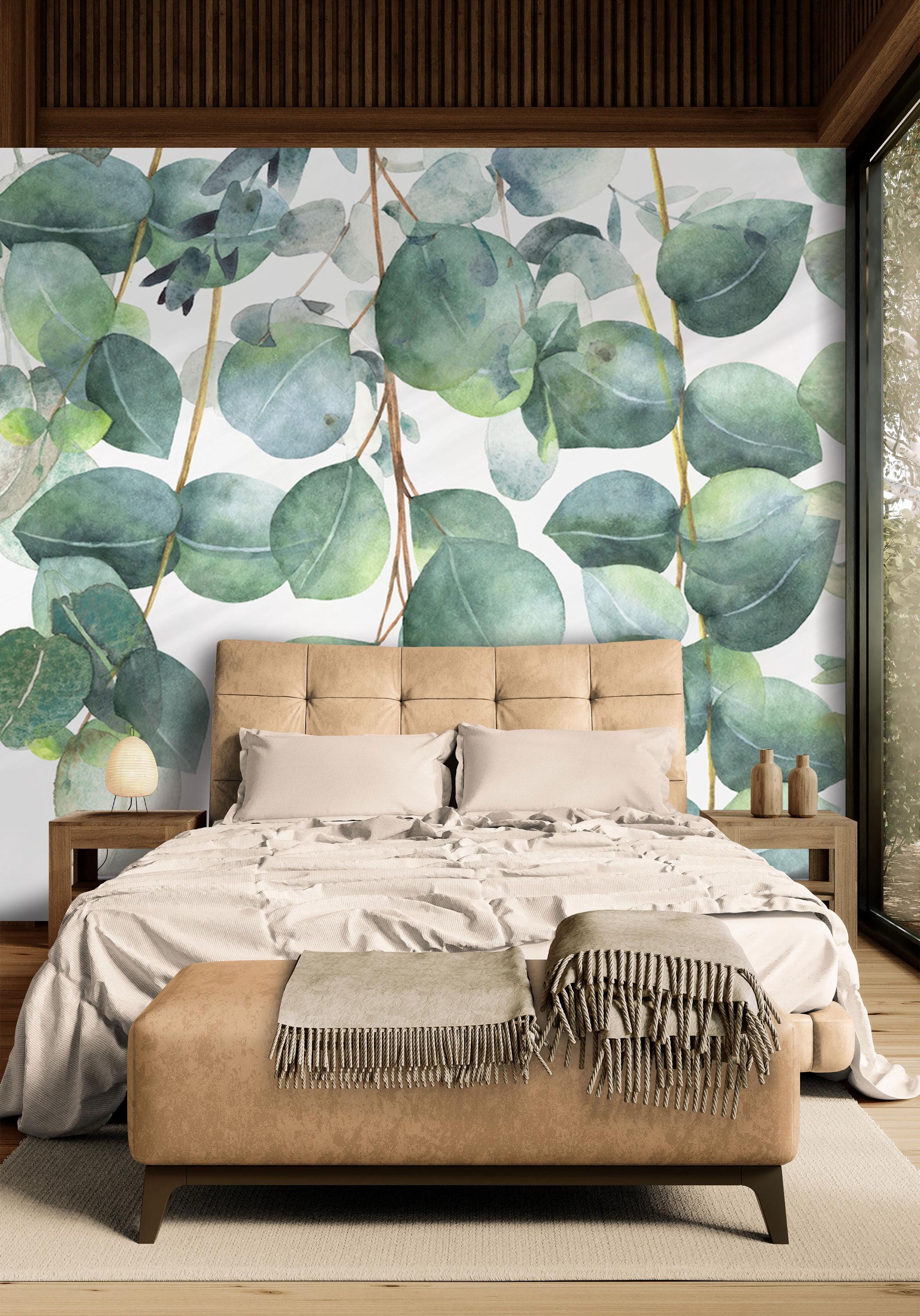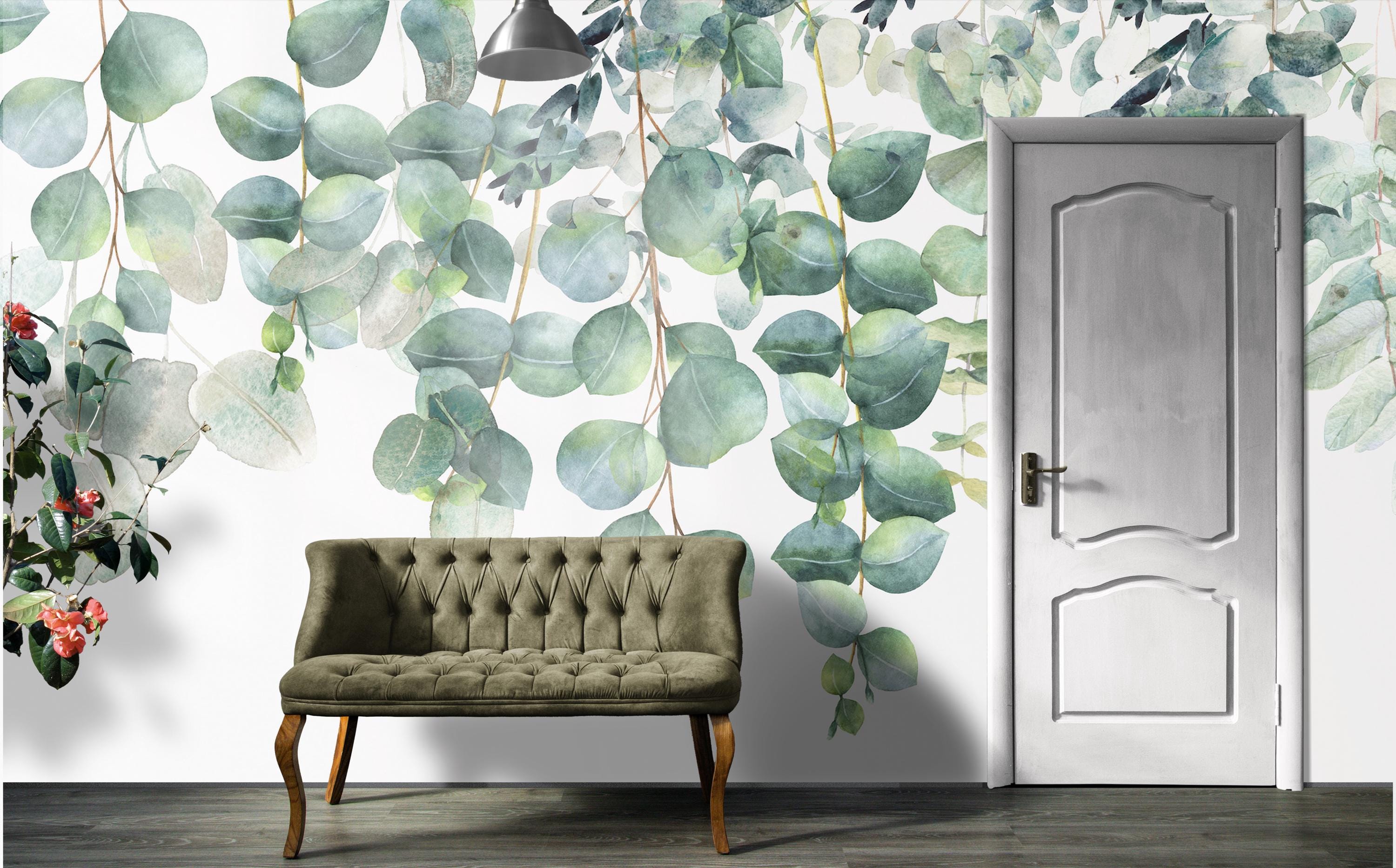Watercolor Eucalyptus Wall Mural, Hanging Greenery Botanical Wallpaper, Peel and Stick Plant Wall Art for Bedroom, Nursery or Office Decor