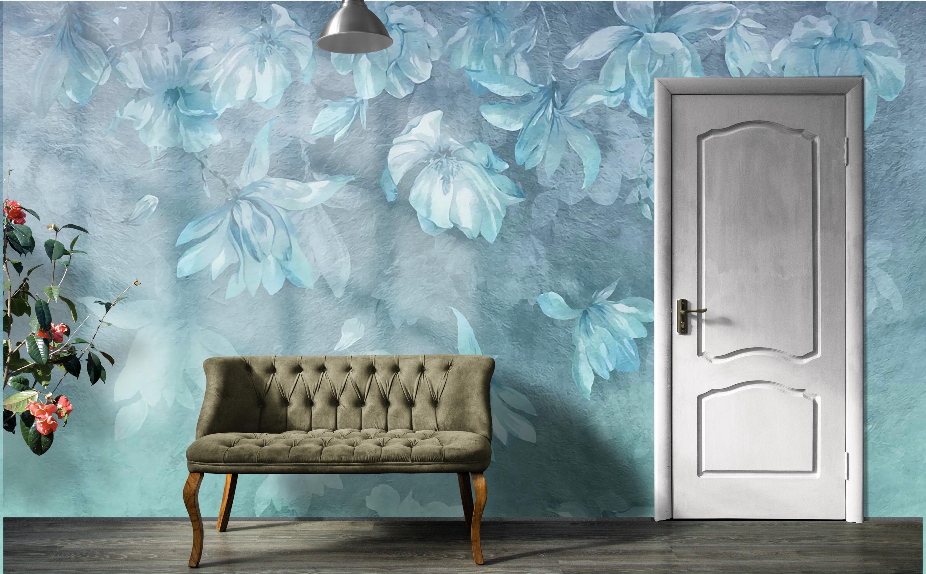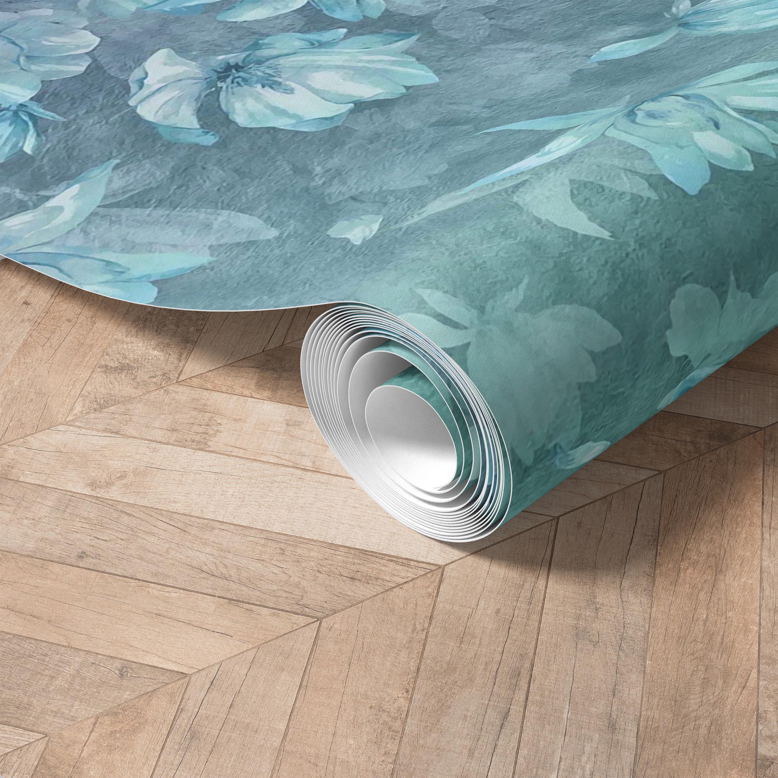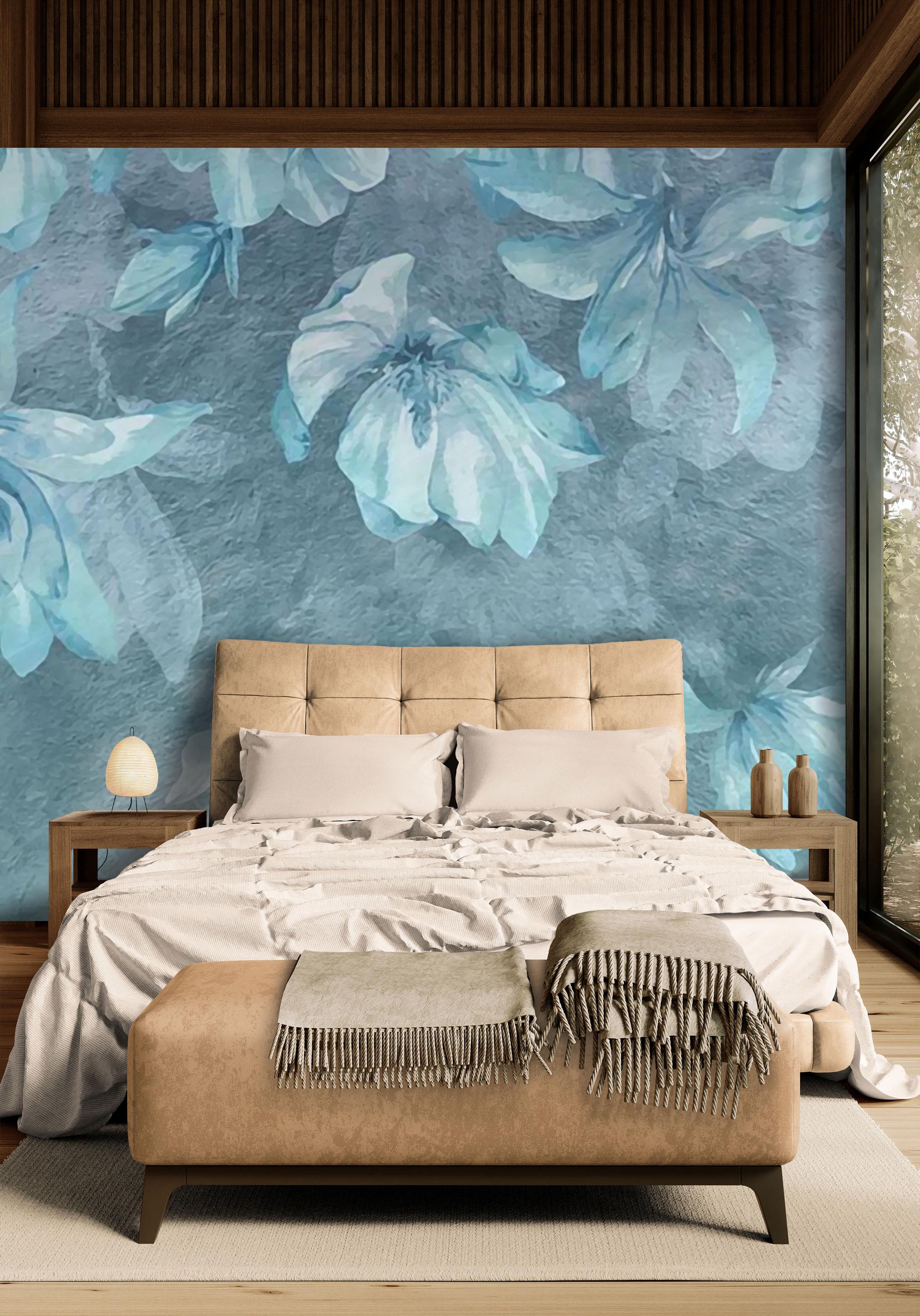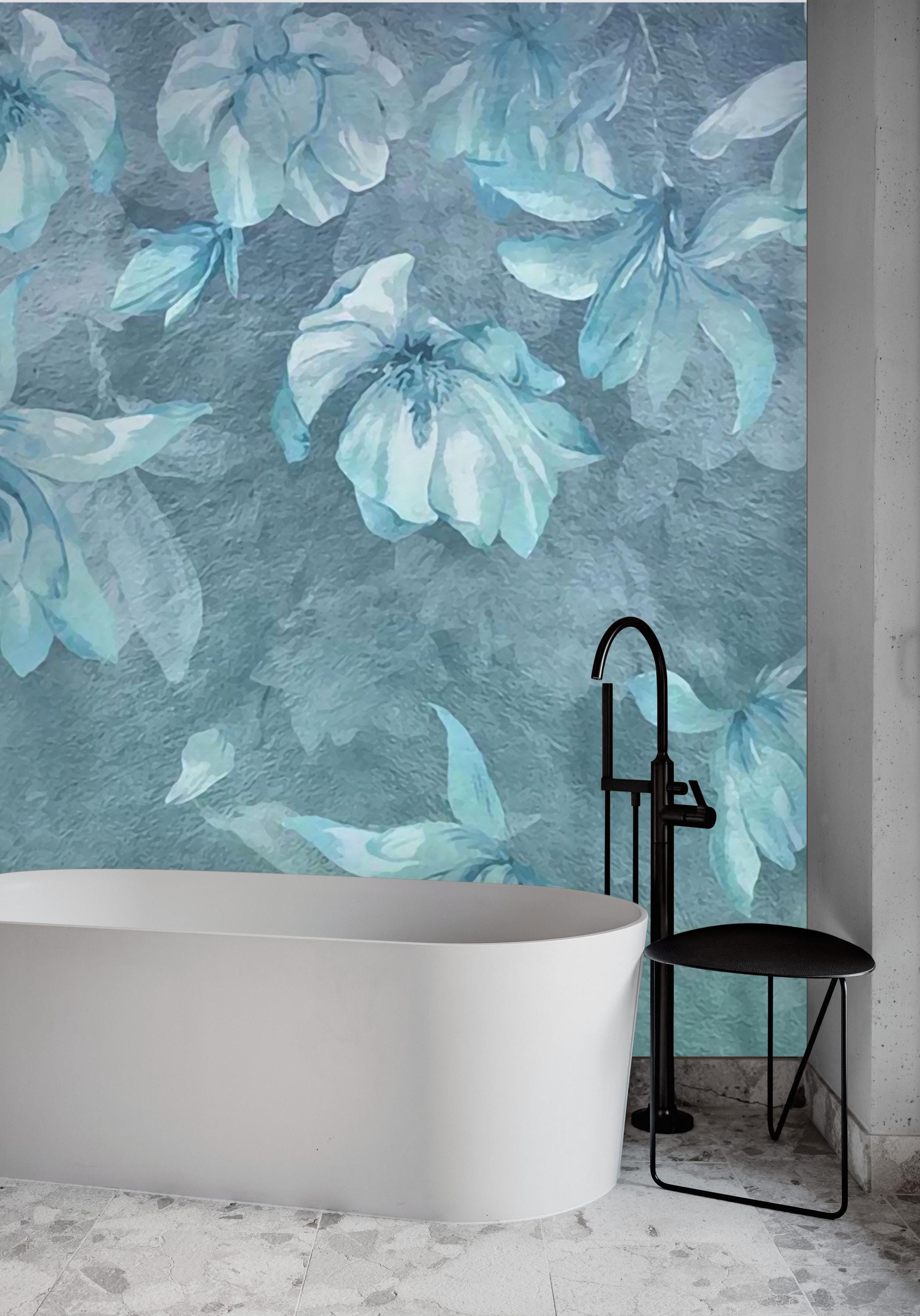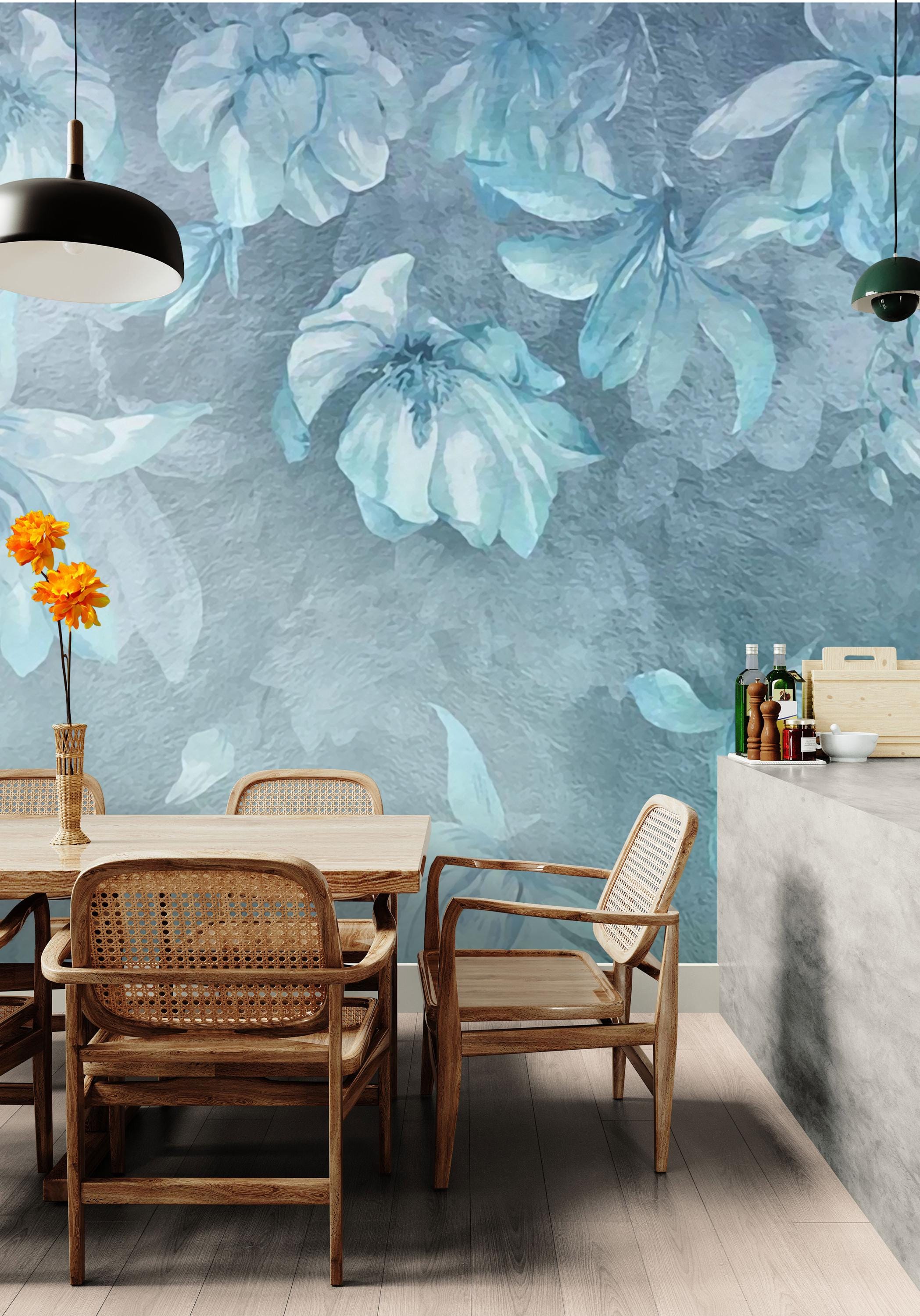 Blue Watercolor Floral Wall Mural, Soft Botanical Wallpaper for Bathroom, Bedroom, Living Room, Removable Peel and Stick Wall Decor