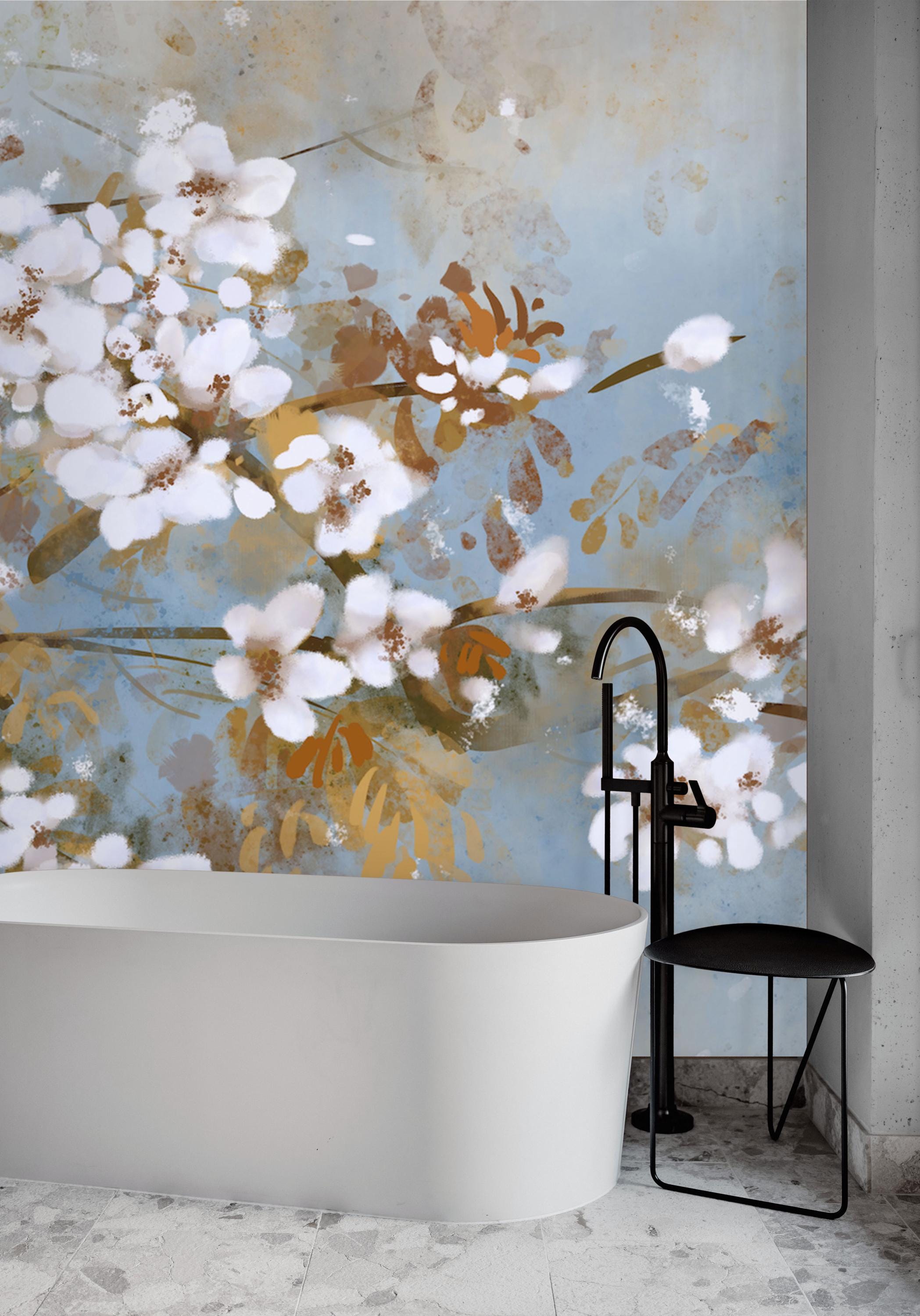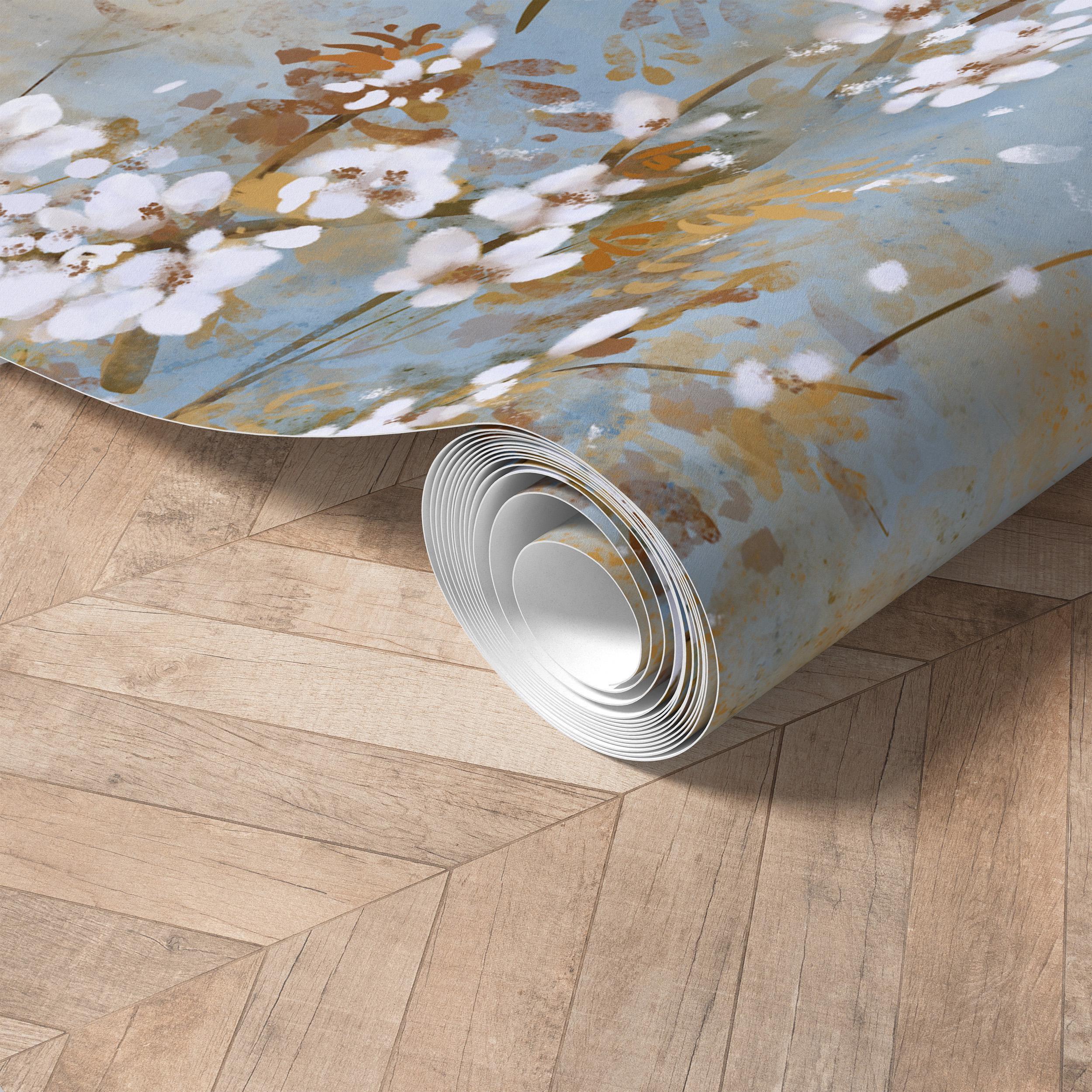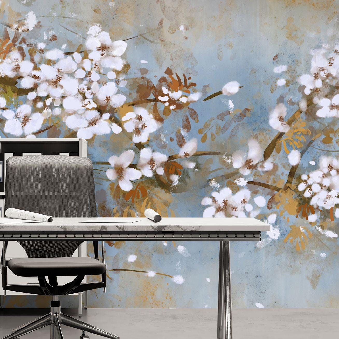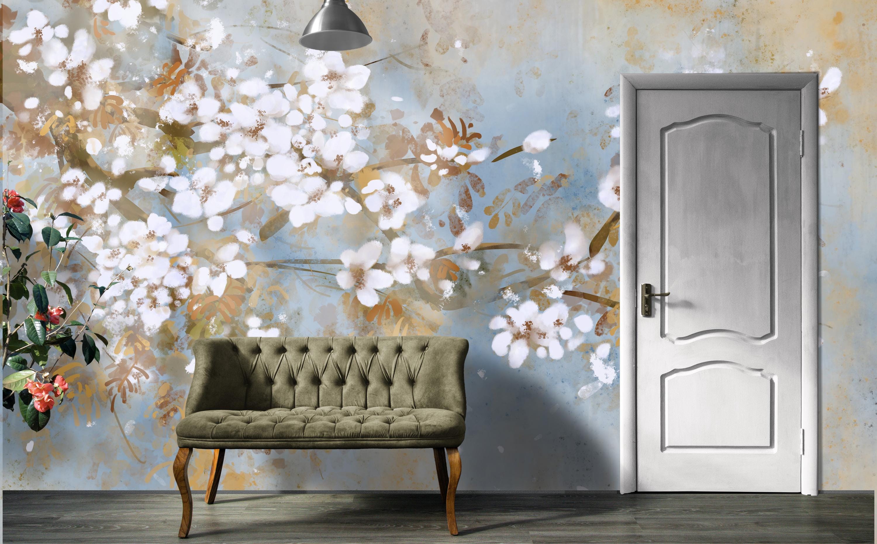 Watercolor Floral Wall Mural, Abstract White Blossom Wallpaper, Japandi Style Peel and Stick Accent Wall for Bedroom, Bathroom or Office