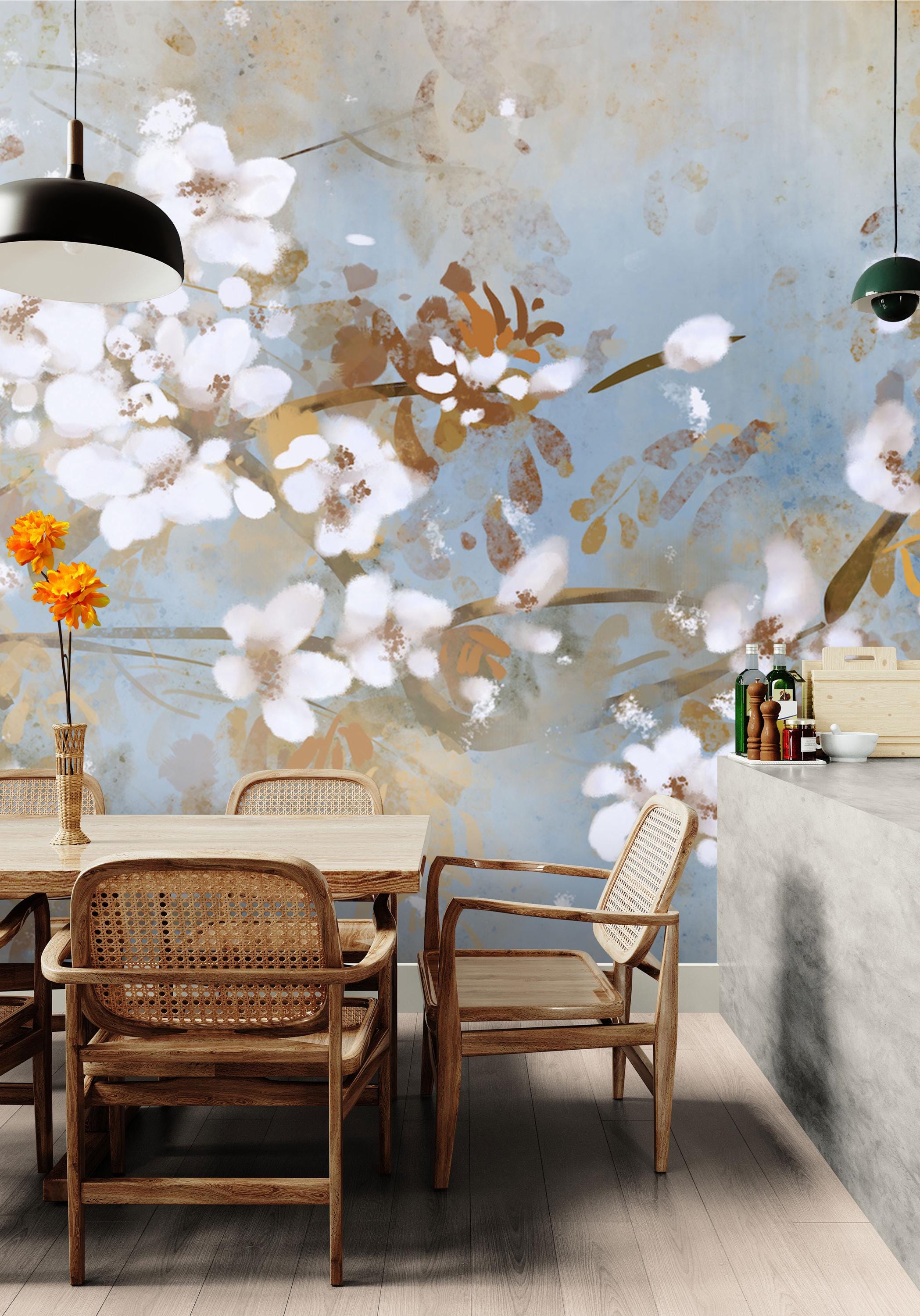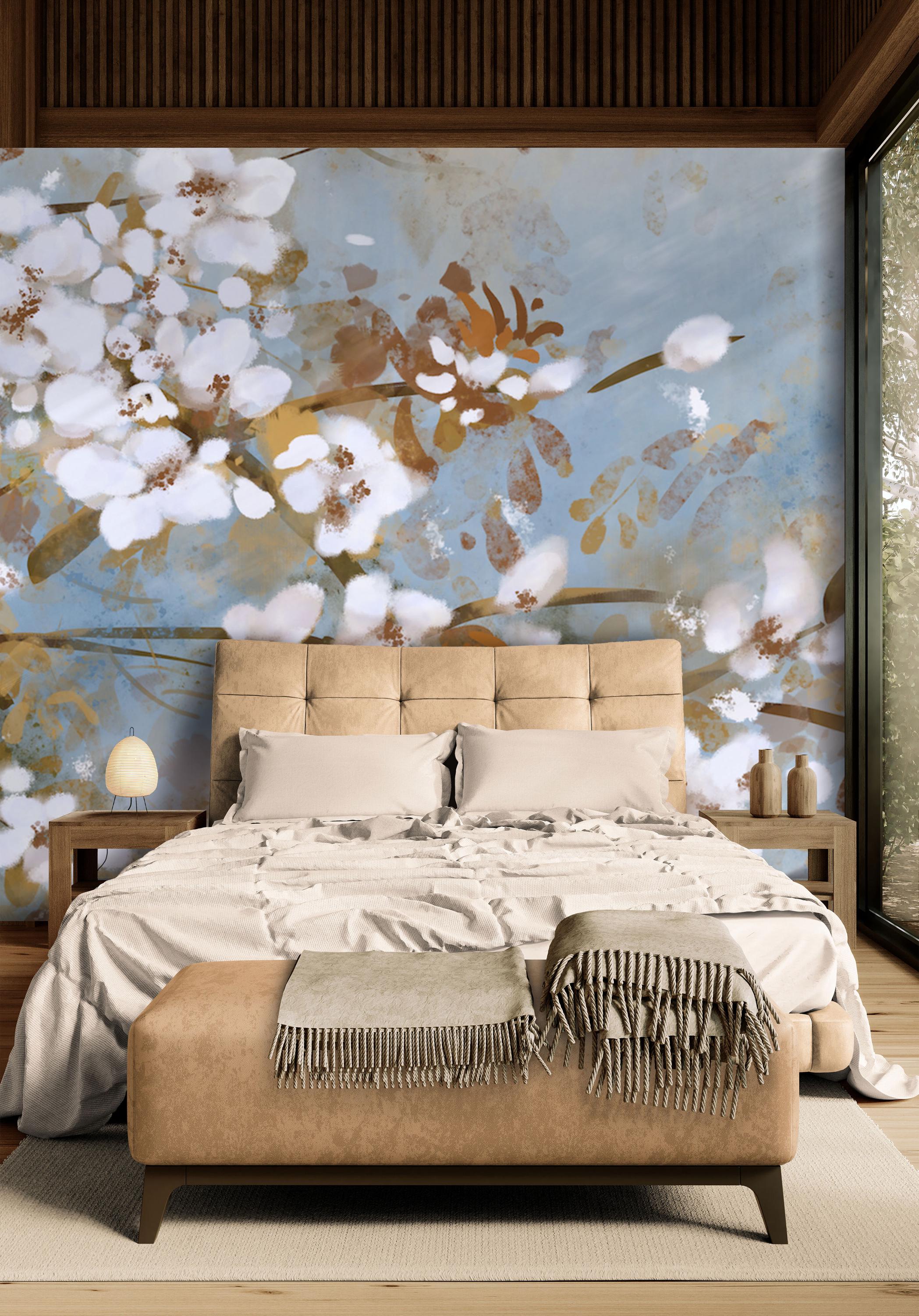 Add a touch of bohemian flair to your home with this stunning floral wall mural. The oversized flowers in earthy tones will infuse your space with warmth and personality.