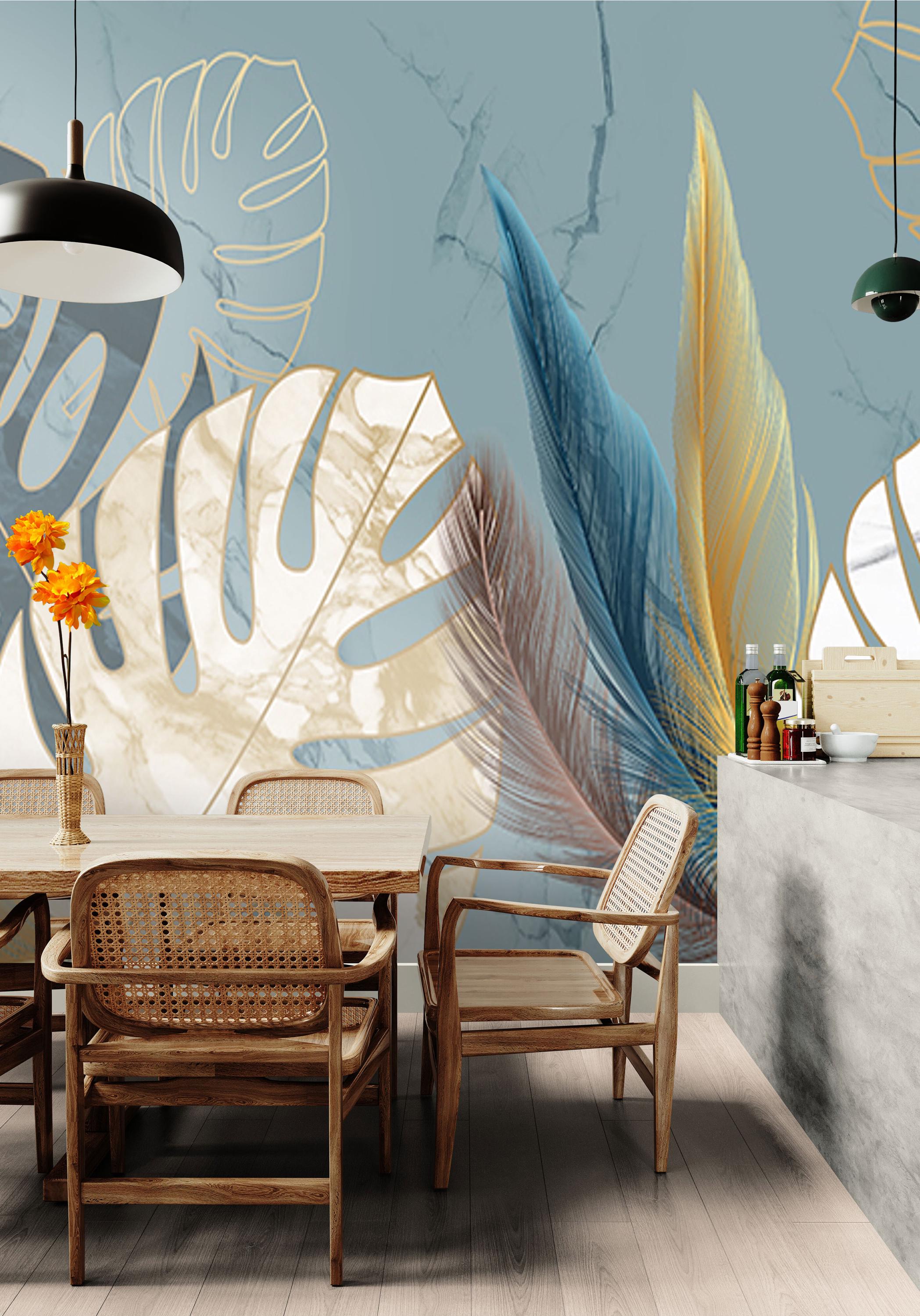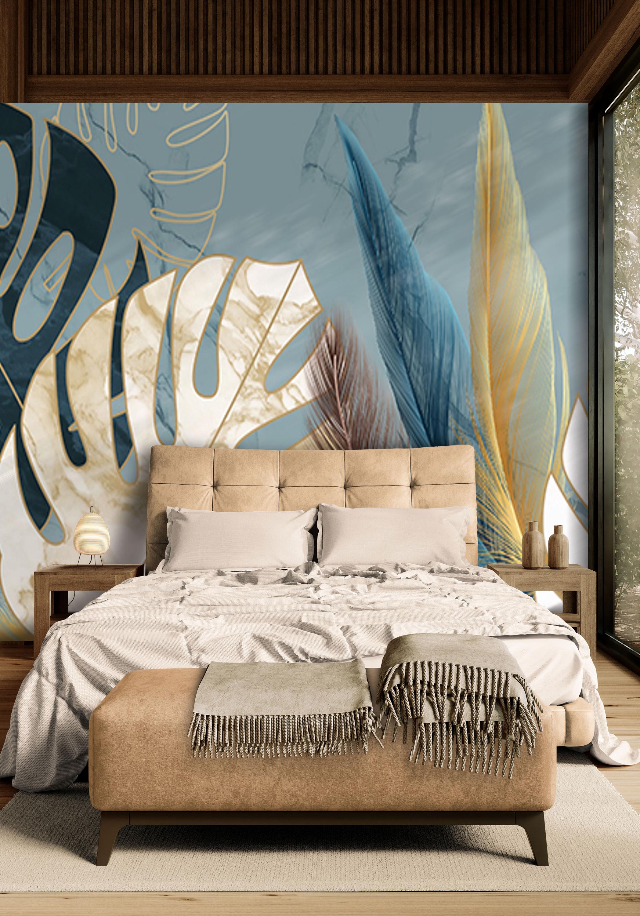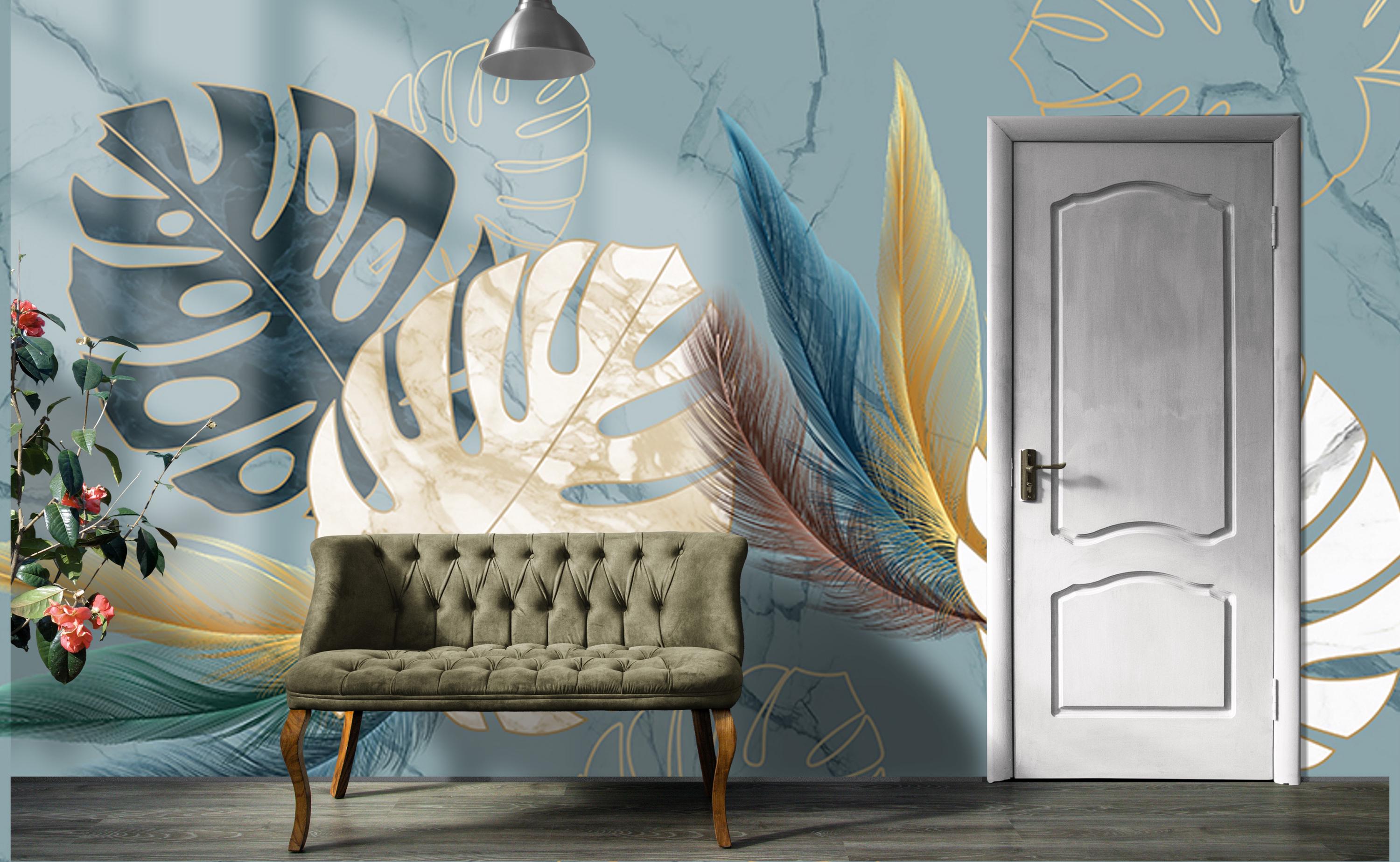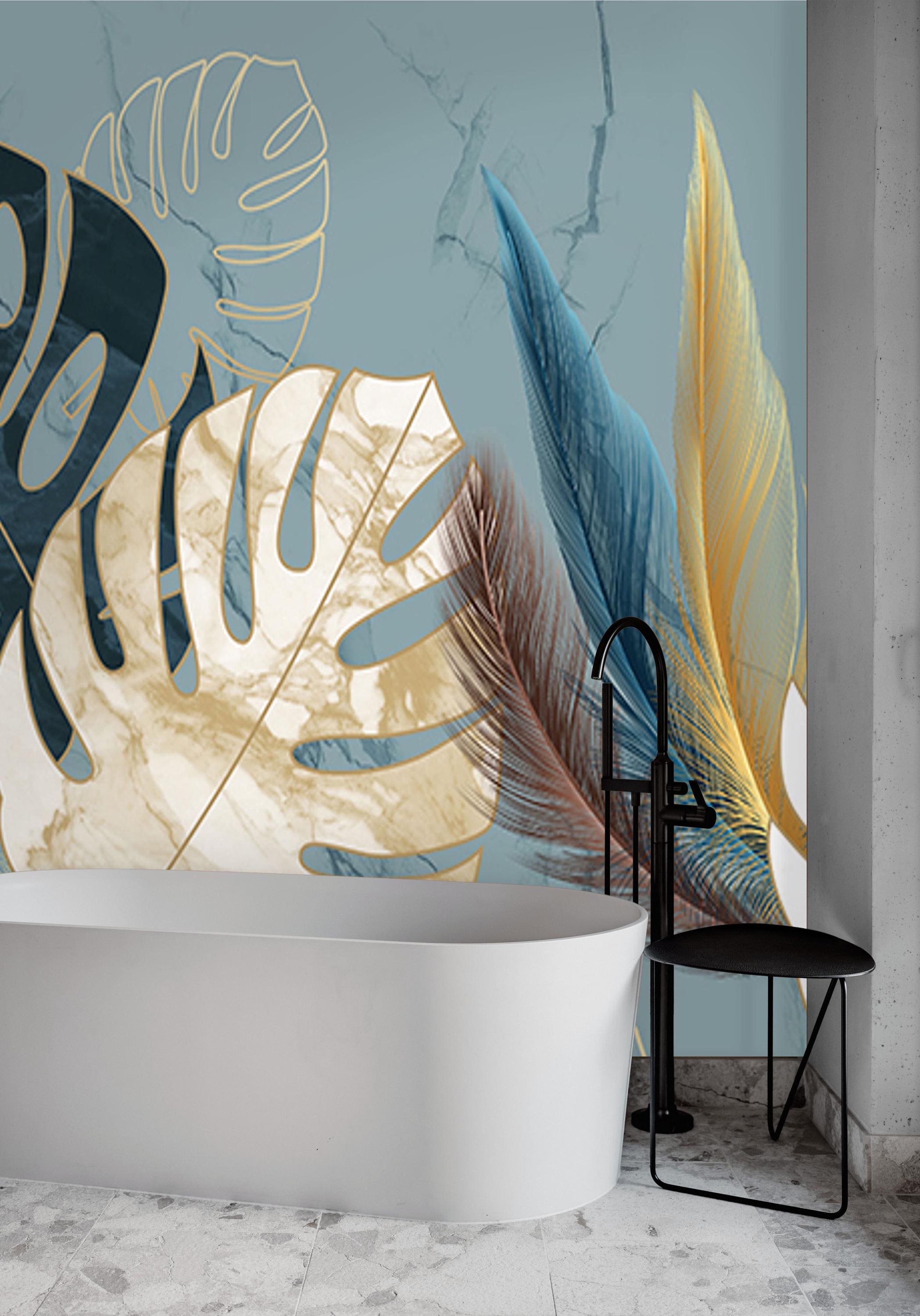 Tropical Feather and Monstera Wallpaper – Blue and Gold Leaf Design with Marble Texture for Modern Office or Bold Wall Accent