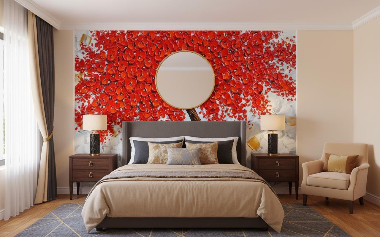 Red Blossom Tree Mural Wallpaper – Textured Oil Painting Look Wall Art for Living Room, Bold Cherry Accent Wall Background Décor