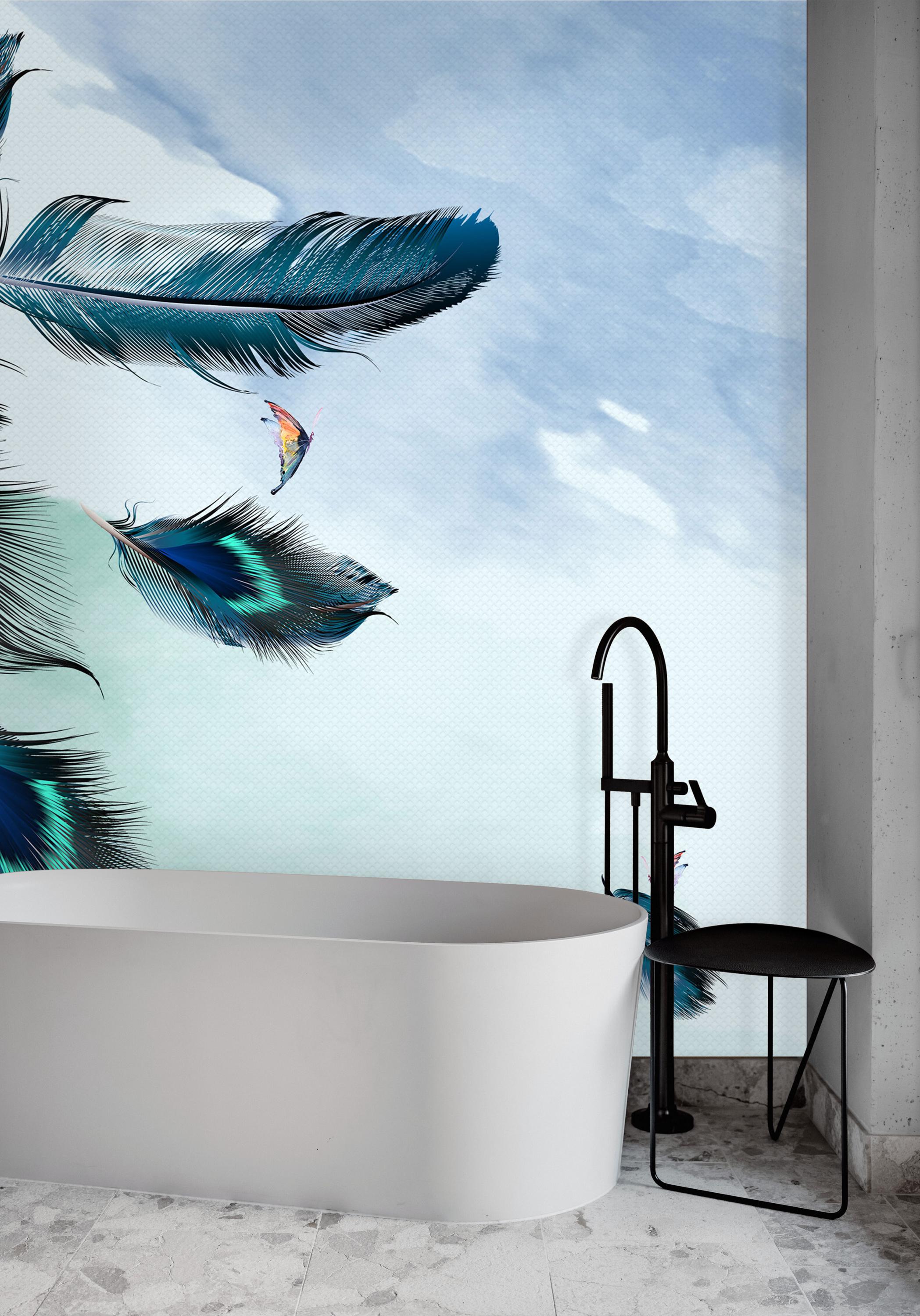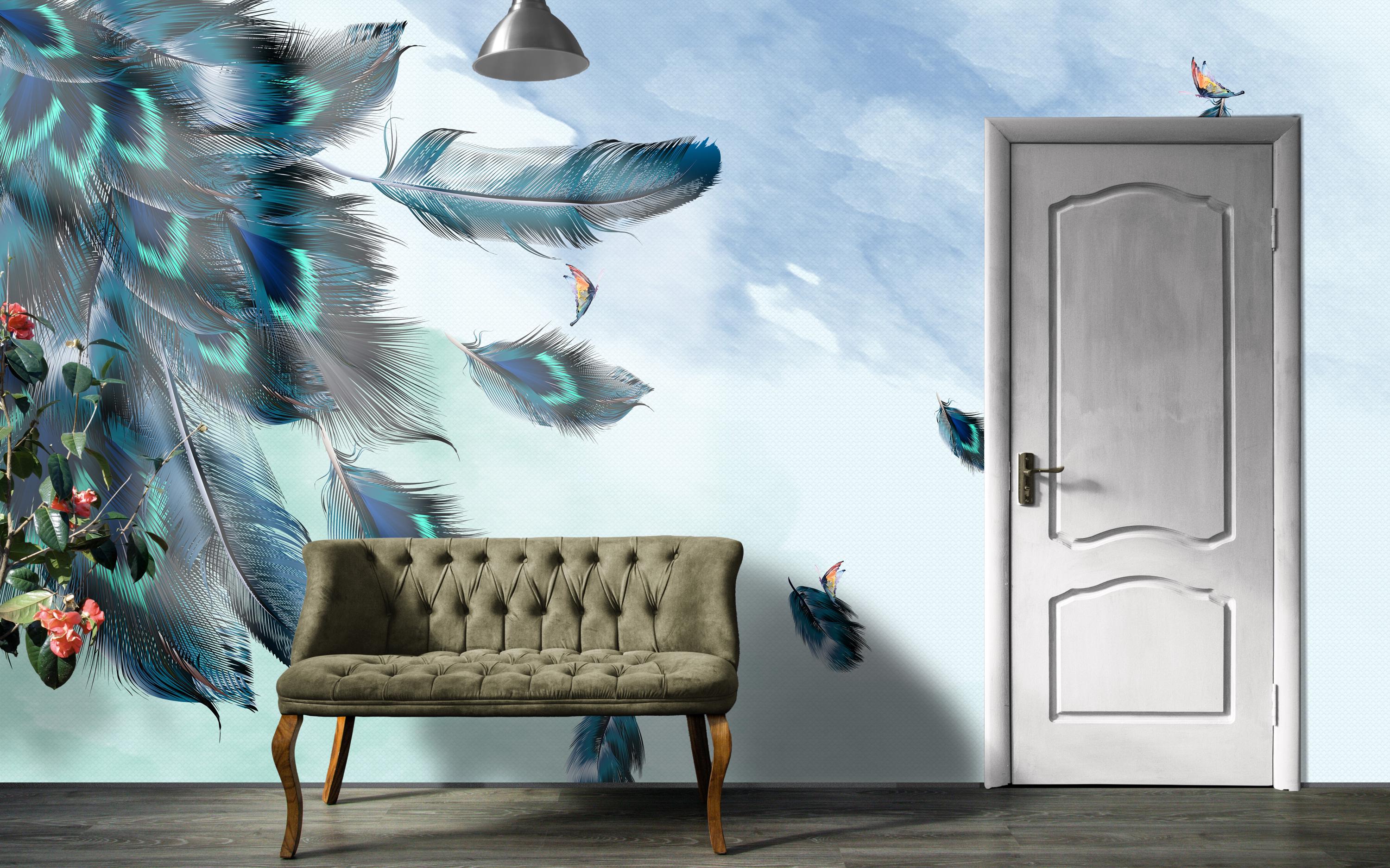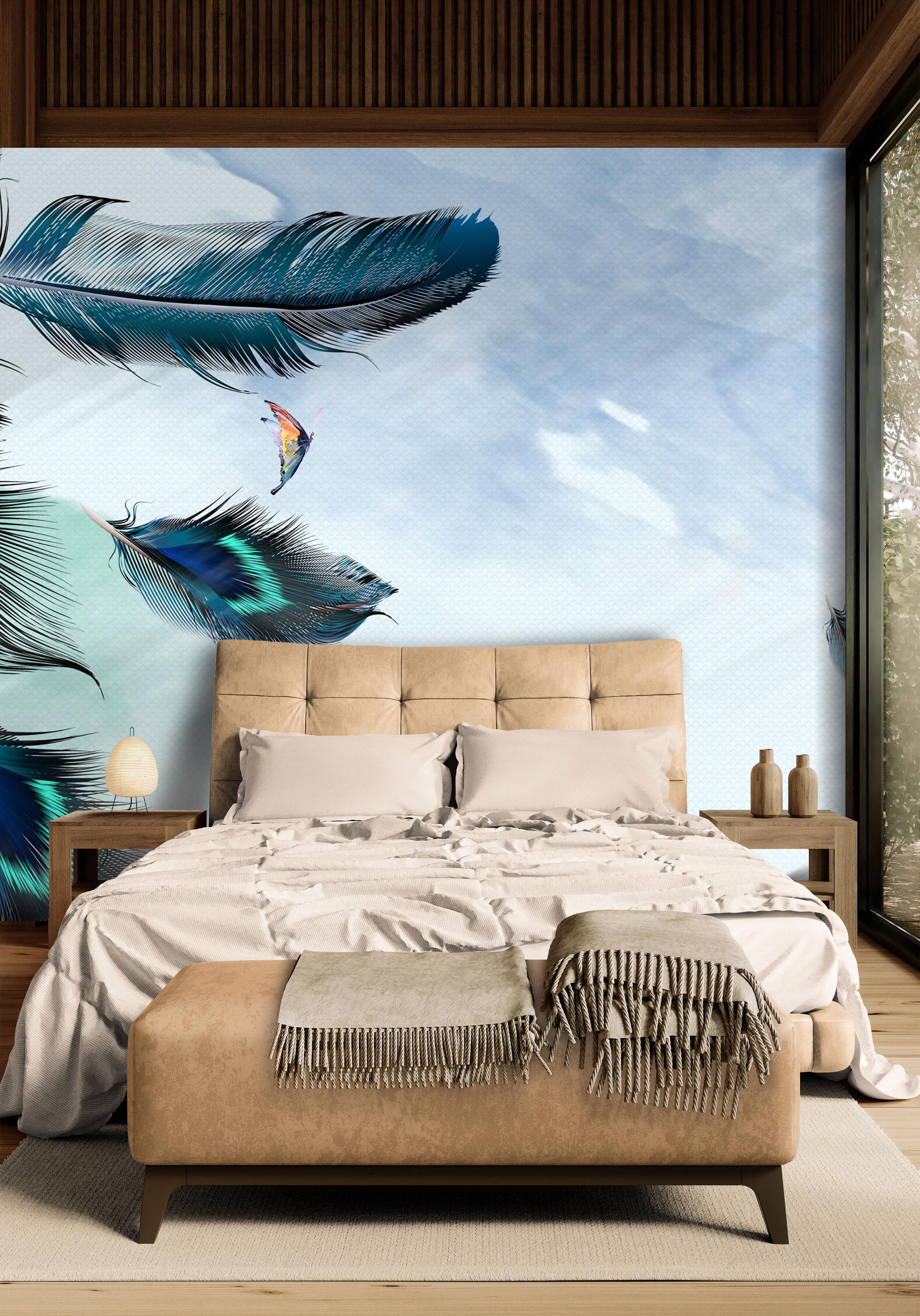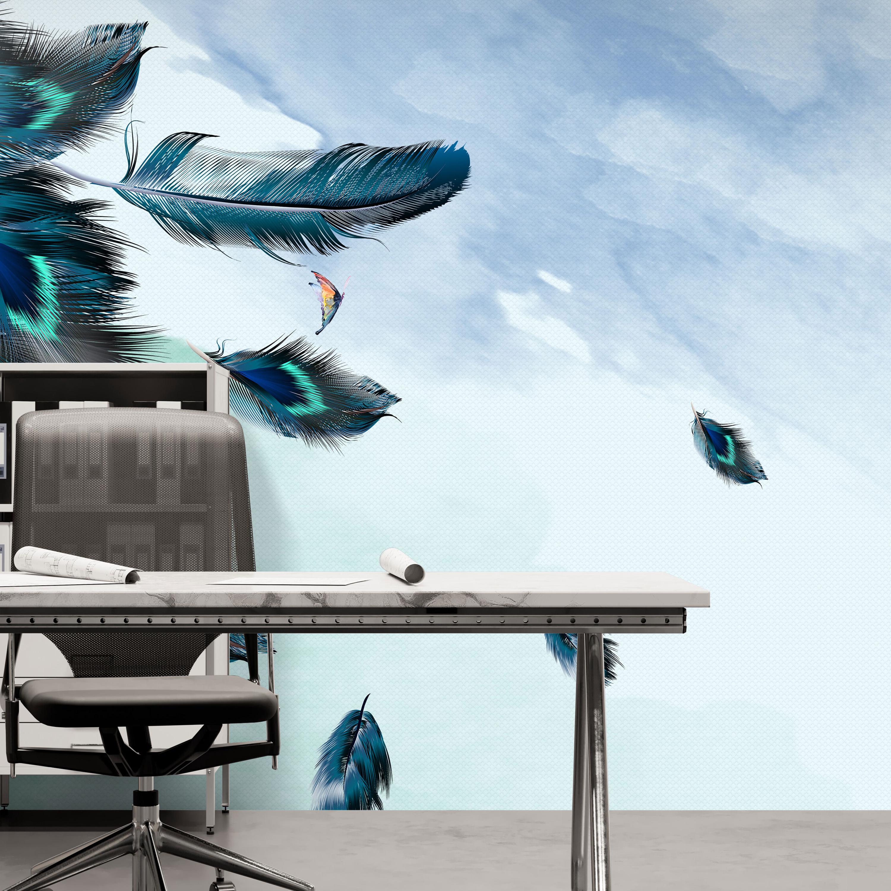 Blue Feather Wall Mural – Elegant Watercolor Bird Feather Wallpaper for Living Room, Whimsical Nature Art, Light Airy Home Decor