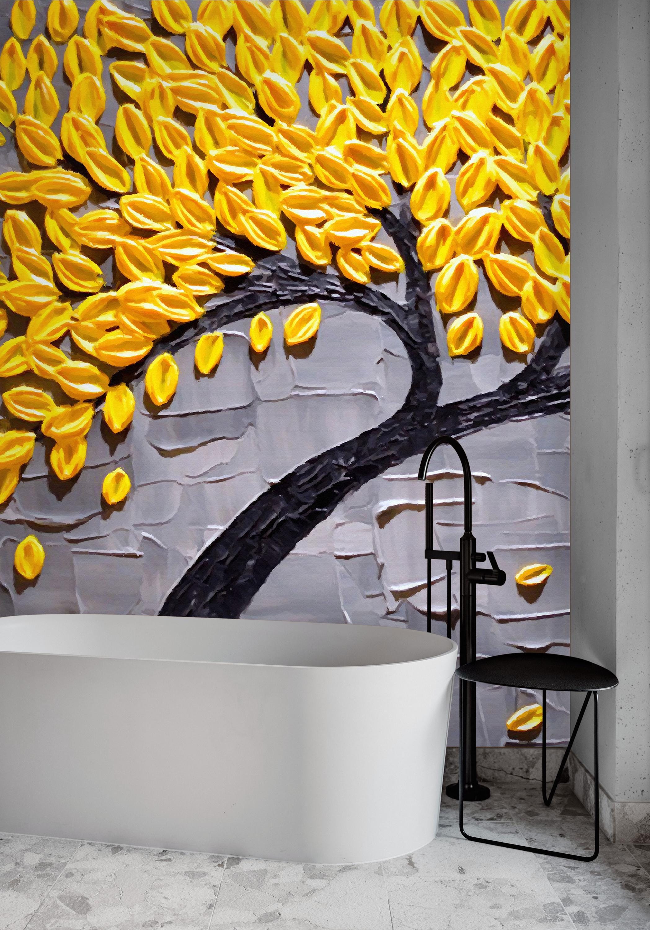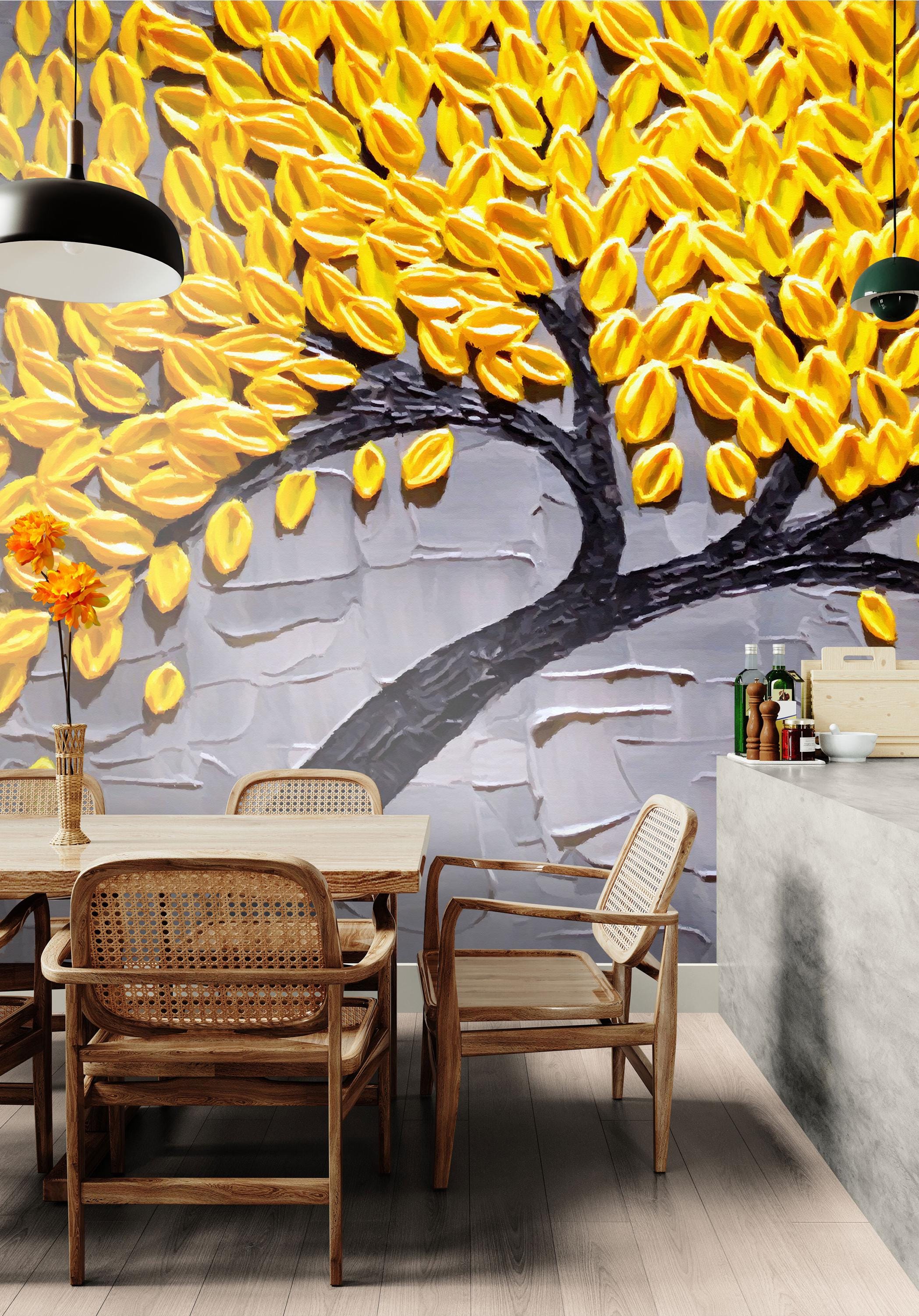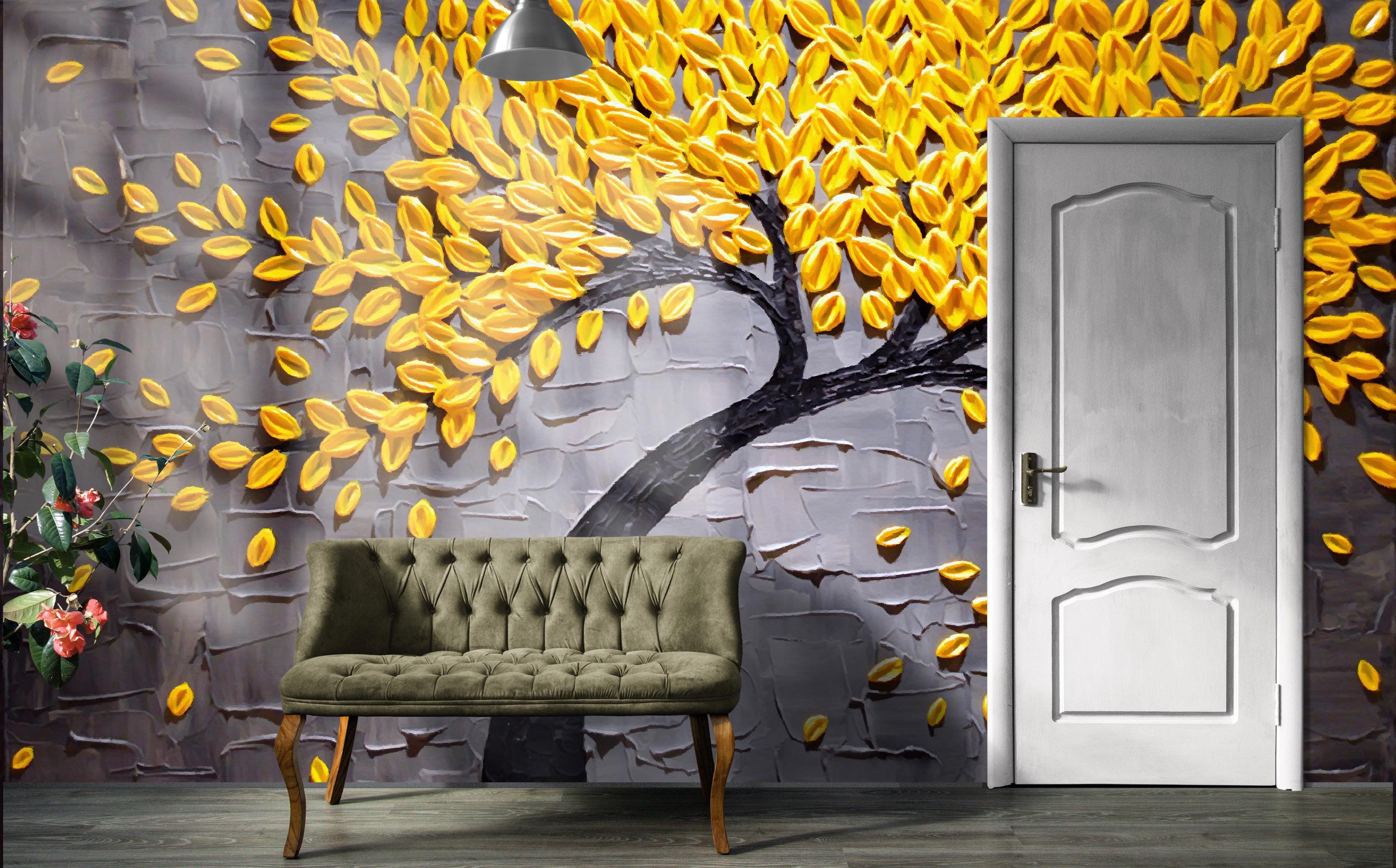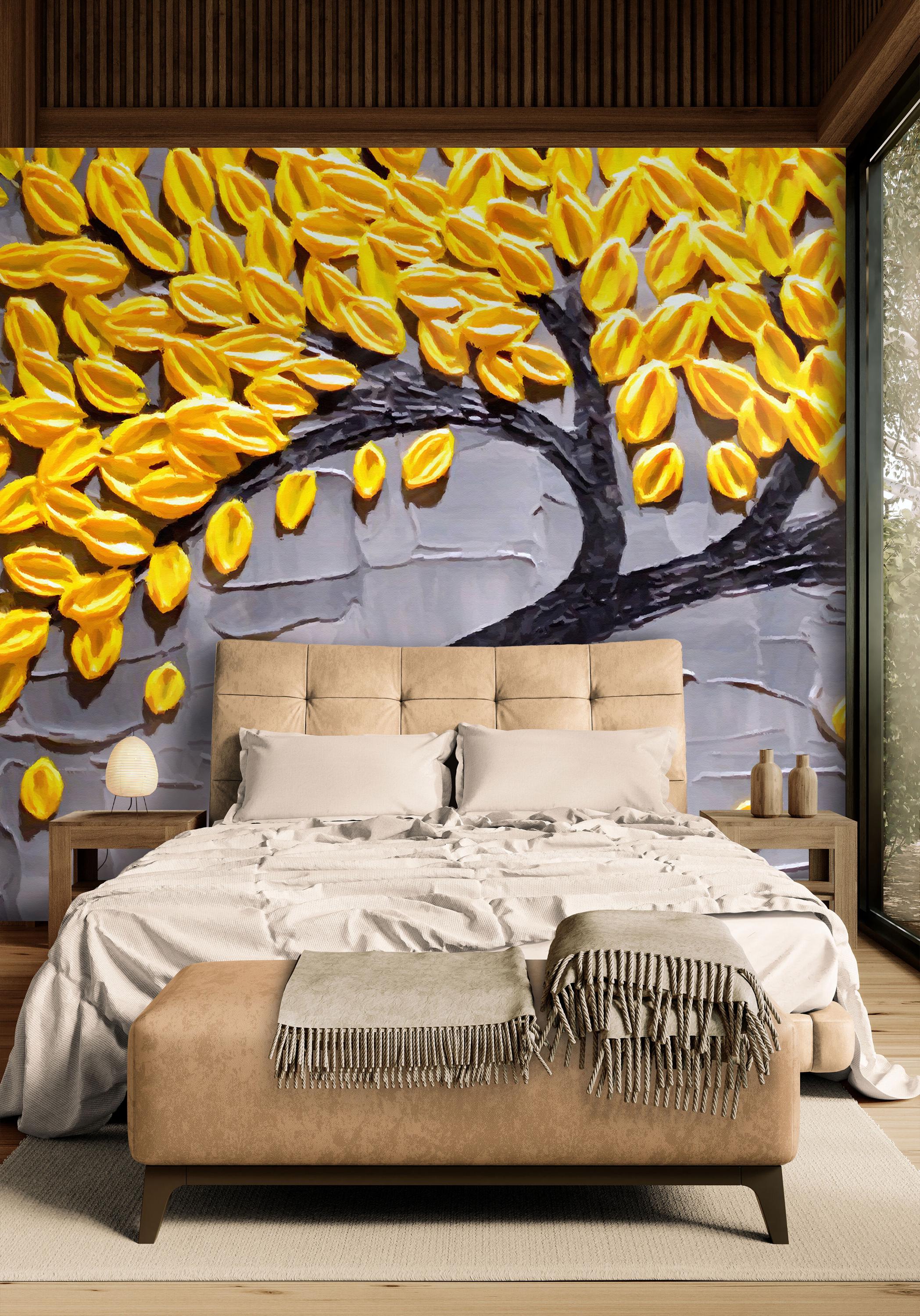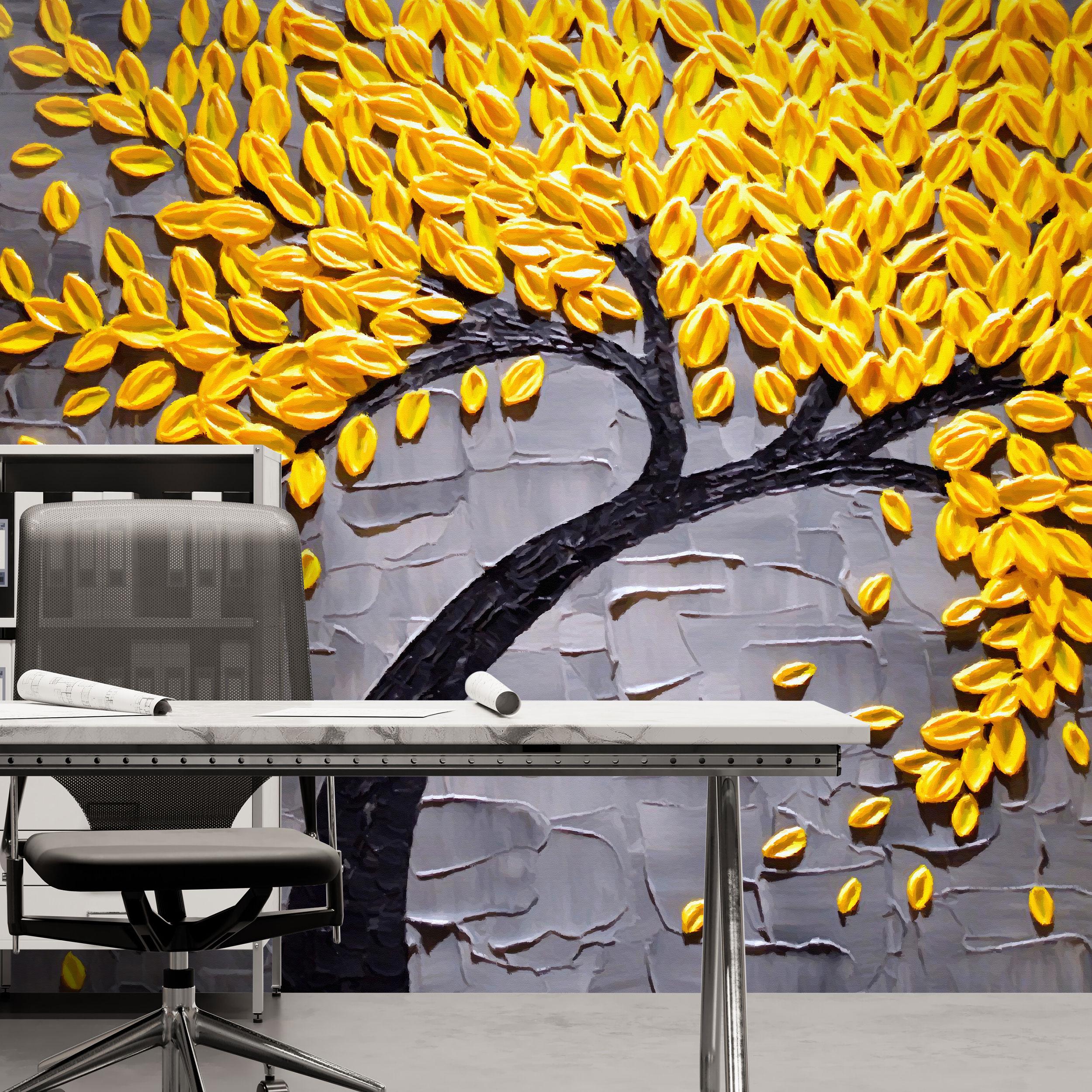 Golden Tree Wall Mural – Textured Yellow Leaf Canvas Wallpaper for Living Room, Autumn Accent Art with Gray and Black Background
