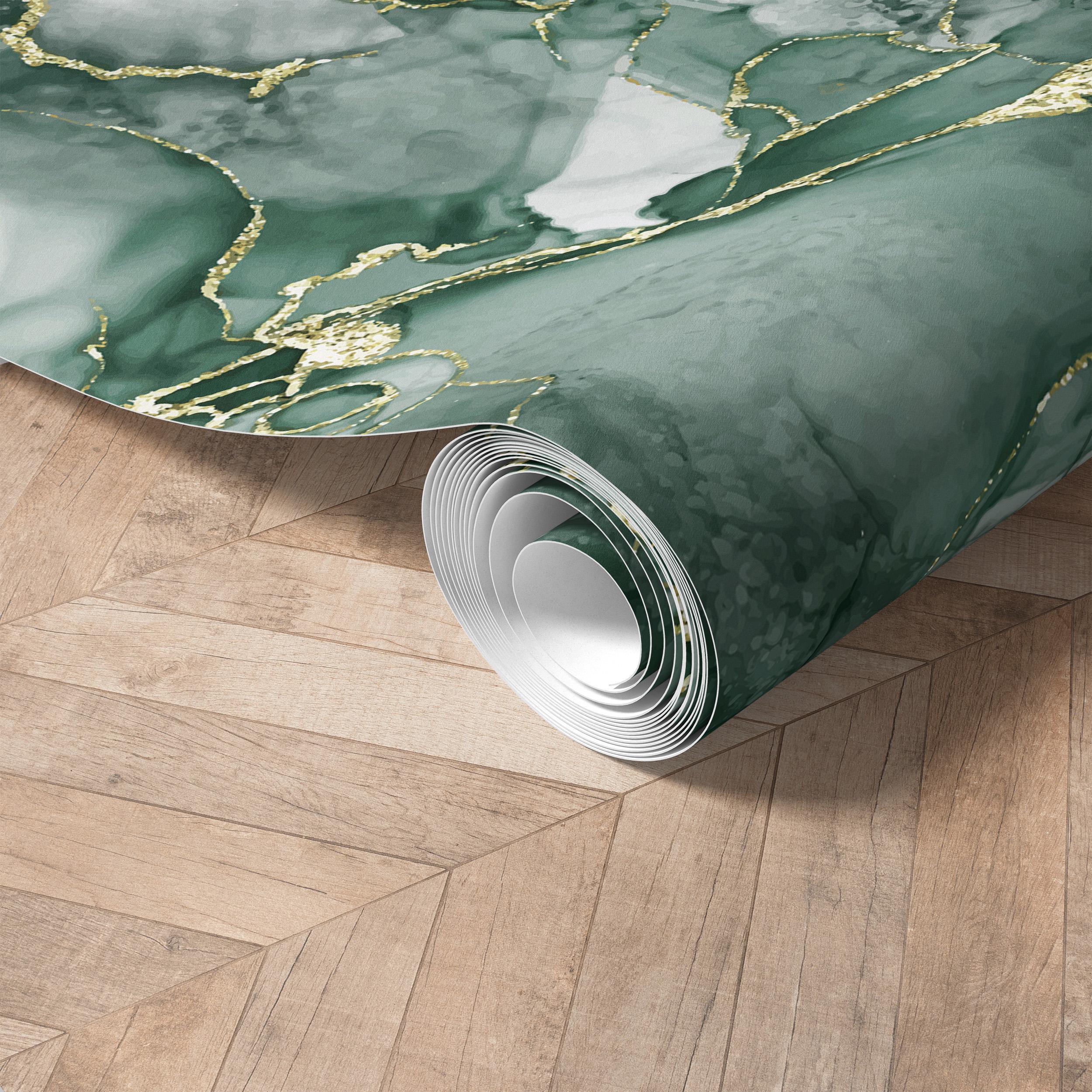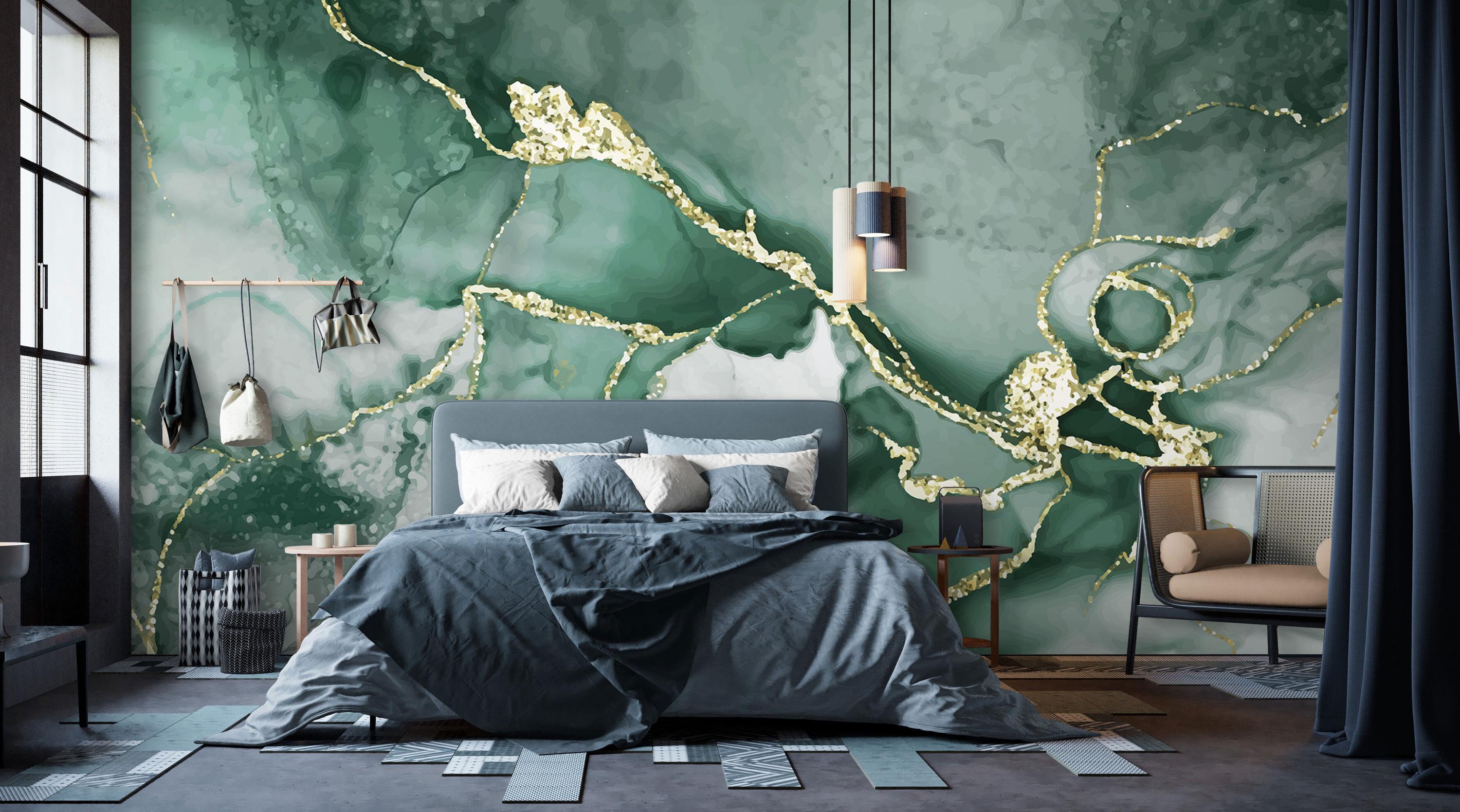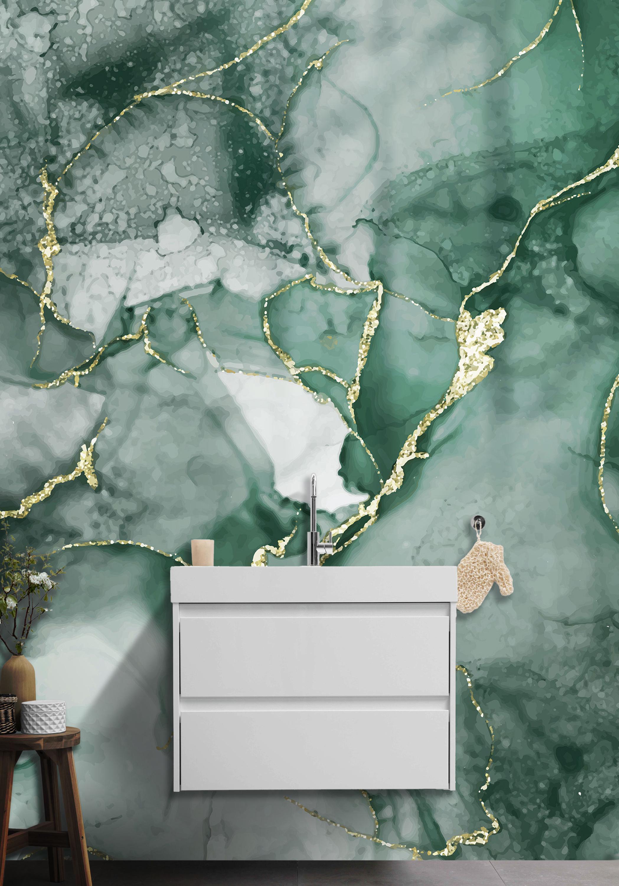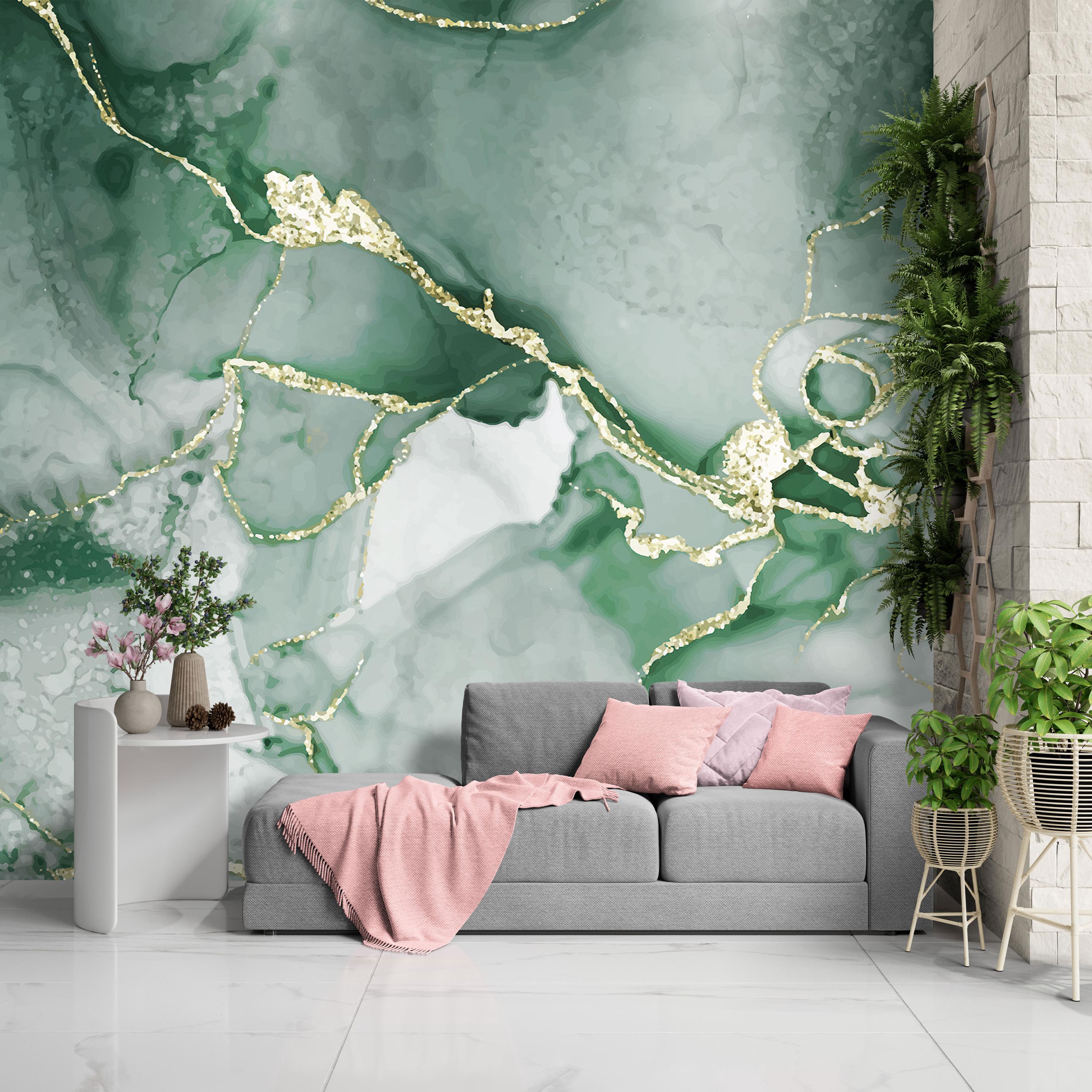 Green Marble and Gold Vein Wall Mural – Luxury Abstract Agate Texture Wallpaper for Living Room Accent Wall or Modern Home Decor