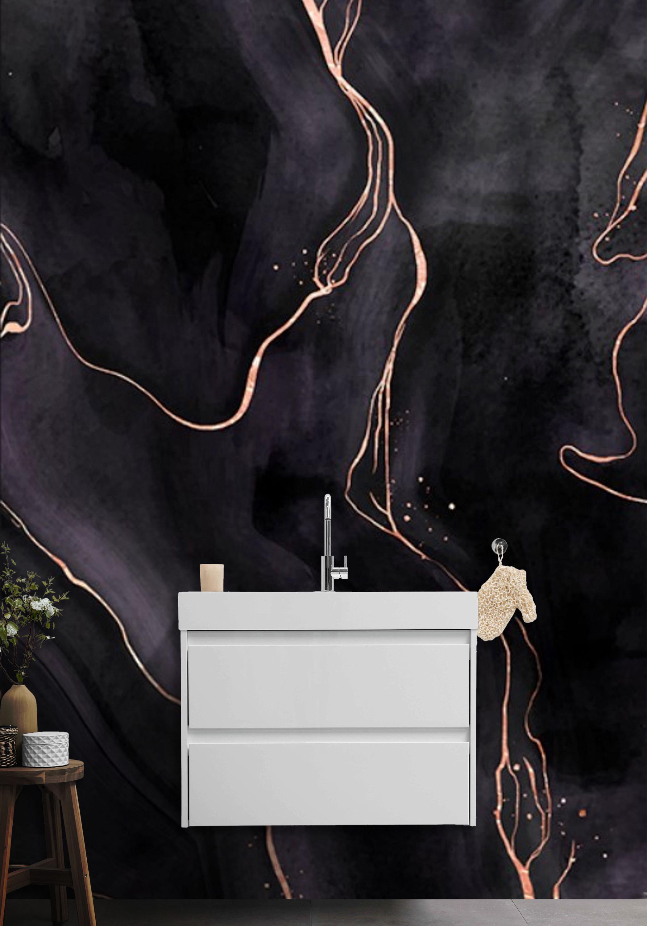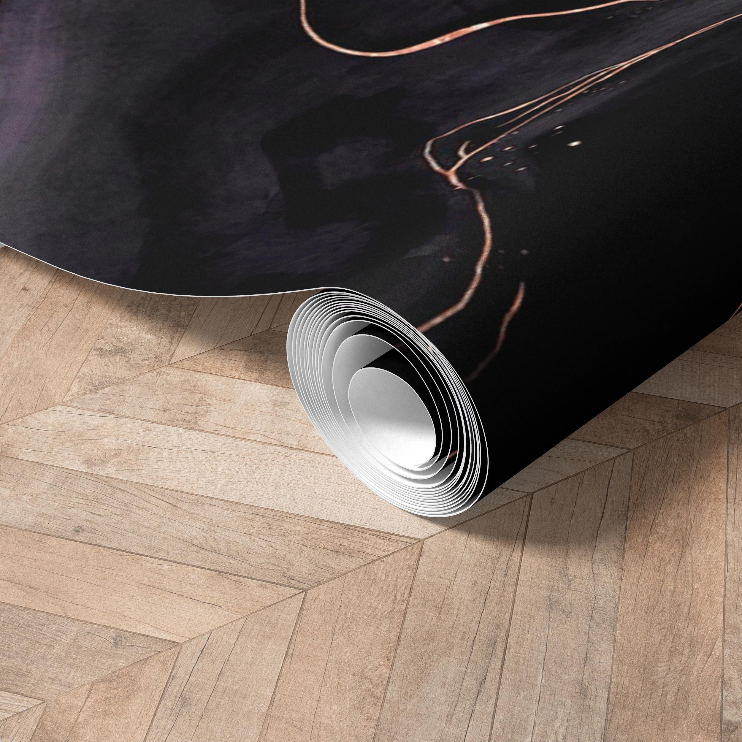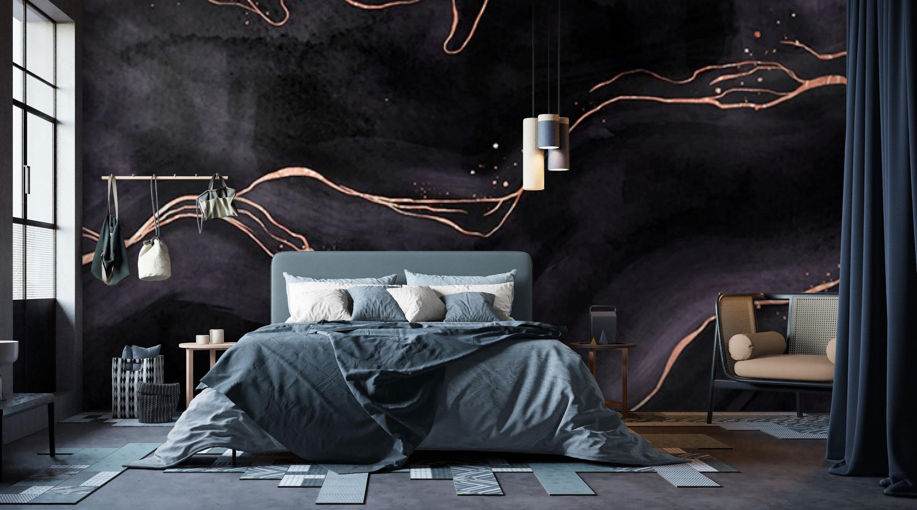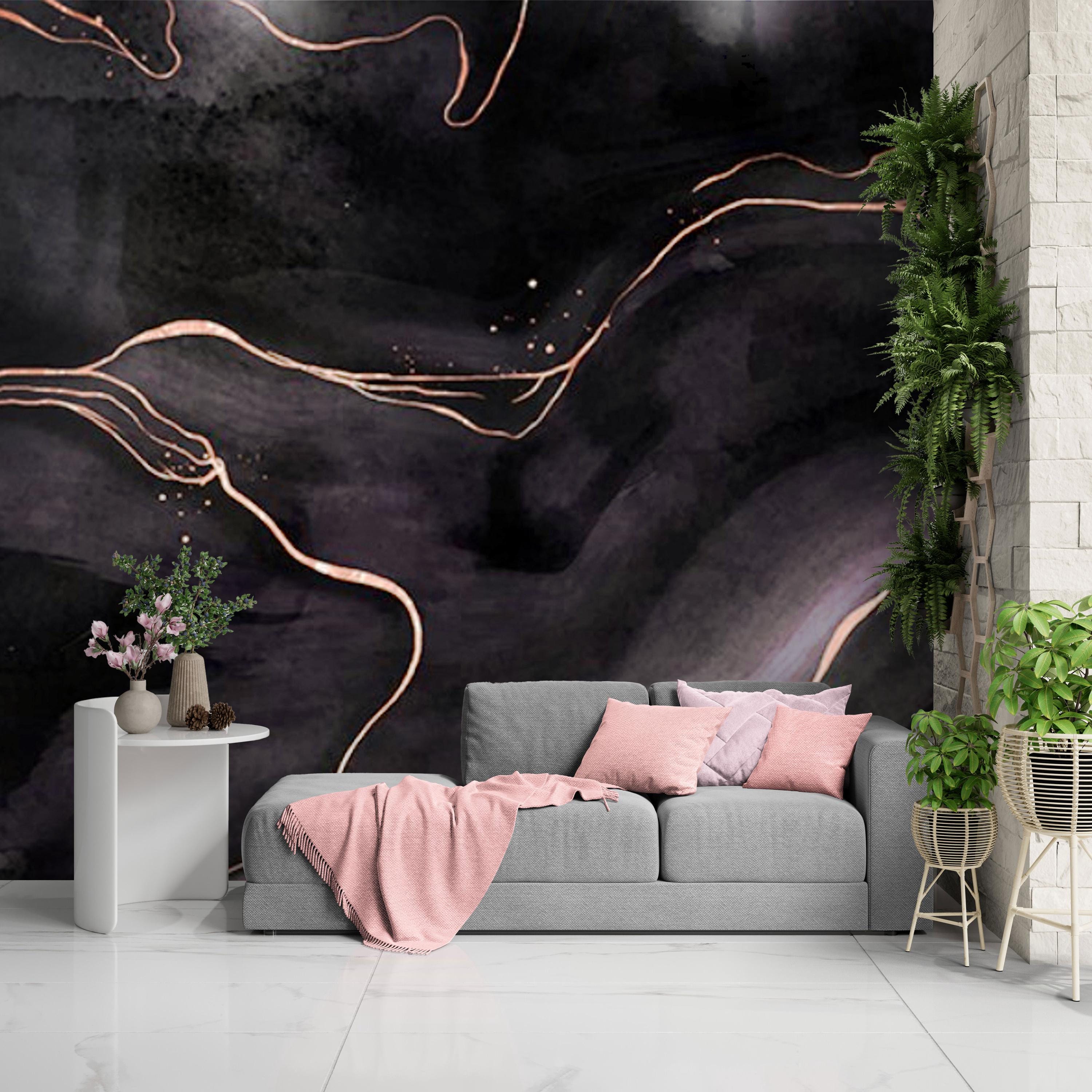 Black Marble Wallpaper with Rose Gold Veins – Elegant Dark Abstract Mural for Living Room Accent Wall or Modern Home Interiors