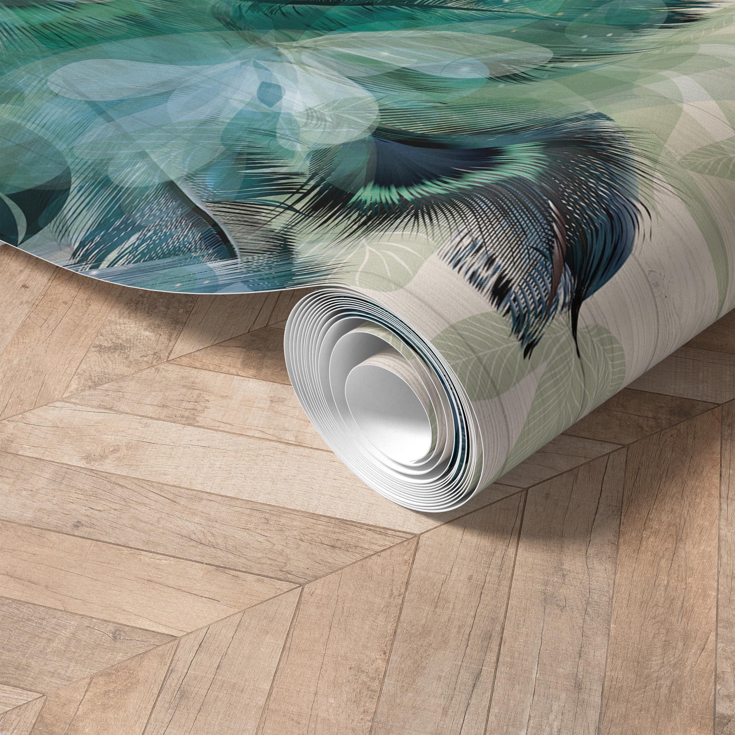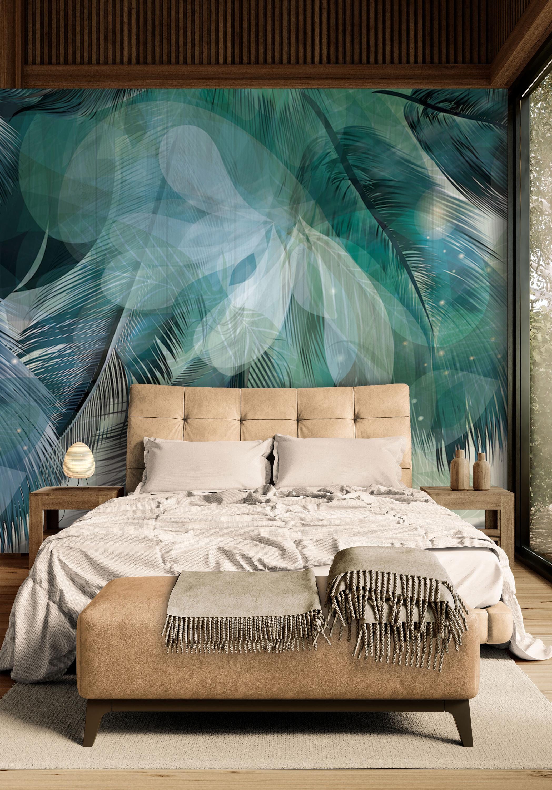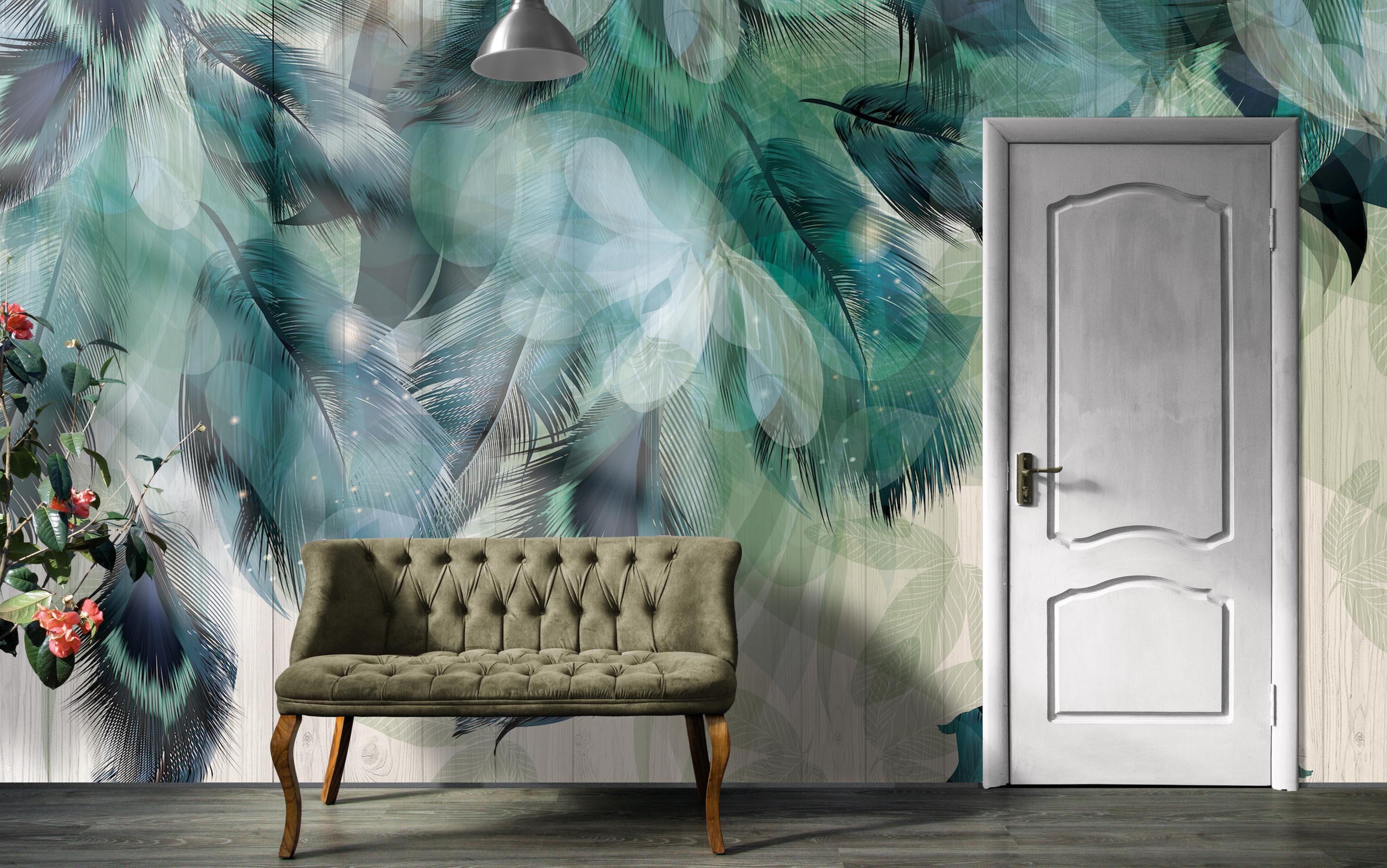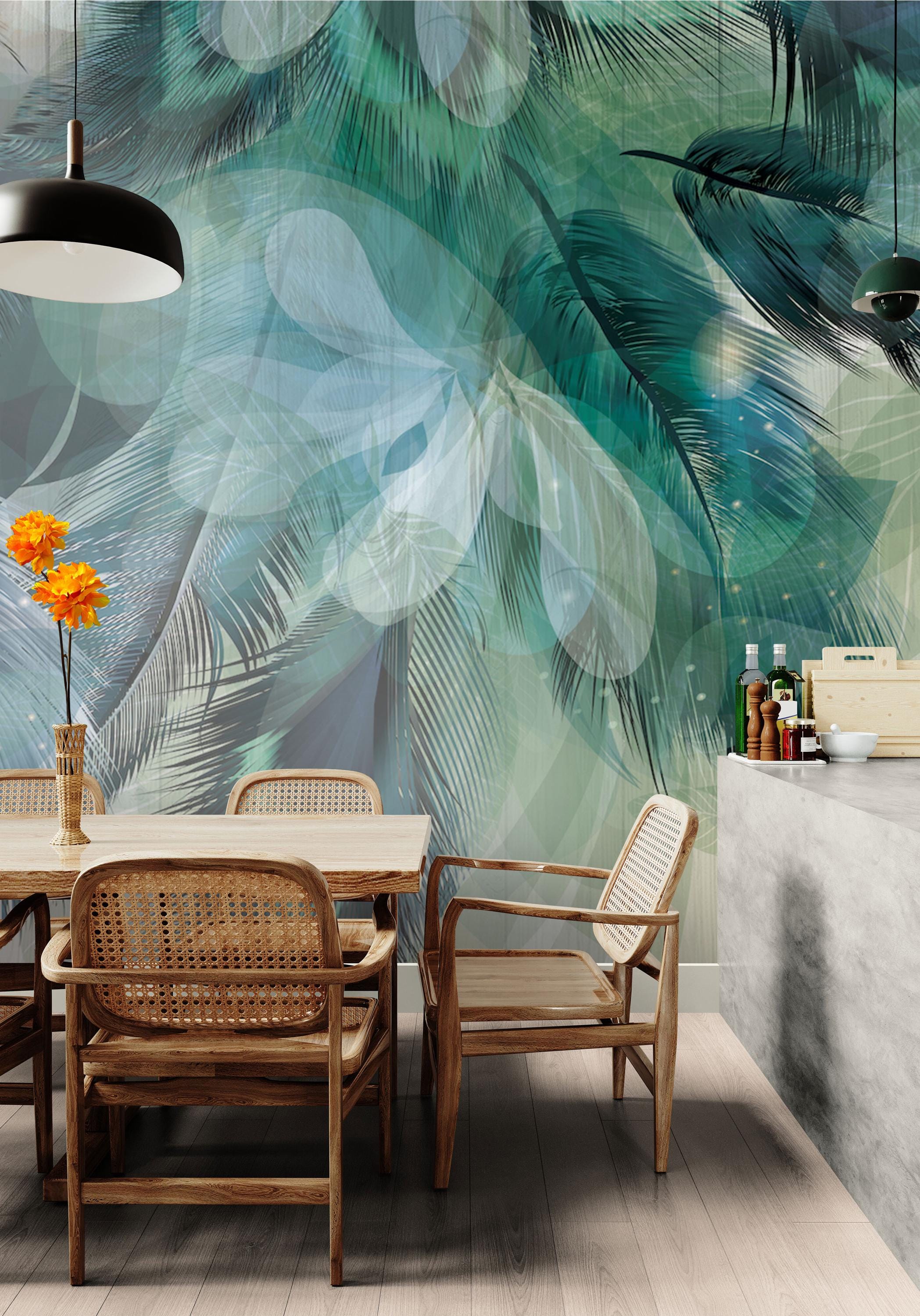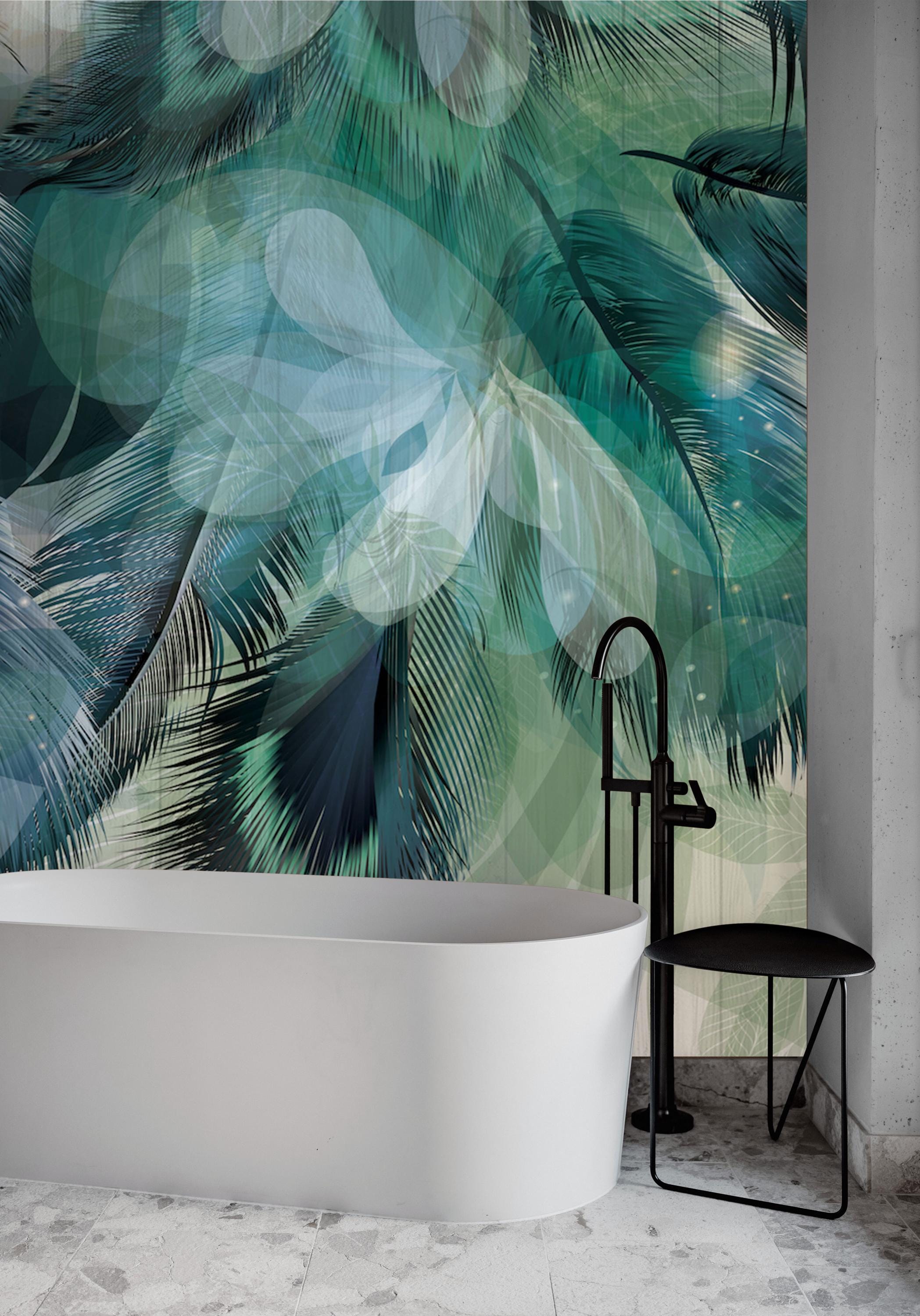 Transform your bathroom or spa with this stunning tropical green feather wallpaper mural. Featuring an abstract blend of palm leaves and layered translucent shapes, this modern wall art adds elegance and a serene jungle feel to any space. Ideal for creating a relaxing atmosphere in bathrooms, powder rooms, or wellness areas.
