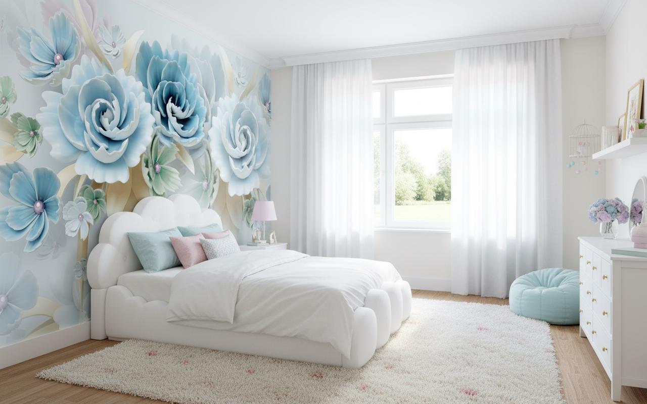 This stunning 3D wallpaper mural features oversized blue and white flowers with pearlescent centers, bringing elegant floral charm to any space. The realistic depth effect and pastel tones add sophistication to your living room, hallway, or office. Printed on high-quality material for smooth application and durability. Available in peel-and-stick options. Color: Blue, White, Soft Green, Beige accents.