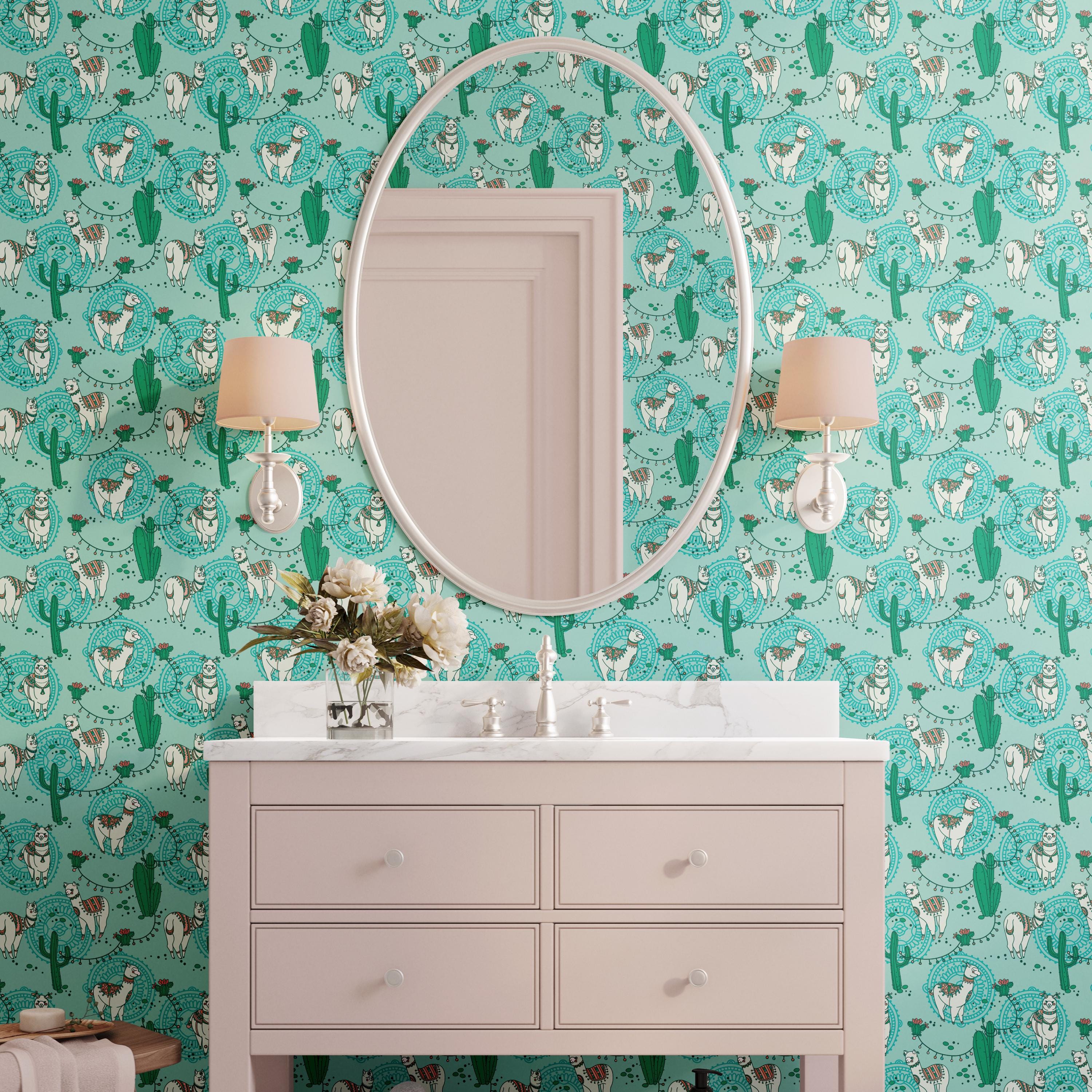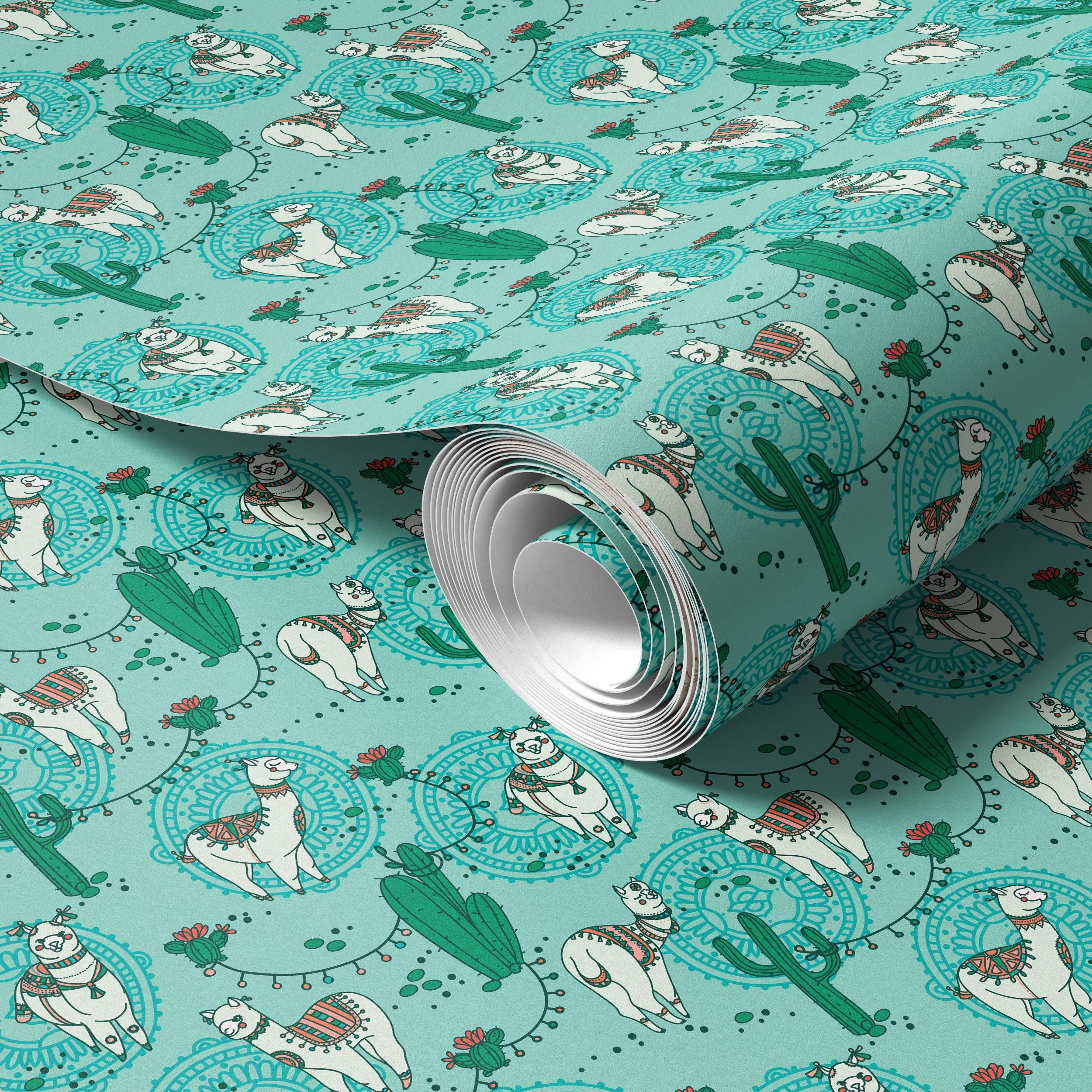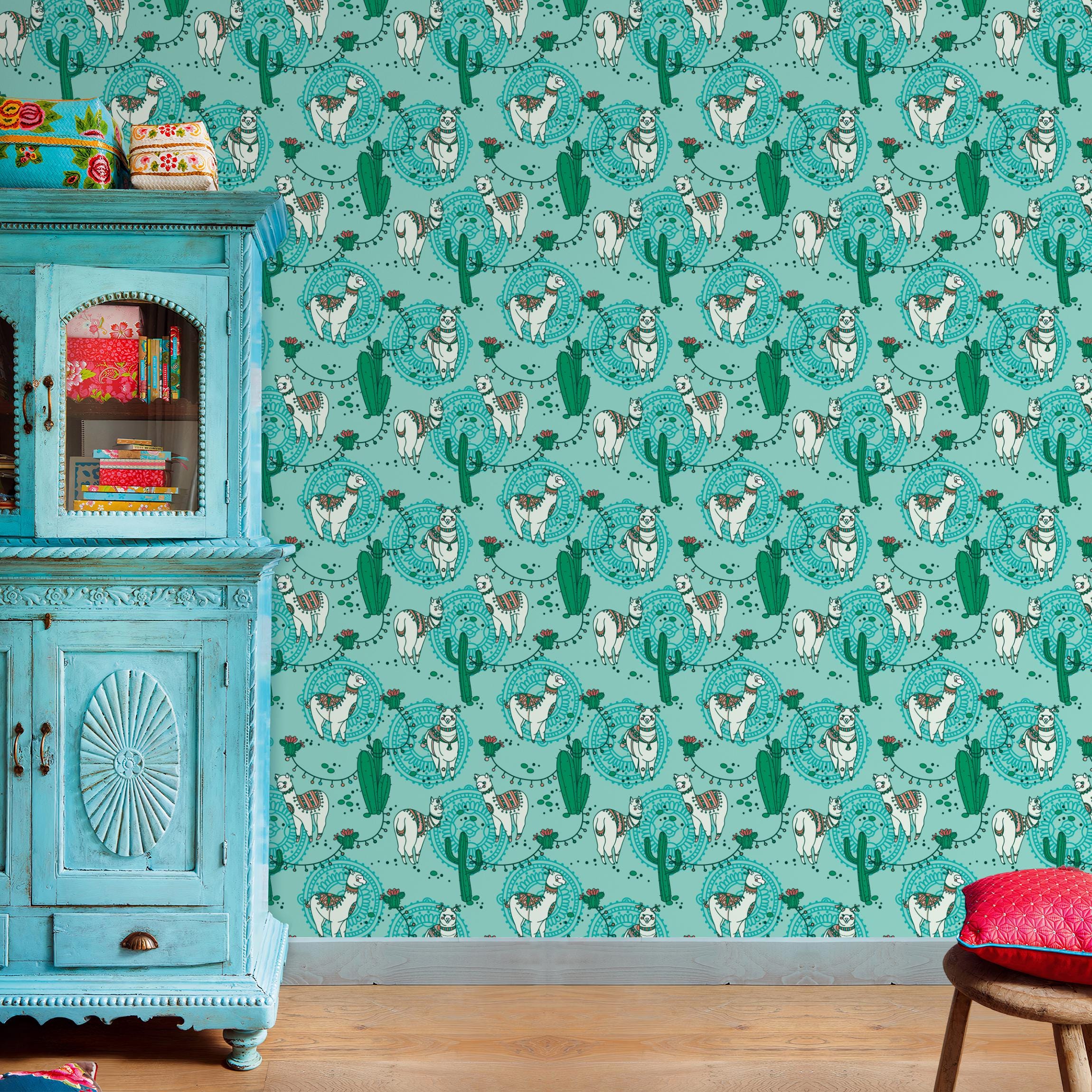 Get ready for a llama-zing accent wall! This wallpaper is full of fun and personality, featuring charming llamas dressed in festive saddles, scattered among stylized cacti and intricate mandala-like patterns. The vibrant teal background makes the whole scene pop, creating a joyful and imaginative atmosphere. It's the perfect choice for bringing a dose of playful, bohemian spirit to a nursery, kid's room, or any eclectic space that loves a bit of Southwestern charm.