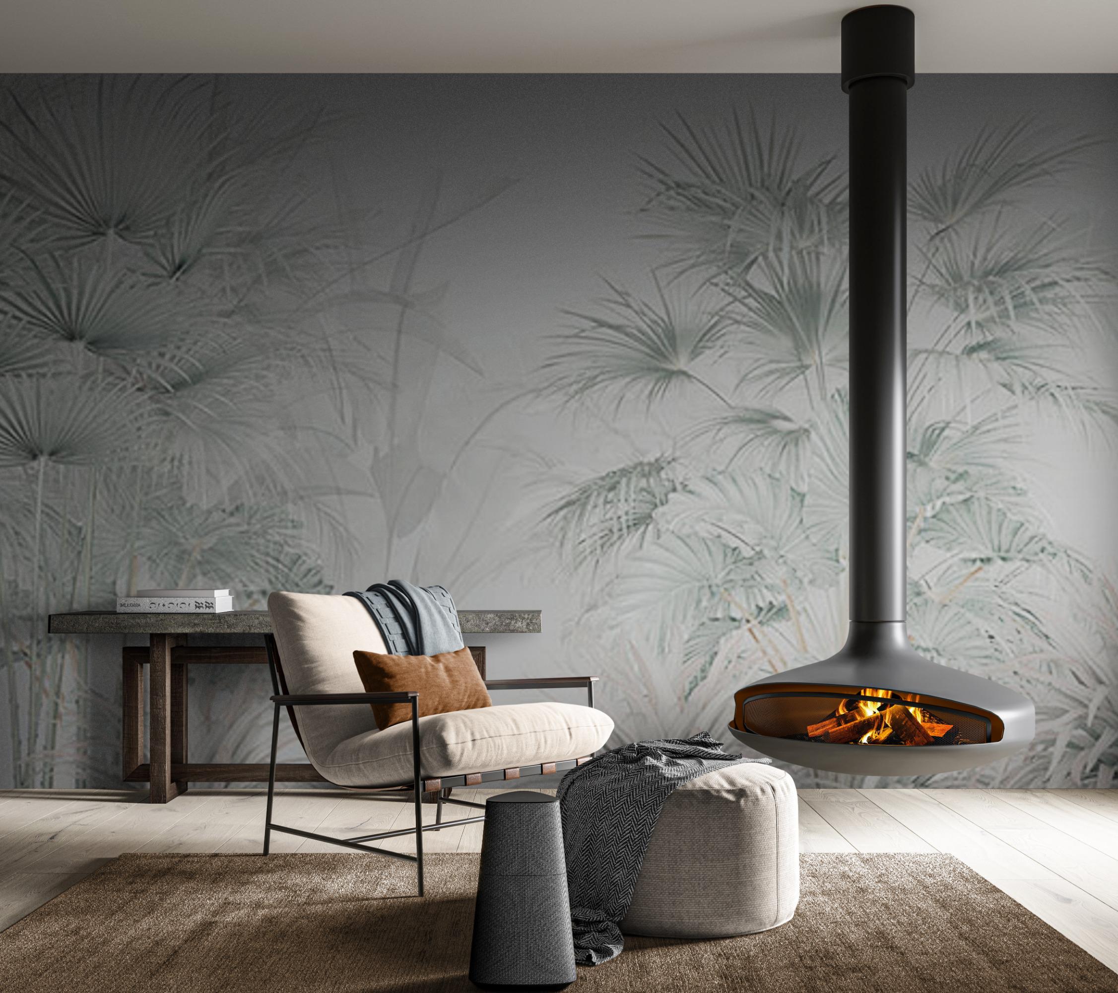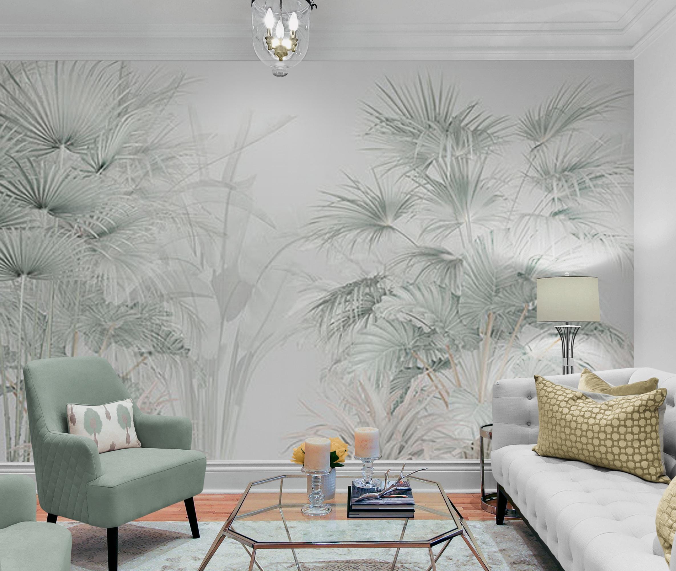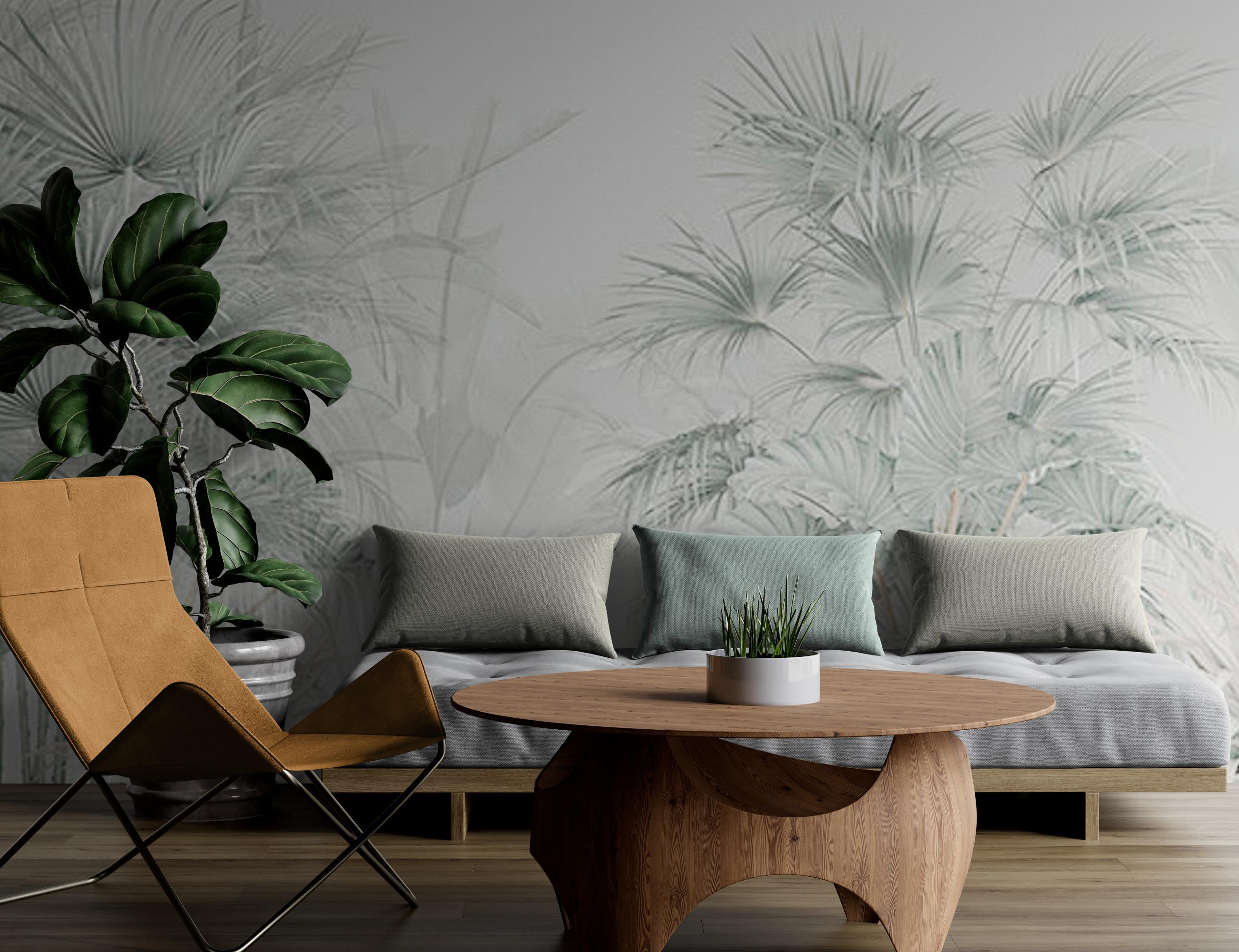 Modern Gray Palm Wallpaper Mural – Minimalist Tropical Leaves Wall Art, Chic Botanical Pattern, Removable Peel & Stick Living Room Decor