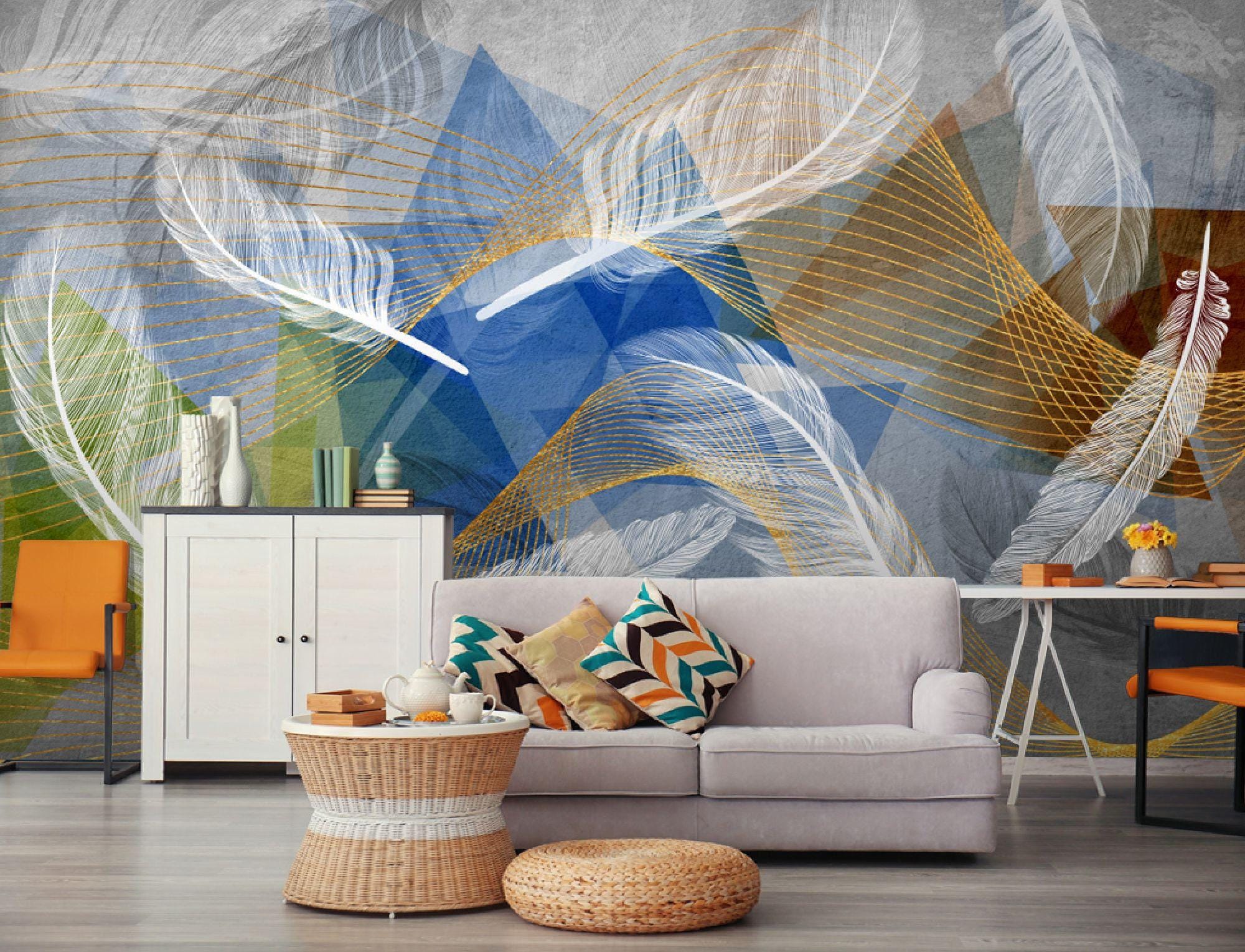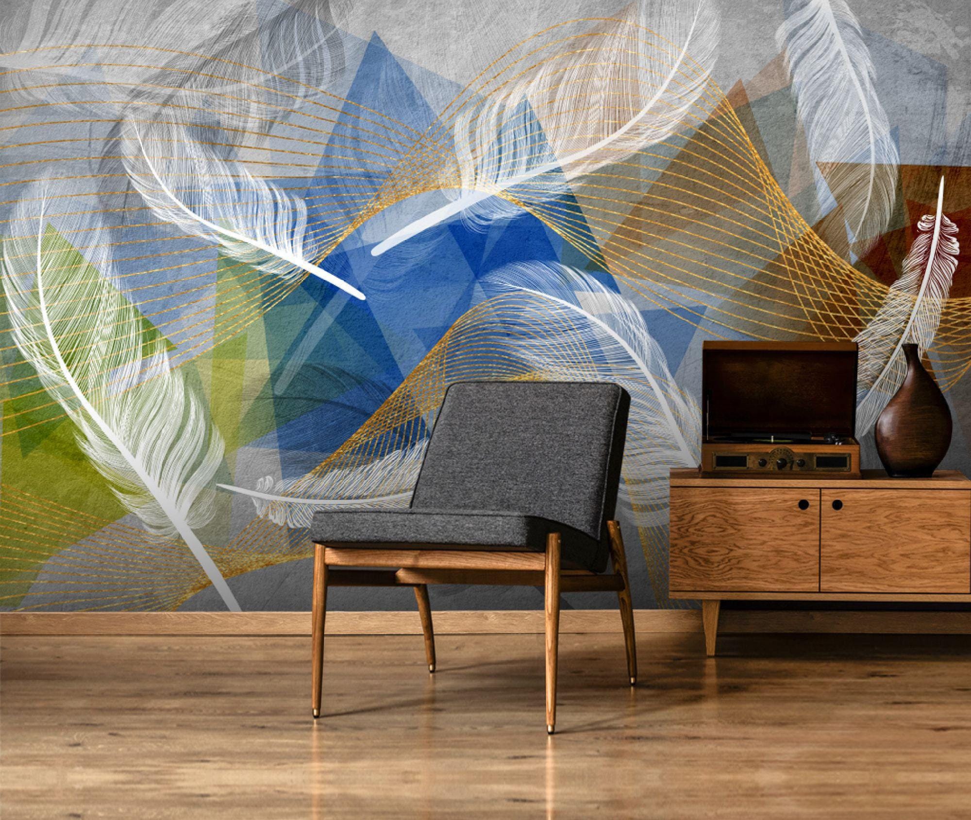 Abstract Feather Geometry Wallpaper – Blue Gold Gray Peel & Stick Mural, Modern Art Accent Wall, Removable Vinyl for Living Room Bedroom
