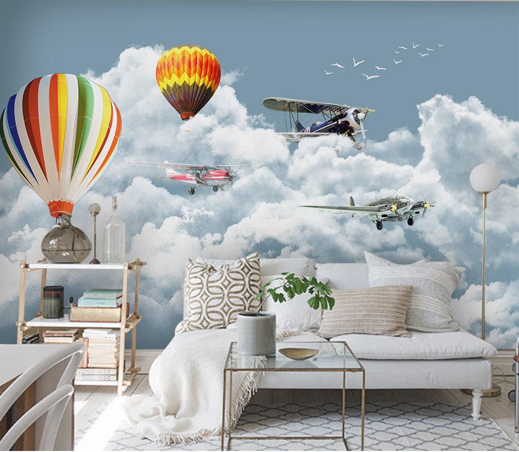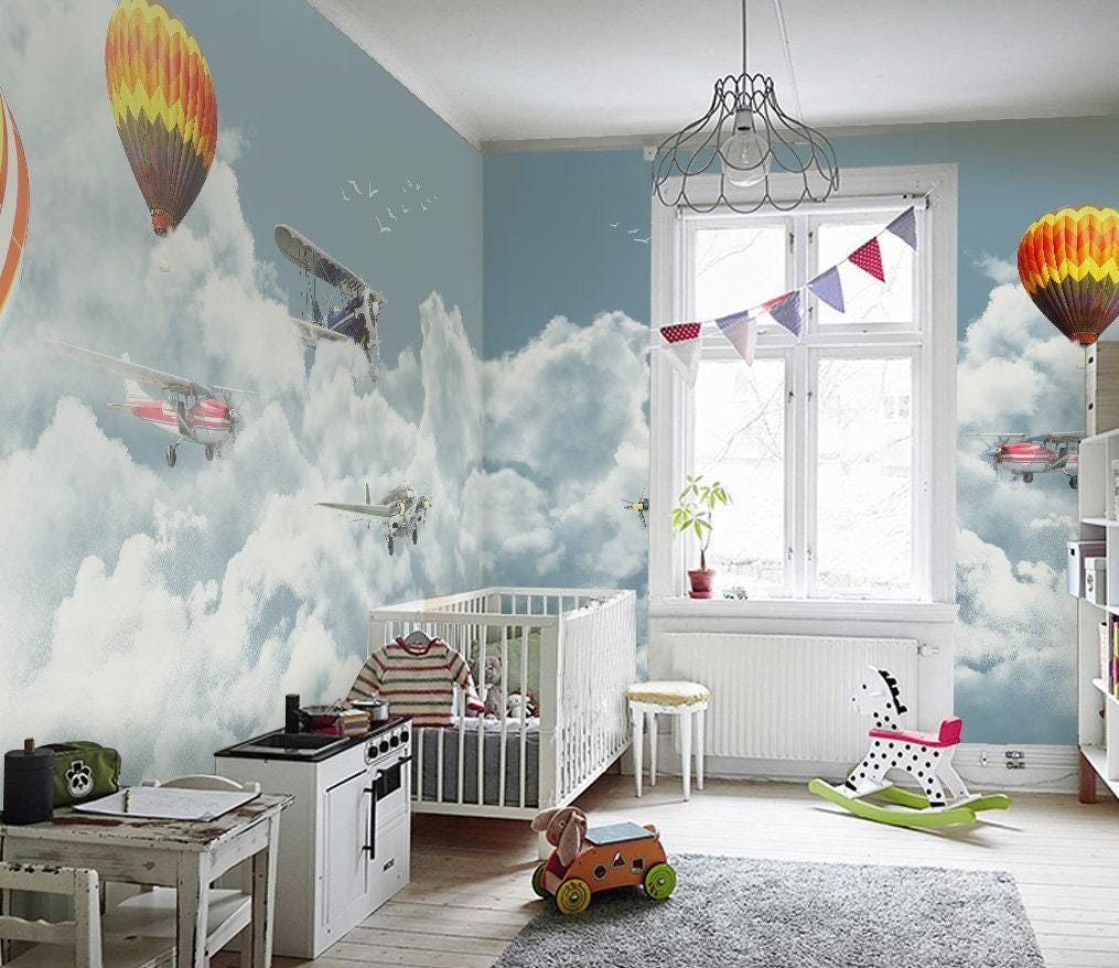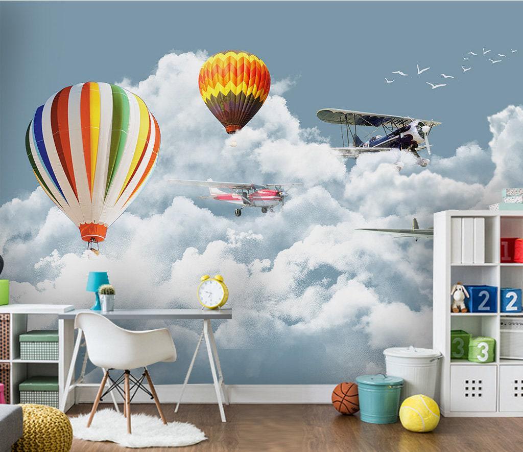 Air Baloon and Plane Kids Room Wallpaper, Nursery Room Wall Mural Modern Home Decoration