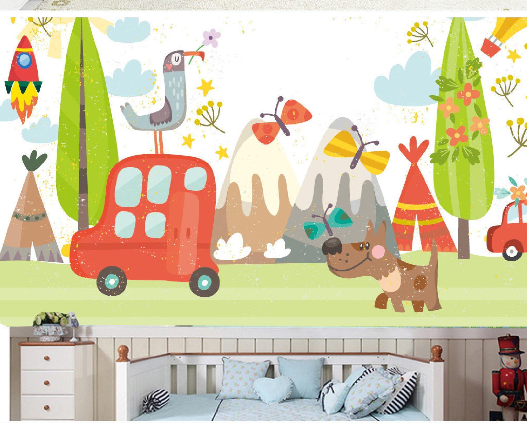 Cartoon Children Room Wallpaper, Nursery Wall Mural, Car, Animals, Air Baloon and Plane, Baby Room Decoration (CR5)