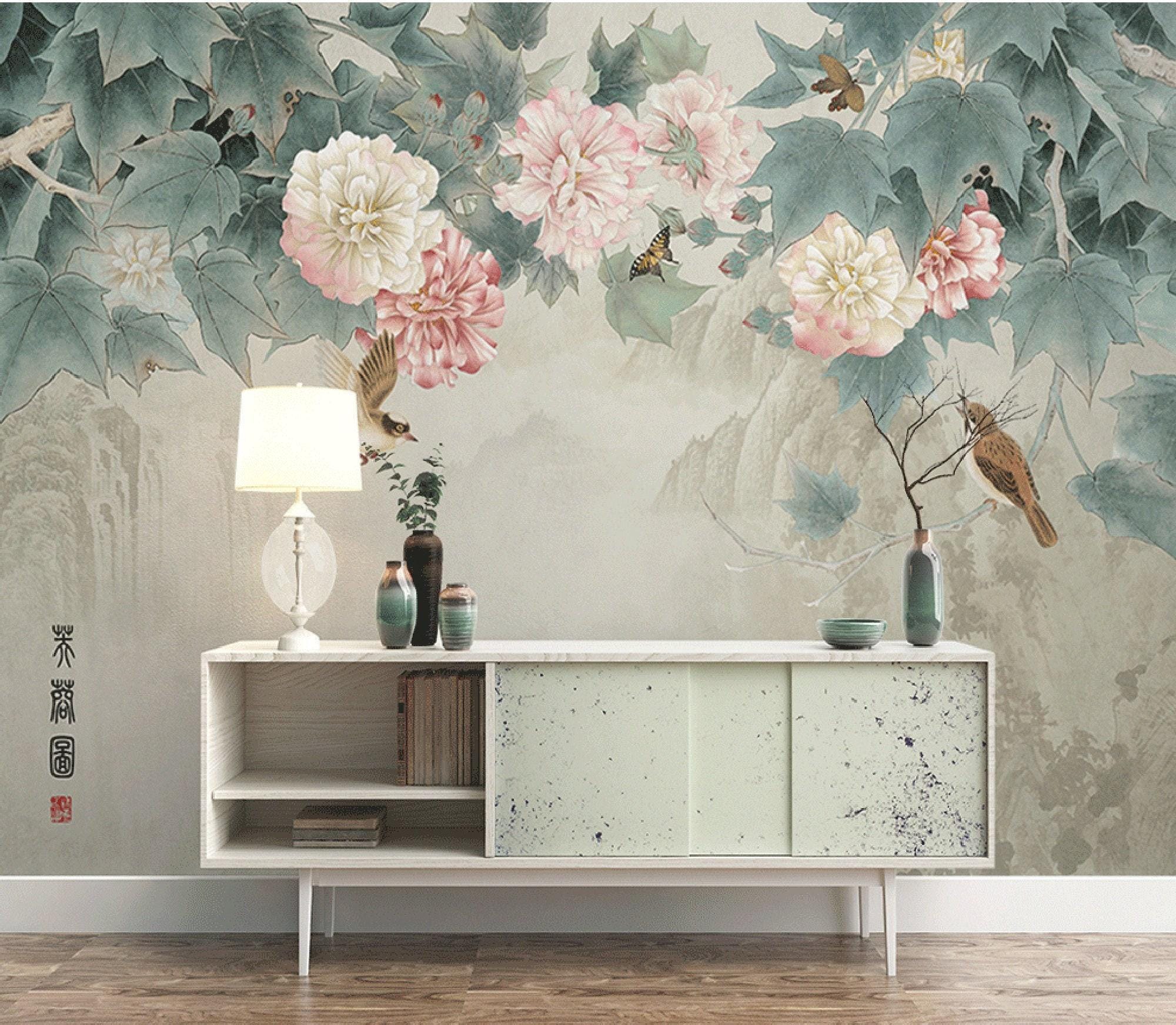 Hibiscus Flower and Bird Wallpaper Floral Wall Mural Modern Home Decor For Living Room Bedroom Entryway Cafe