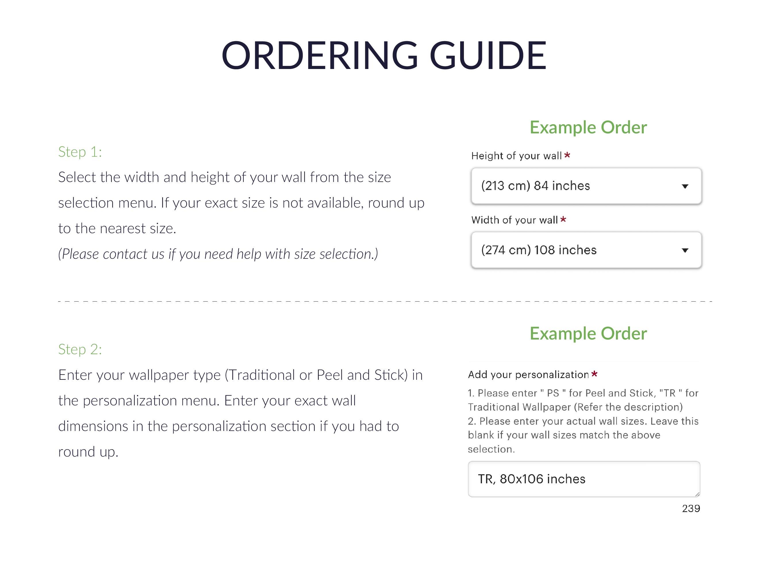 Ordering your wallpaper is easy. Just measure your wall’s height and width, then select the closest matching dimensions from our drop-down menu. Pricing is calculated instantly based on your selection.