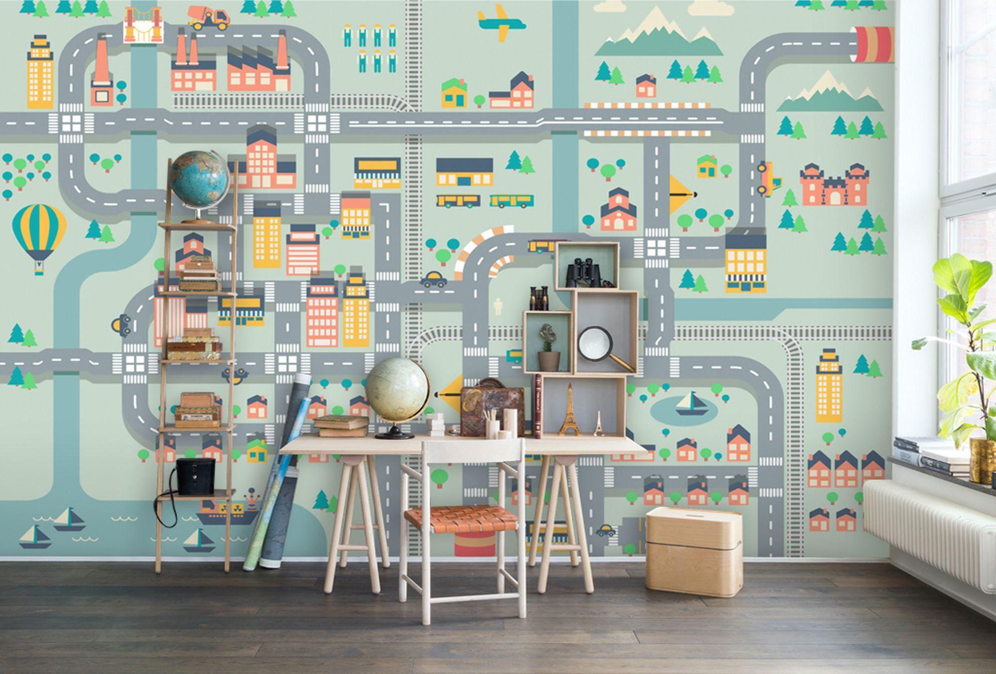 Roadway Cars and Planes Wallpaper Kids Room Cartoon Wall Mural Removable Wallpaper