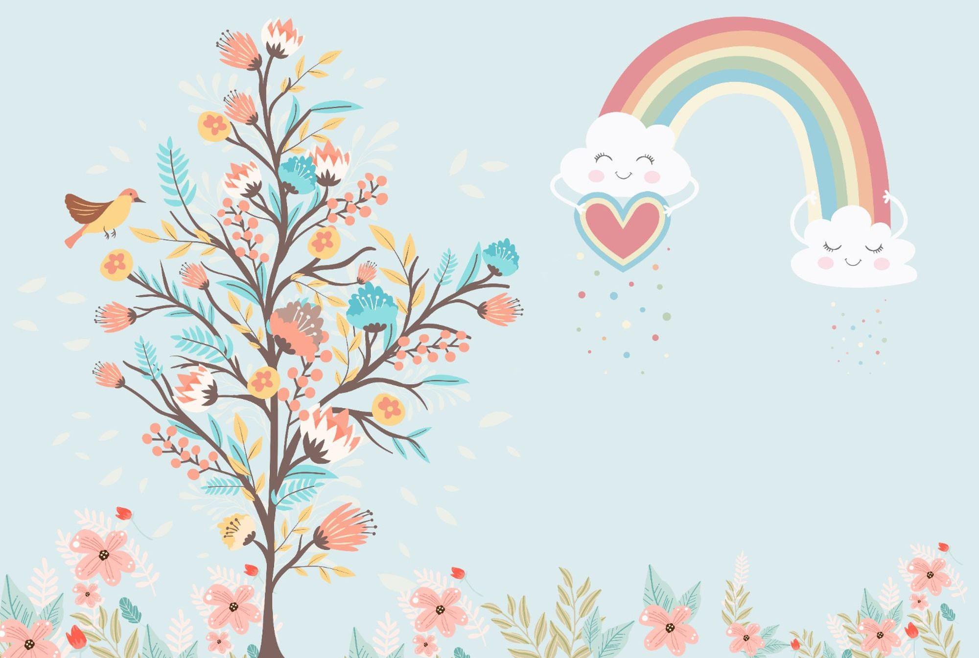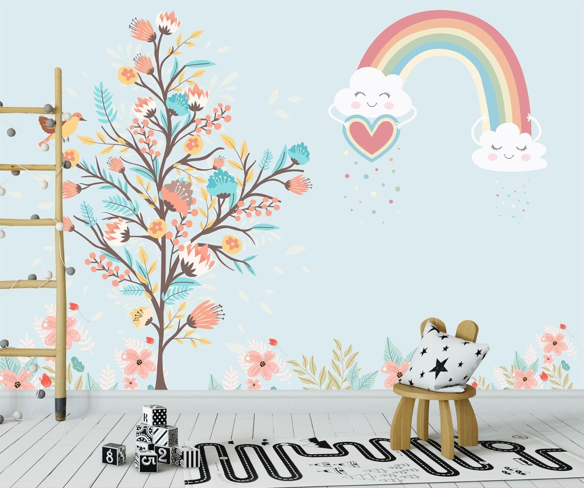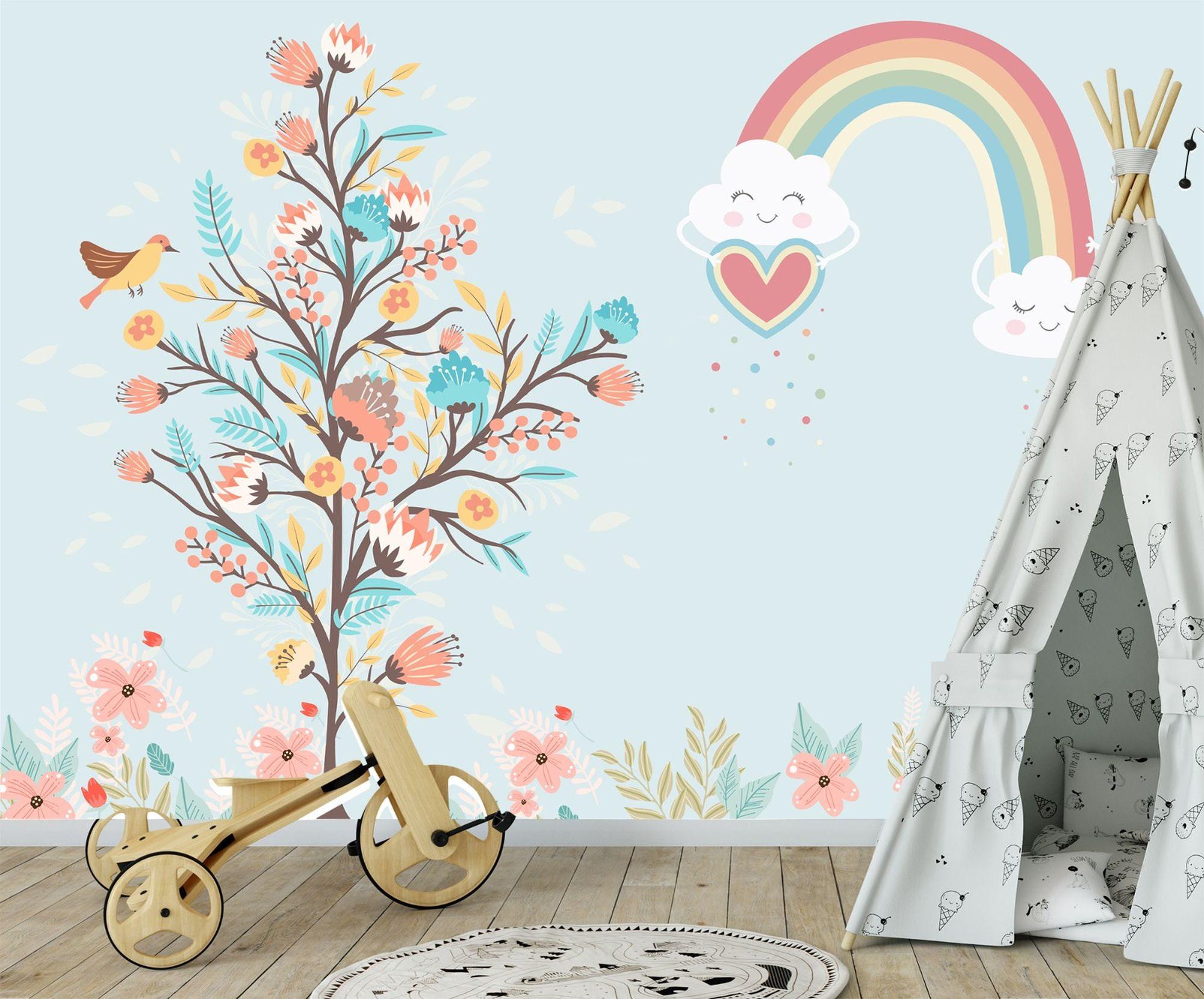 Rainbow Child Room Wallpaper Bird on Tree Cartoon Wall Mural , Nursery Room Wall Mural, Customized Background Color
